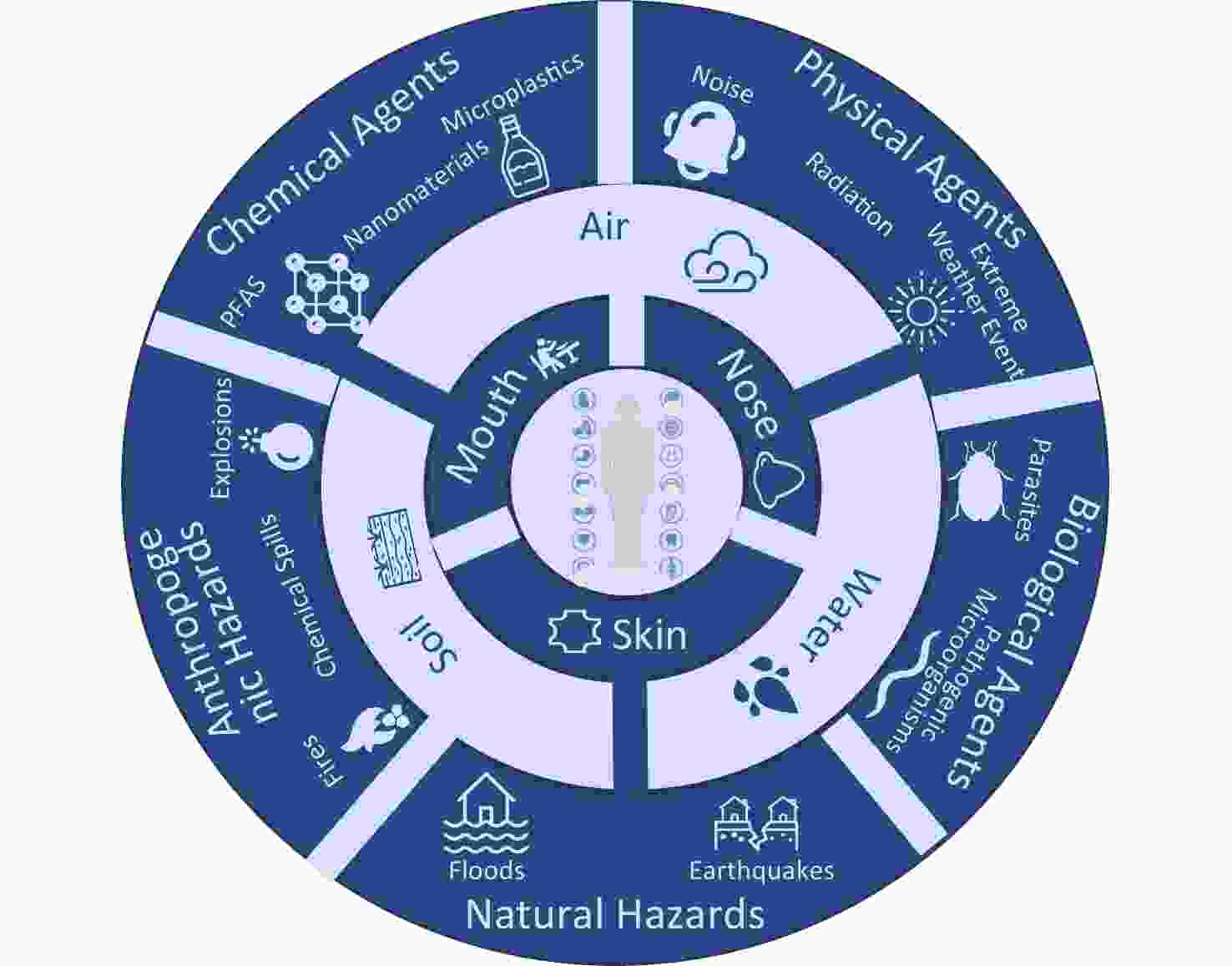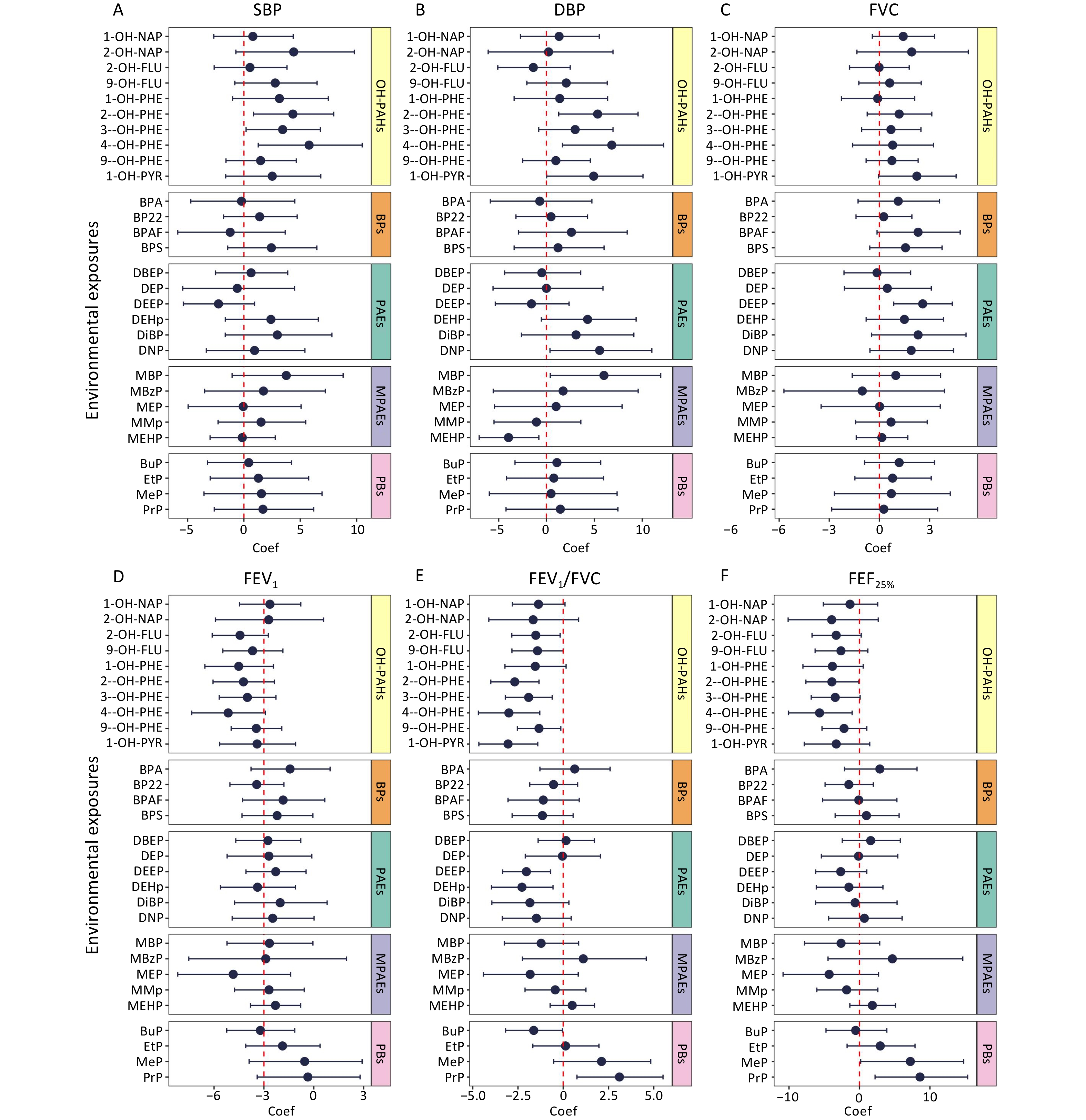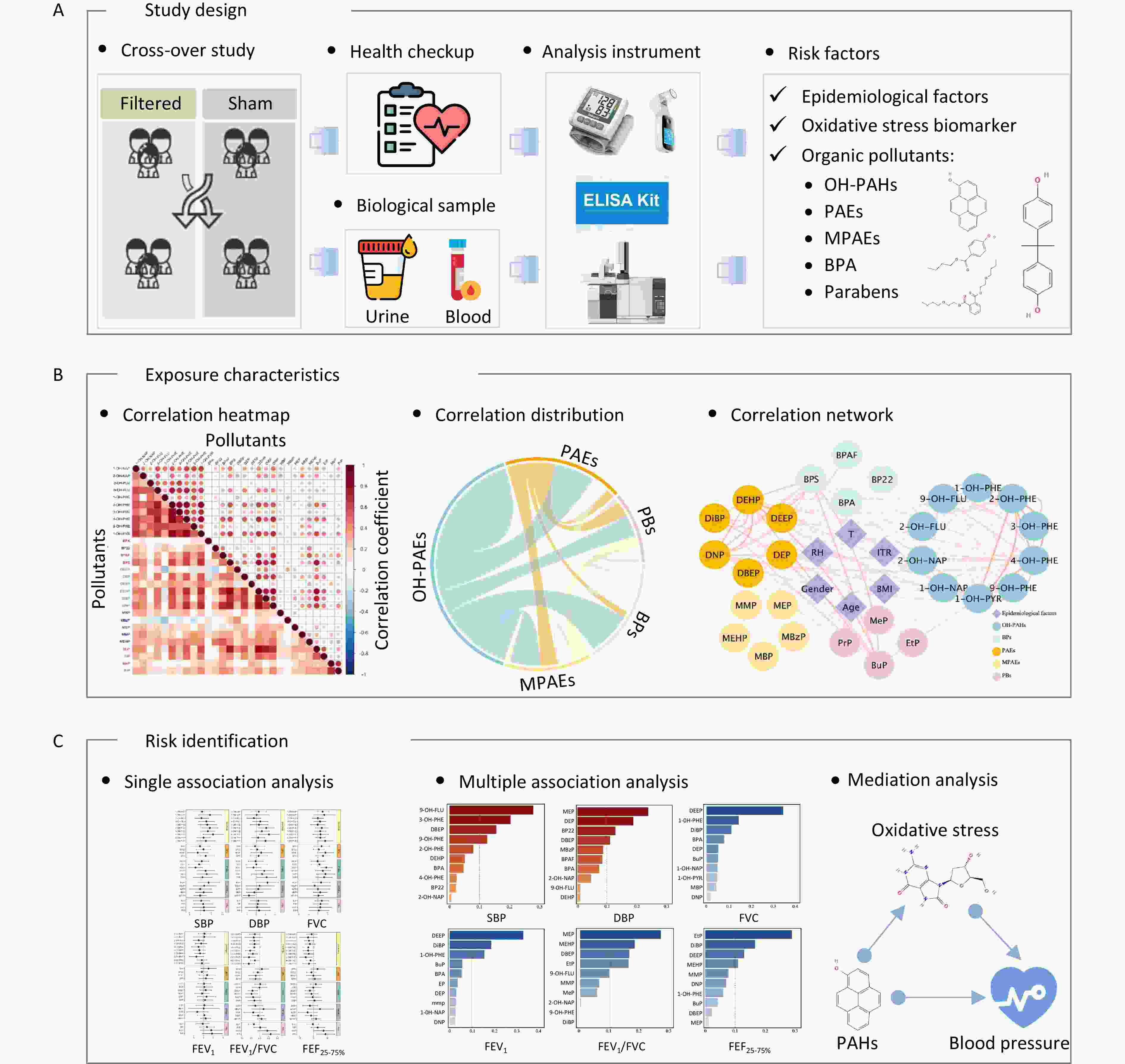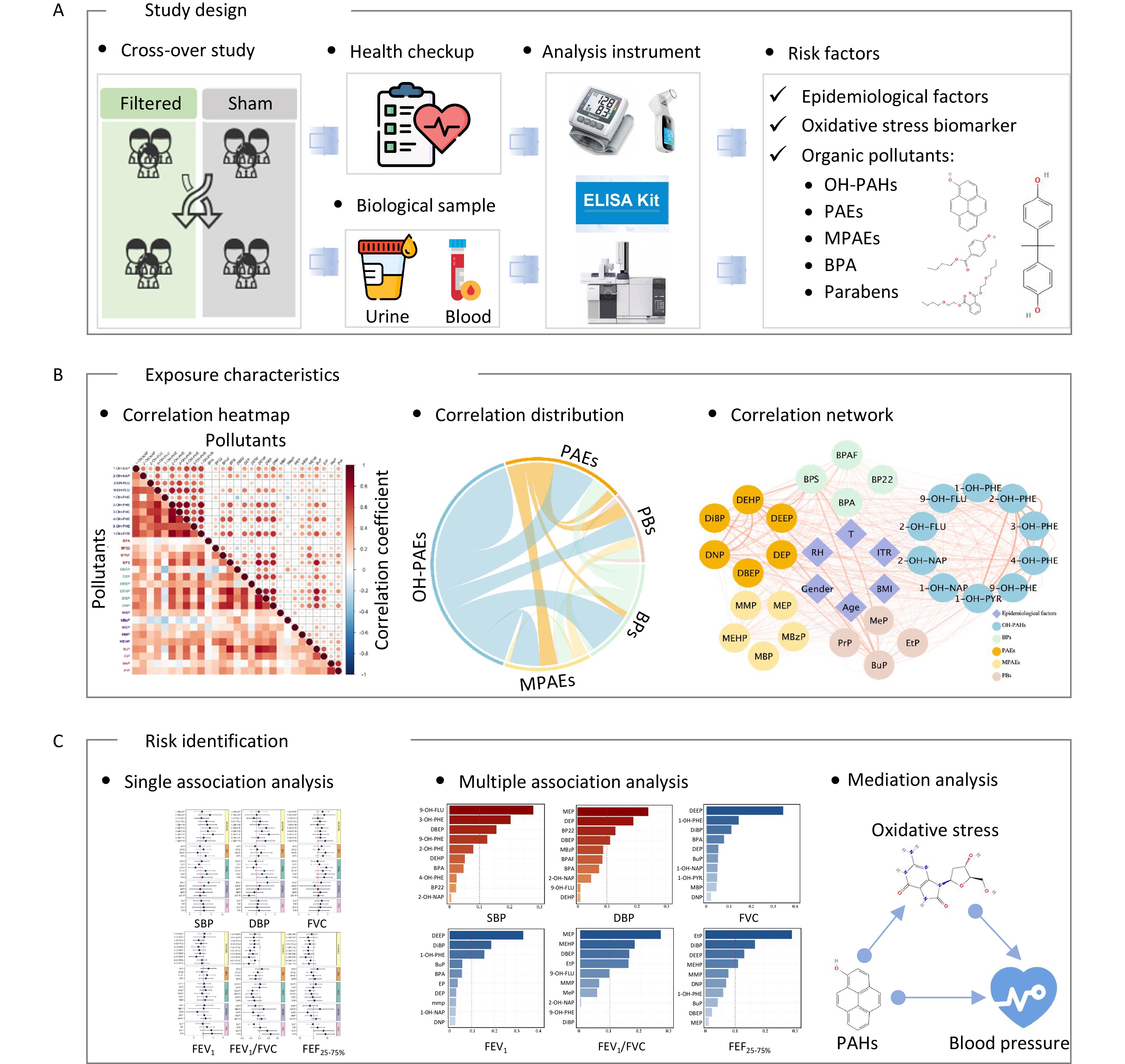 Objective The study aim was to investigate the effects of exposure to multiple environmental organic pollutants on cardiopulmonary health with a focus on the potential mediating role of oxidative stress. Methods A repeated-measures randomized crossover study involving healthy college students in Beijing was conducted. Biological samples, including morning urine and venous blood, were collected to measure concentrations of 29 typical organic pollutants, including hydroxy polycyclic aromatic hydrocarbons (OH-PAHs), bisphenol A and its substitutes, phthalates and their metabolites, parabens, and five biomarkers of oxidative stress. Health assessments included blood pressure measurements and lung function indicators. Results Urinary concentrations of 2-hydroxyphenanthrene (2-OH-PHE) (β = 4.35% [95% confidence interval (CI): 0.85%, 7.97%]), 3-hydroxyphenanthrene (β = 3.44% [95% CI: 0.19%, 6.79%]), and 4-hydroxyphenanthrene (4-OH-PHE) (β = 5.78% [95% CI: 1.27%, 10.5%]) were significantly and positively associated with systolic blood pressure. Exposures to 1-hydroxypyrene (1-OH-PYR) (β = 3.05% [95% CI: −4.66%, −1.41%]), 2-OH-PHE (β = 2.68% [95% CI: −4%, −1.34%]), and 4-OH-PHE (β = 3% [95% CI: −4.68%, −1.29%]) were negatively associated with the ratio of forced expiratory volume in the first second to forced vital capacity. These findings highlight the adverse effects of exposure to multiple pollutants on cardiopulmonary health. Biomarkers of oxidative stress, including 8-hydroxy-2'-deoxyguanosine and extracellular superoxide dismutase, mediated the effects of multiple OH-PAHs on blood pressure and lung function. Conclusion Exposure to multiple organic pollutants can adversely affect cardiopulmonary health. Oxidative stress is a key mediator of the effects of OH-PAHs on blood pressure and lung function.
