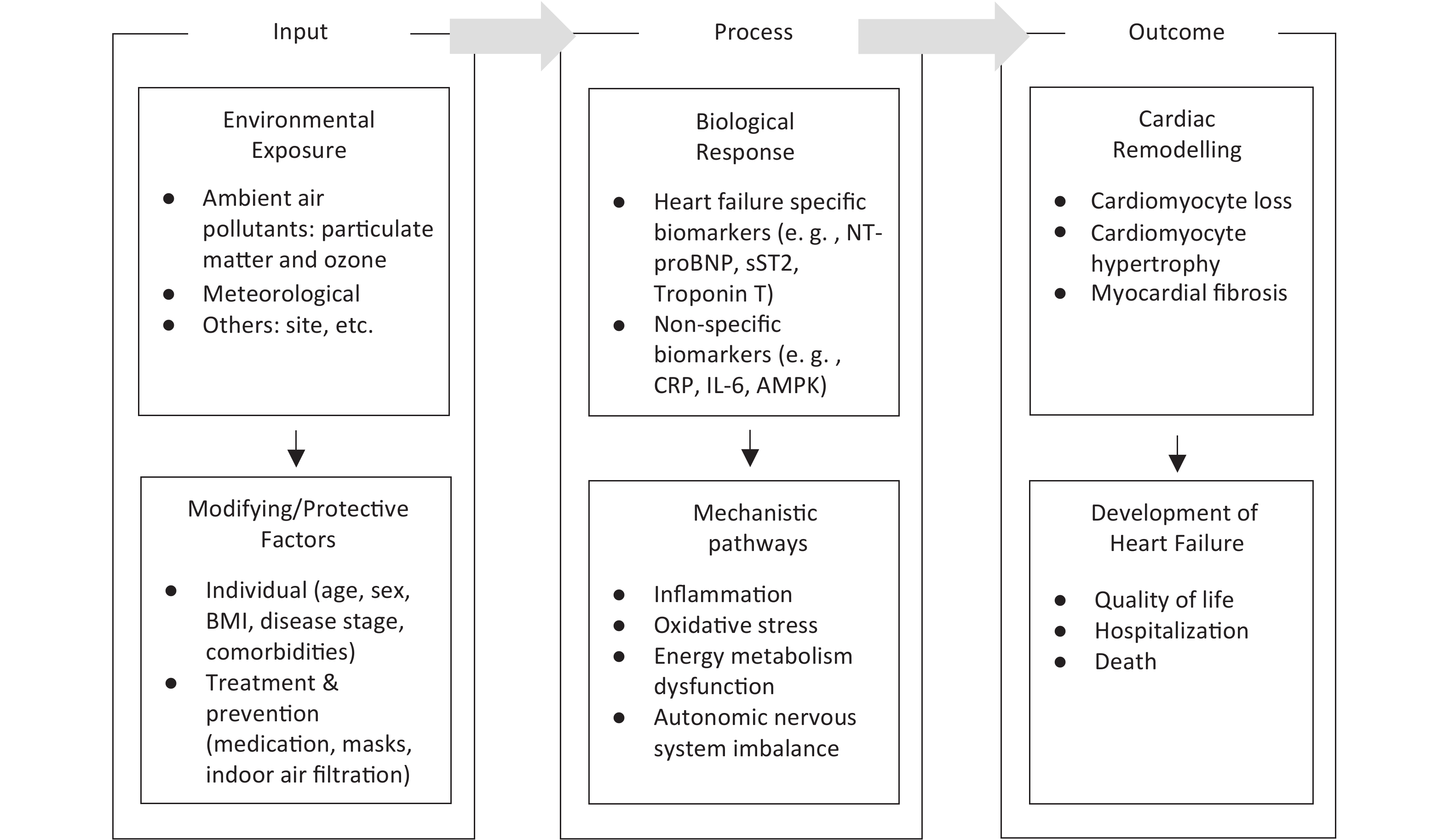 Ambient air pollution is increasingly being recognized as a risk factor for heart failure; however, its effects on cardiac biomarkers remain unclear. This scoping review assessed the existing evidence on the association between air pollution and cardiac biomarkers in heart failure, described the key concepts, synthesized data, and identified research gaps. Following the PRISMA-ScR guidelines, PubMed, Embase, Web of Science, and CNKI databases were searched for studies on air pollution, heart failure, and biomarkers. A total of 765 records were screened, and 81 full texts were assessed for eligibility, resulting in 15 studies. The results showed that the exposure to particulate matter was associated with elevated N-terminal pro-B-type natriuretic peptide and troponin levels. Several studies have linked particulate matter exposure to a higher cardiovascular risk and heart failure biomarkers. Inflammatory and oxidative stress markers were consistently elevated across studies, supporting the biological relevance of these associations. However, few studies have focused specifically on populations with heart failure or clinically relevant biomarkers, and the evidence for gaseous pollutants remains inconclusive. These findings highlight the need to integrate environmental risk assessment into heart failure care and inform policy efforts to reduce the pollution-related cardiovascular burden. Further research should address these gaps through improved exposure assessments and the integration of mechanistic evidence.
