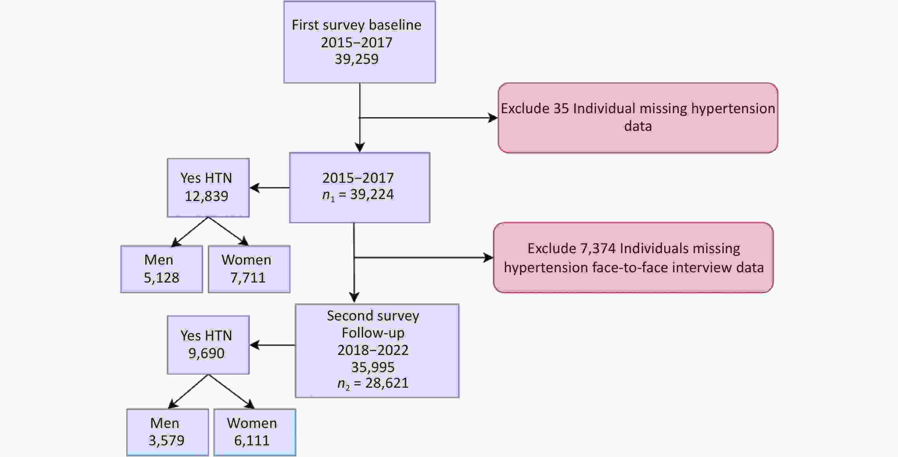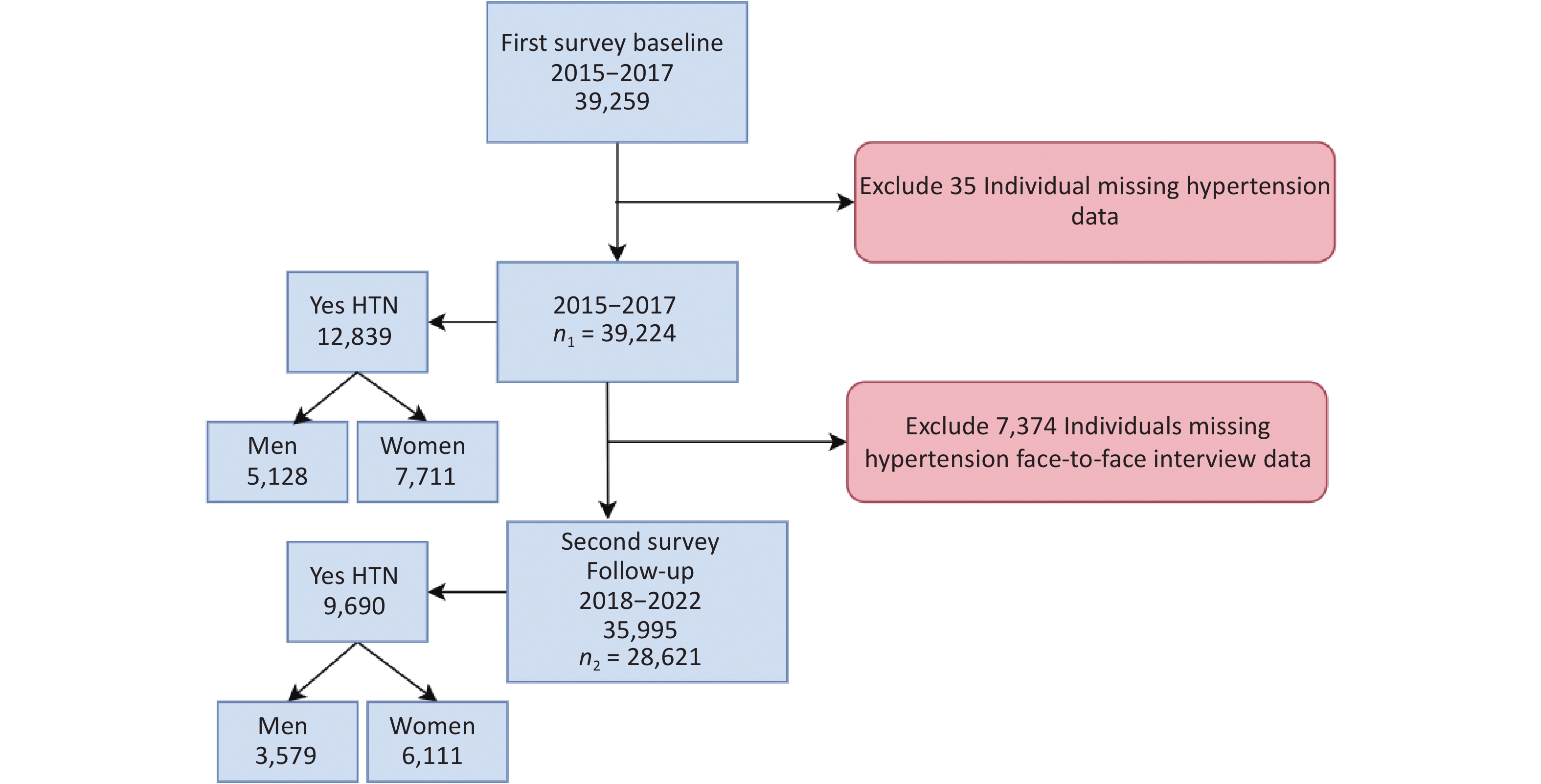 Objective To investigate hypertension (HTN) trends, key risk factors, and gender disparities in rural China, and to propose targeted strategies for improving HTN control in resource-limited settings. Methods This longitudinal study used data from the Henan Rural Cohort Study, including baseline (2015–2017; n = 39,224) and follow-up (2018–2022; n = 28,621) participants. HTN was defined as systolic/diastolic blood pressure ≥ 140/90 mmHg, self-reported diagnosis, or use of antihypertensive medication. Severity was classified using a 7-tier blood pressure (BP) staging system (optimal, normal, high normal, and HTN stages 1–4). A generalized linear mixed-effects model (GLMM) identified associated risk factors. Results HTN prevalence increased modestly from 32.7% (95% CI: 32.2–33.2) to 33.9% (95% CI: 33.3%–34.4%). Awareness and treatment improved from 20.1% to 25.3%, and from 18.8% to 24.4%, respectively, but control rates remained low (6.2% to 12.3%). After adjustment, women had a 1.53-fold higher HTN risk than men (OR = 1.53, 95% CI: 1.43–1.63), revealing gender-specific trends. Key risk factors included alcohol use (OR = 1.37, 95% CI: 1.27–1.47) and overweight status (OR = 1.76, 95% CI: 1.66–1.86). BP staging showed an increase in optimal BP (42.3% to 45.8%), but stagnant management of advanced HTN stages. Conclusion Hypertension in rural China is shaped by behavioral risk factors and healthcare access gaps. Gender-sensitive, community-based interventions, including task-shifting models, are necessary to mitigate the growing burden of hypertension.