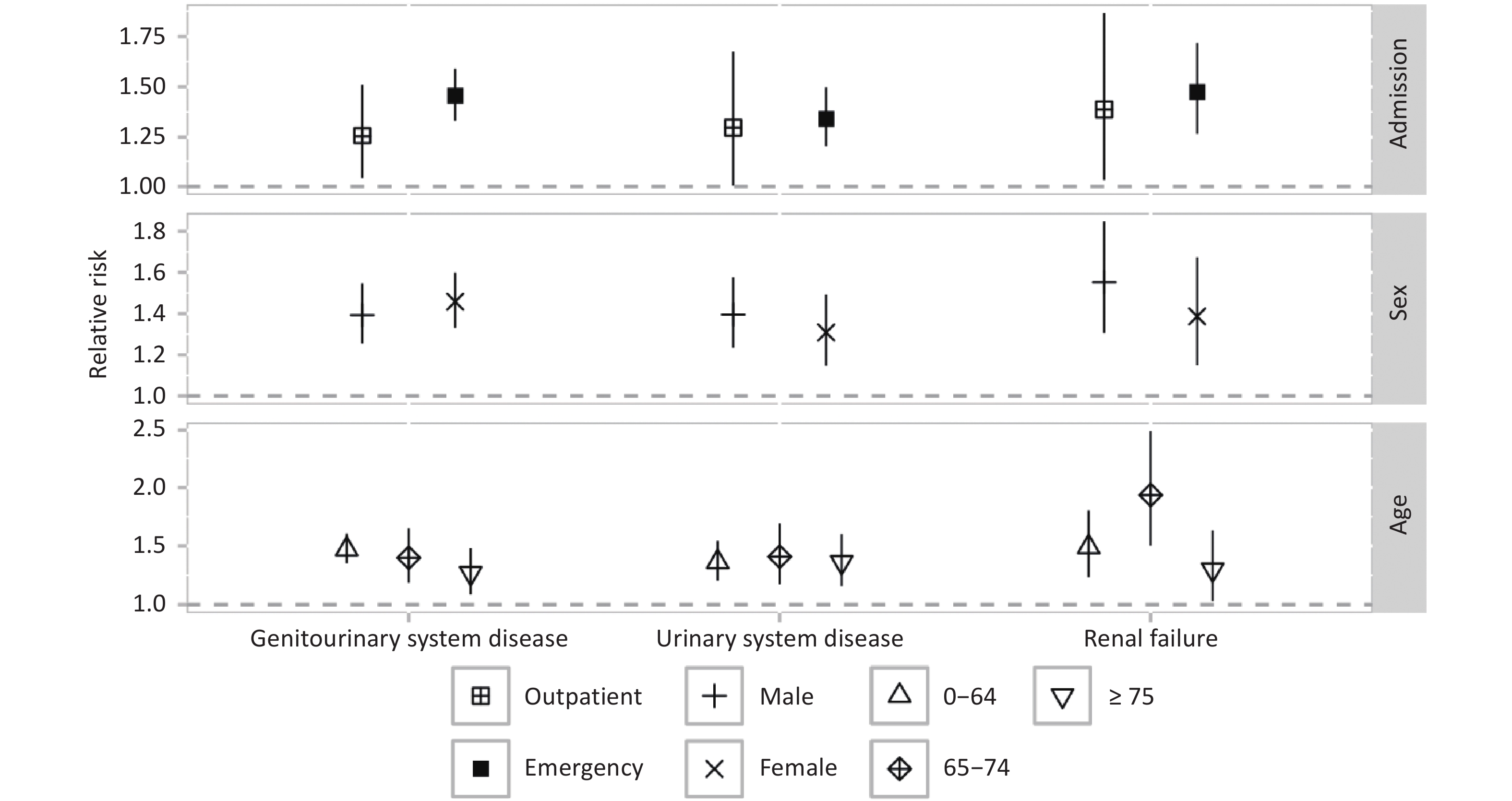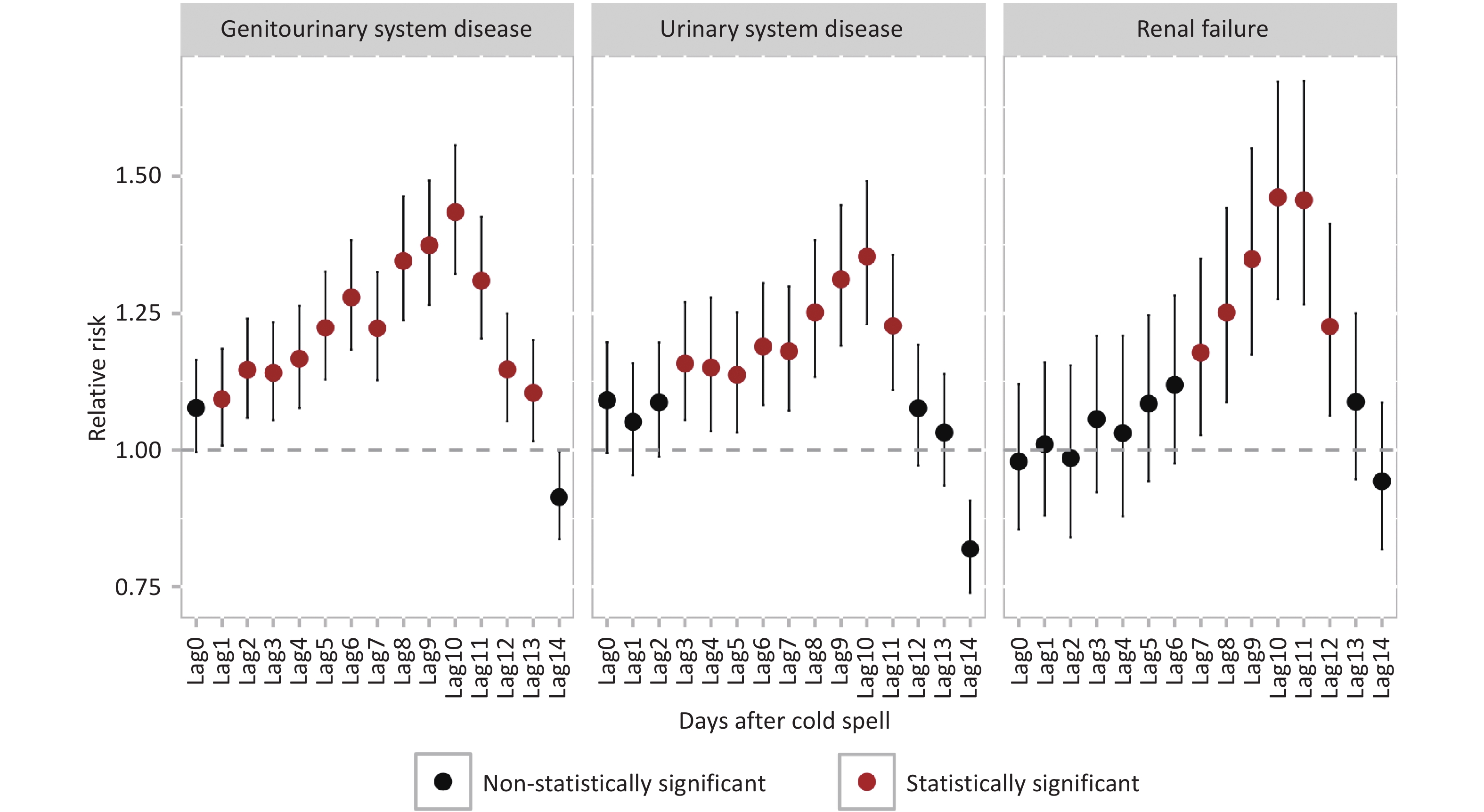 Objective To assess relationships between cold spells and genitourinary hospitalization risk. Methods Hospitalization records for genitourinary system diseases (GUDs) from 16 districts in Beijing (2013–2018) were analyzed. Cold spells were defined based on varying intensity thresholds. A two-stage analytical method was employed: first, generalized linear models assessed district-specific associations between cold spells and hospitalizations; second, random-effects meta-analysis aggregated the district-level results. Subgroup analyses were performed by admission type (emergency vs. outpatient), age, and sex. Results A total of 271,579 GUD-related hospitalizations were recorded. Cold spells (p1day2, daily mean temperature below the 1st percentiles of the daily mean temperature distribution from January 1, 2013, to December 31, 2018, lasting for two or more consecutive days) were linked to a significant rise in hospitalization risks: 1.43 (95% CI: 1.32–1.56) for all GUDs, 1.35 (95% CI: 1.23–1.49) for urinary system diseases, and 1.46 (95% CI: 1.28–1.67) for renal failure, when compared to non-cold spell days. Emergency admissions showed higher risk increases than outpatient admissions. Conclusion Extreme cold spells significantly elevate hospitalization risks for GUDs. This highlights the urgent need for targeted public health interventions to mitigate cold-related health impacts, especially for vulnerable populations.