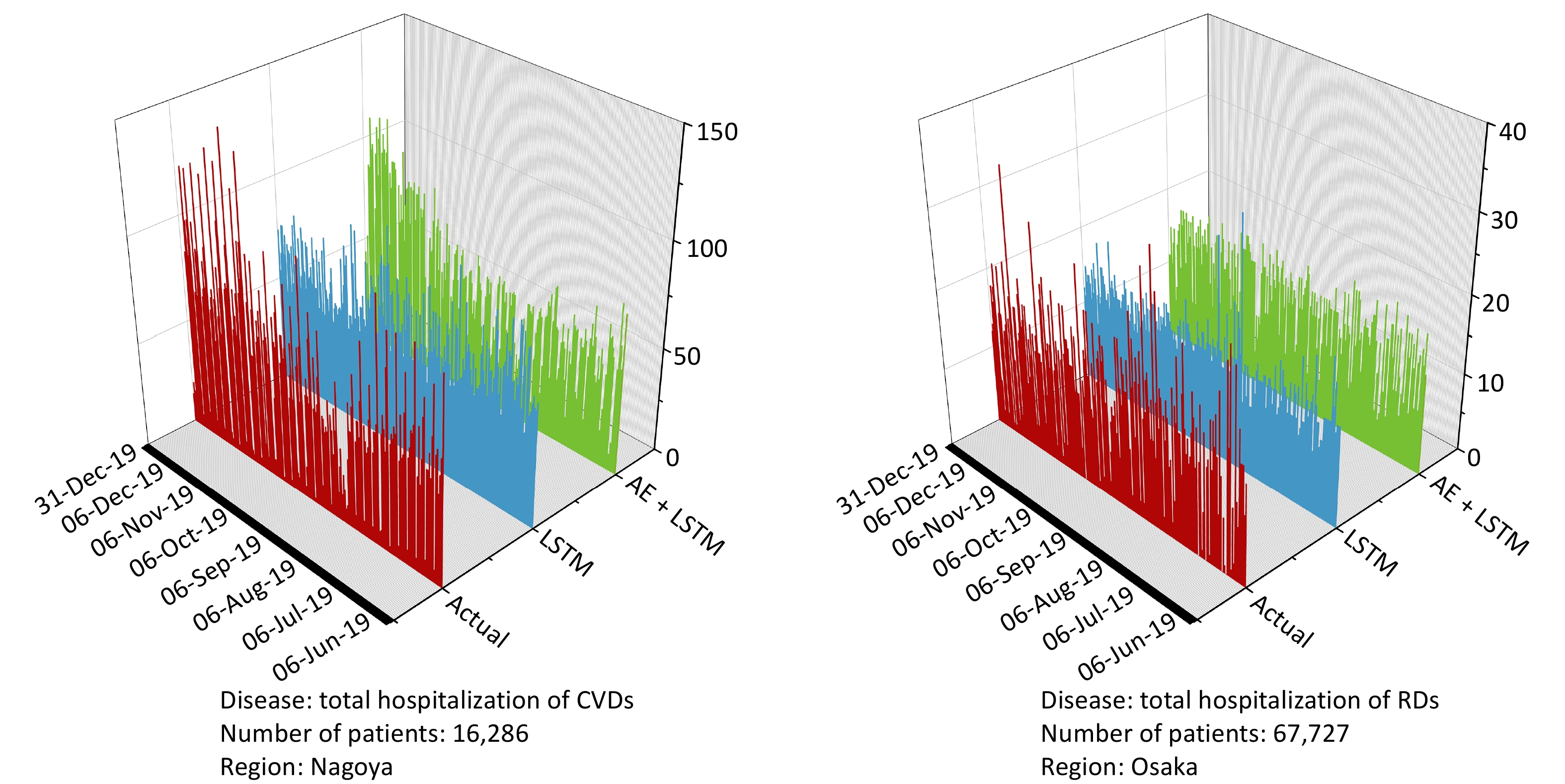 Objective To assess the short-term lag effects of climate and air pollution on hospital admissions for cardiovascular and respiratory diseases, and to develop deep learning-based models for daily hospital admission prediction. Methods A multi-city study was conducted in Tokyo’s 23 wards, Osaka City, and Nagoya City. Random forest models were employed to assess the synergistic short-term lag effects (lag0, lag3, and lag7) of climate and air pollutants on hospitalization for five cardiovascular diseases (CVDs) and two respiratory diseases (RDs). Furthermore, we developed hybrid deep learning models that integrated an autoencoder (AE) with a Long Short-Term Memory network (AE+LSTM) to predict daily hospital admissions. Results On the day of exposure (lag0), air pollutants, particularly nitrogen oxides (NOx), exhibited the strongest influence on hospital admissions for CVD and RD, with pronounced effects observed for hypertension (I10–I15), ischemic heart disease (I20), arterial and capillary diseases (I70–I79), and lower respiratory infections (J20–J22 and J40–J47). At longer lags (lag3 and lag7), temperature and precipitation were more influential predictors. The AE+LSTM model outperformed the standard LSTM, improving the prediction accuracy by 32.4% for RD in Osaka and 20.94% for CVD in Nagoya. Conclusion Our findings reveal the dynamic, time-varying health risks associated with environmental exposure and demonstrate the utility of deep learnings in predicting short-term hospital admissions. This framework can inform early warning systems, enhance healthcare resource allocation, and support climate-adaptive public health strategies.