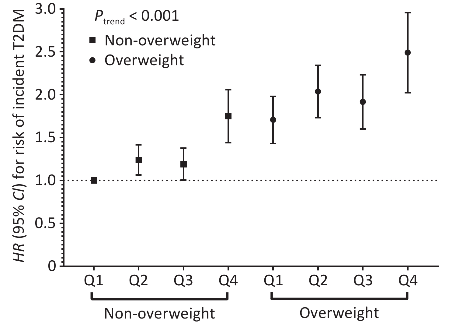 Objective To investigate the association between long-term exposure to ambient fine particulate matter (PM2.5) and its constituents and the risk of incident type 2 diabetes mellitus (T2DM), and to examine the modification roles of overweight status. Methods This prospective study included 27,507 adults living in rural China. The annual mean residential exposure to PM2.5 and its constituents was estimated using a satellite-based statistical model. Cox models were used to estimate the risk of T2DM associated with PM2.5 and its constituents. Stratified analysis quantified the role of overweight status in the association between PM2.5 constituents and T2DM. Results Over a median follow-up of 9.4 years, 3,001 new T2DM cases were identified. The hazard ratio (HR) for a 10 μg/m3 increase in ambient PM2.5 was 1.30 (95% confidence interval [CI]: 1.17, 1.45). Among the constituents, the strongest association was observed with black carbon. Being overweight significantly modified the association between certain constituents and the risk of T2DM. Participants who were overweight and exposed to the highest quartile of PM2.5 constituents had the highest risk of T2DM (HR: 2.46, 95% CI: 2.04, 2.97). Conclusions Our findings indicate that PM2.5 was associated with an increased risk of T2DM, with black carbon potentially being the primary contributor. Being overweight appeared to enhance the association between PM2.5 and T2DM. This suggests that controlling both PM2.5 exposure and overweight status may reduce the burden of T2DM.
