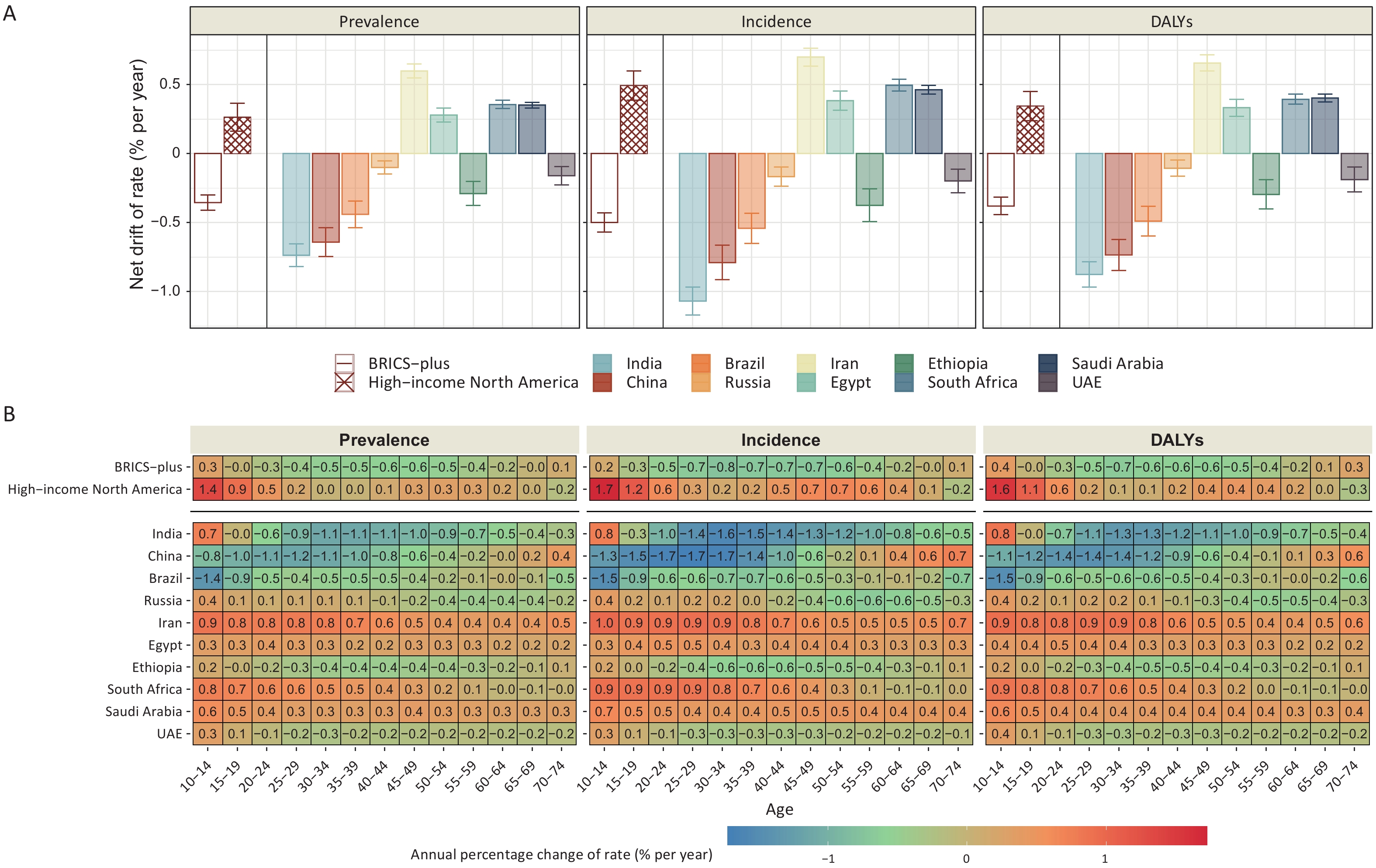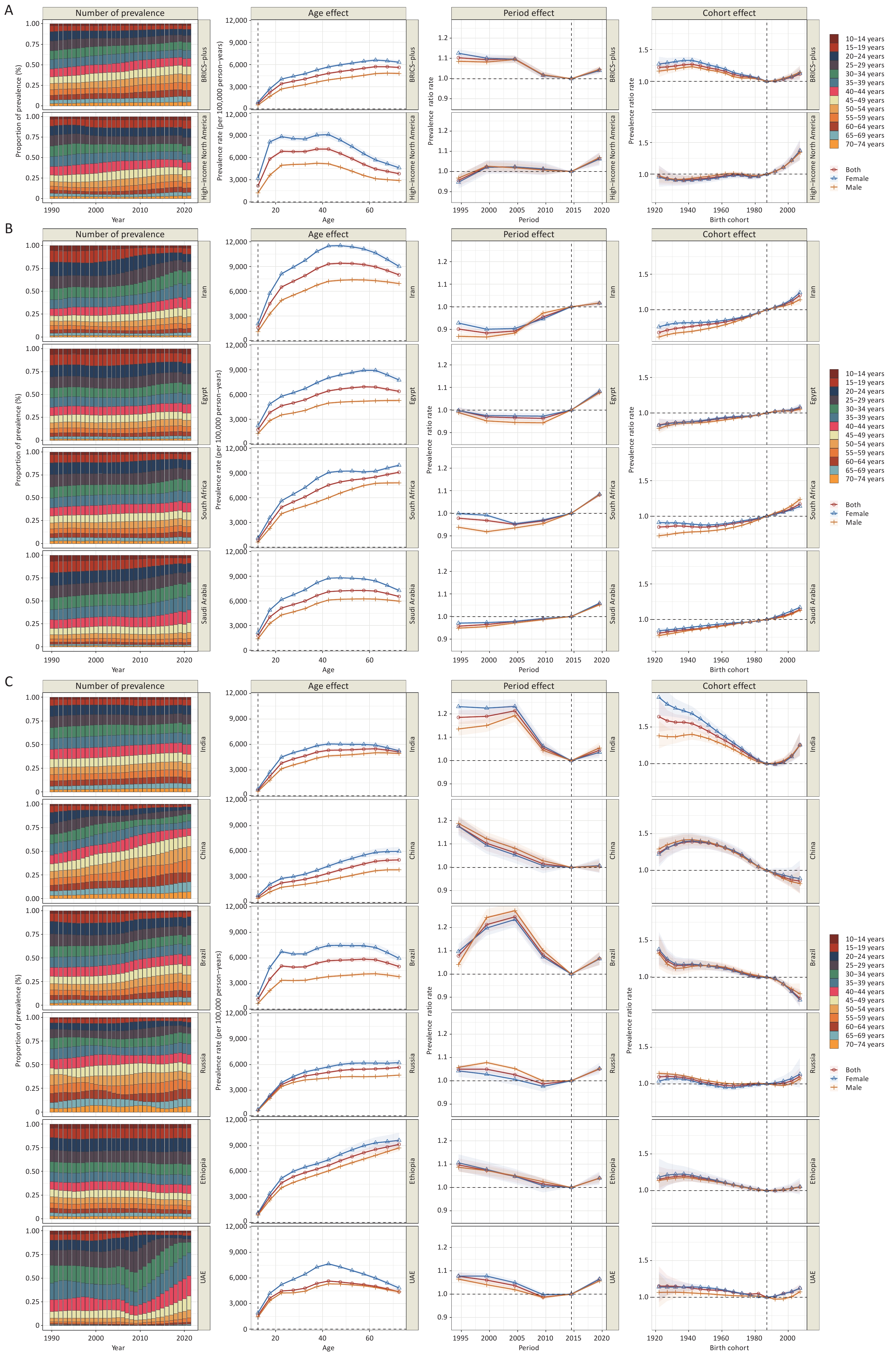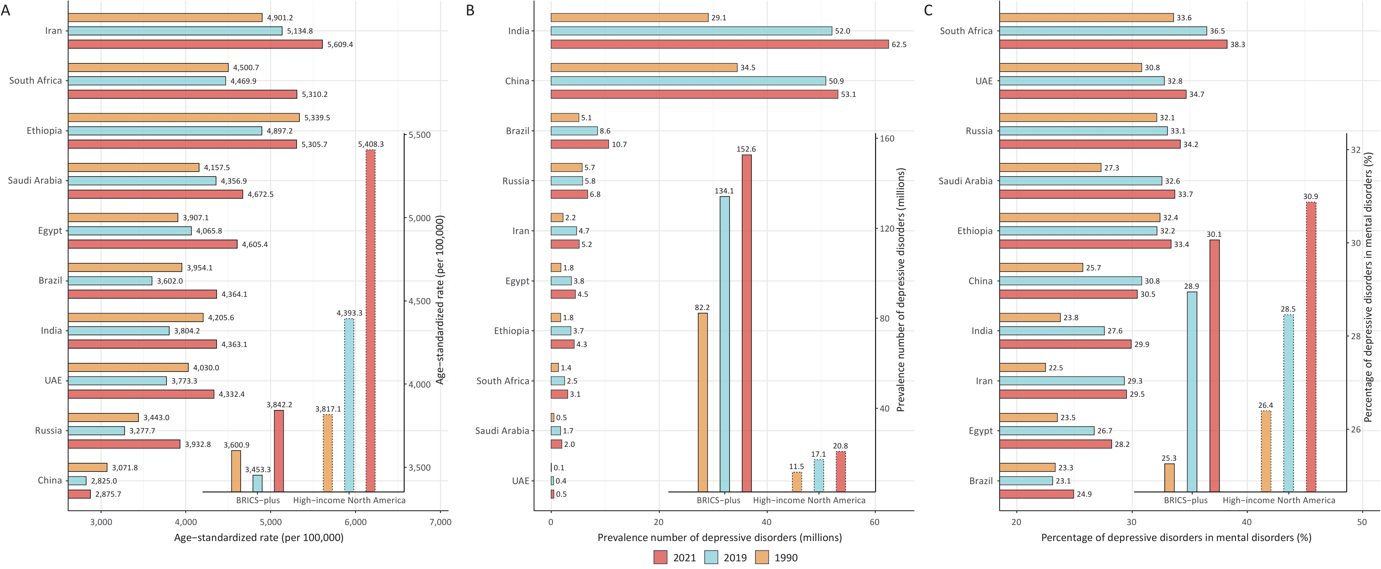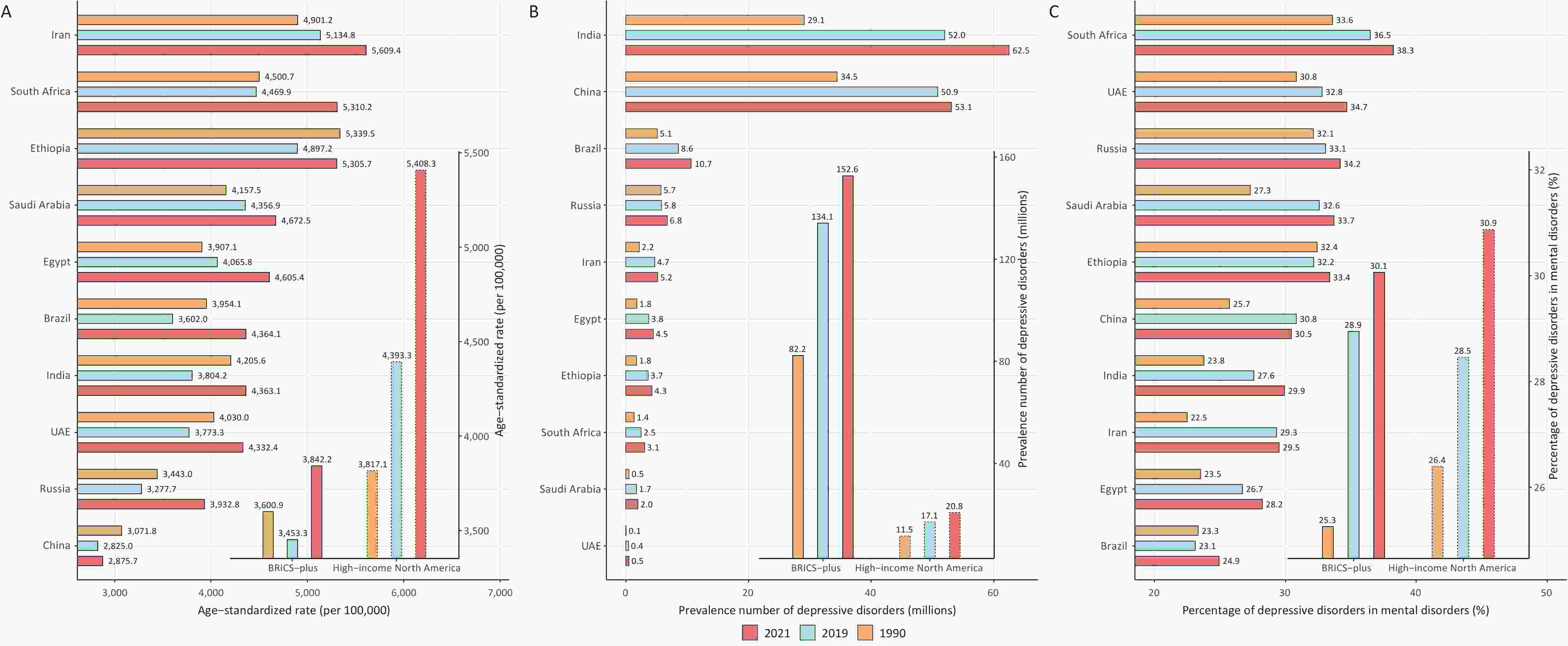 Objective To analyze trends in the depressive disorder burden across BRICS Plus countries and their associations with age, period, and cohort effects. Methods Prevalence, incidence, and disability-adjusted life years (DALYs) estimates of the depressive disorder burden were obtained from the Global Burden of Disease Study, 2021. This study further assessed the period and cohort effects on depressive disorders from 1992 to 2021 using an age-period-cohort model. Results In 2021, 152.6 million people had depressive disorders across the BRICS Plus countries, showing an increase of 85.6% from 1990, which caused 23.7 million DALYs. The age-standardized prevalence rate (ASPR) of depressive disorders declined by 4.1% from 1990 to 2019, followed by a substantial increase (11.3%) from 2019 to 2021. Furthermore, period and cohort effects showed that the depressive disorder burden increased over time and in the recent birth cohort. Meanwhile, the depressive disorder burden increased among adolescents, young adults, and older adults in the BRICS Plus group. Ultimately, projections for 2050 suggest a 150.0% increase in the ASPR. Conclusion This study revealed a heavy depressive disorder burden across BRICS Plus countries, especially among adolescents, young adults, and older adults. This highlights the need to strengthen specific public health strategies and policies targeting populations with different priorities.