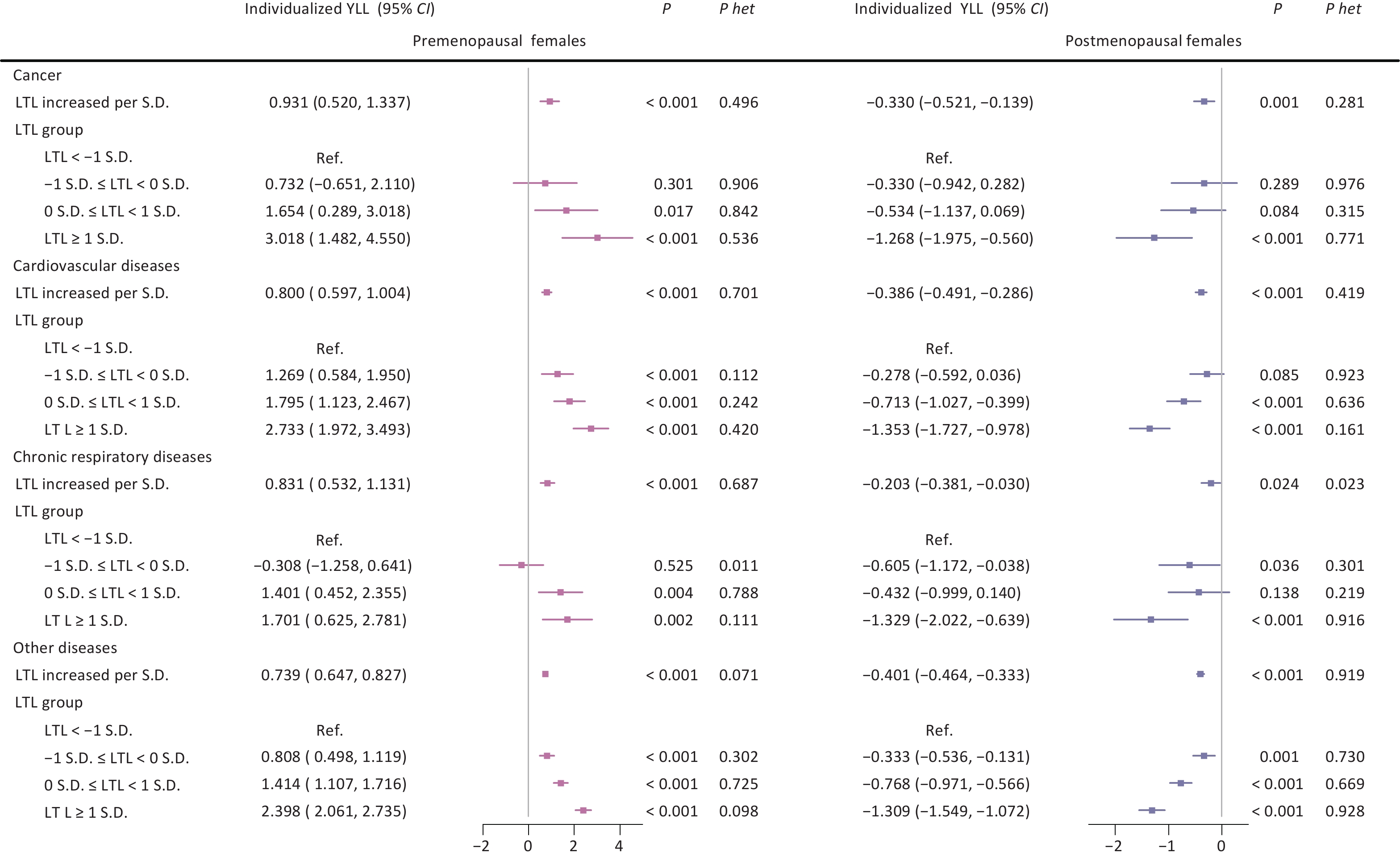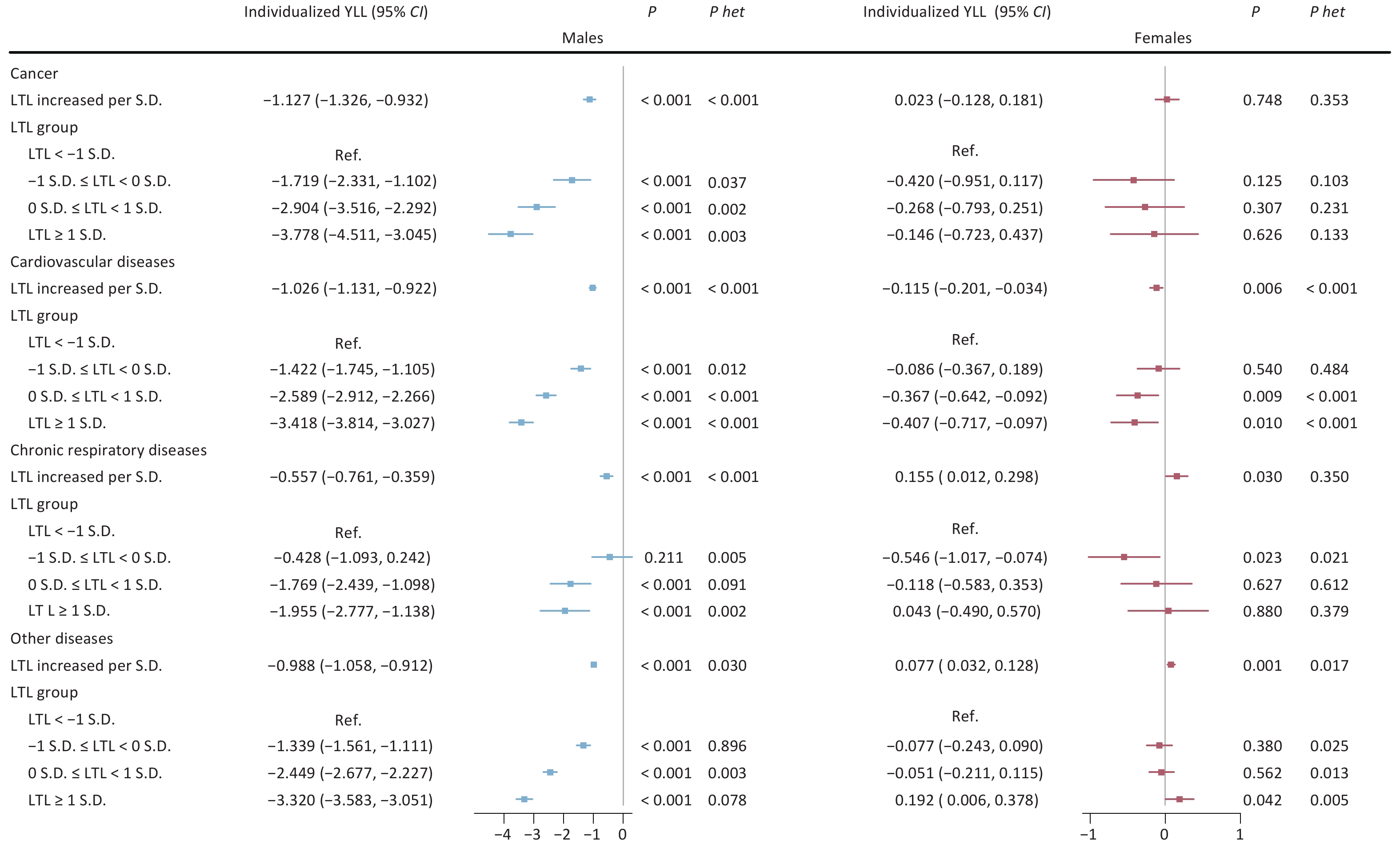 Objective Telomere length is a key aging biomarker, but its sex-specific impact on individualized life expectancy remains uncertain. This study explores sex differences in leukocyte telomere length (LTL) and individualized expected years of life lost (YLL). Methods A prospective cohort of 445,399 participants (203,731 males and 241,668 females) from the UK Biobank was analyzed. LTL values were log-transformed, and YLL was calculated using life tables. Multiple linear regression was applied to examine sex-specific associations. Results In males, each standard deviation (S.D.) increase in LTL was linked to a 0.965-year decrease in YLL (95% CI: –1.025, –0.900; P < 0.001). In females, longer LTL was related to a 0.102-year increase in YLL (95% CI: 0.057, 0.146; P < 0.001). Among postmenopausal females, LTL showed a protective effect similar to that in males (0.387-year decrease, 95% CI: −0.446, –0.328; P < 0.001), while premenopausal females exhibited a detrimental association (0.705-year increase, 95% CI: 0.625, 0.785; P < 0.001). Comparable trends were observed across major aging-related diseases, pointing to a consistent biological pattern. Conclusion The influence of LTL on life expectancy varies significantly by sex, with protective associations seen in males and postmenopausal females. This suggests hormonal involvement in telomere dynamics. The results support integrating sex-specific perspectives into aging and telomere research and clinical practice.