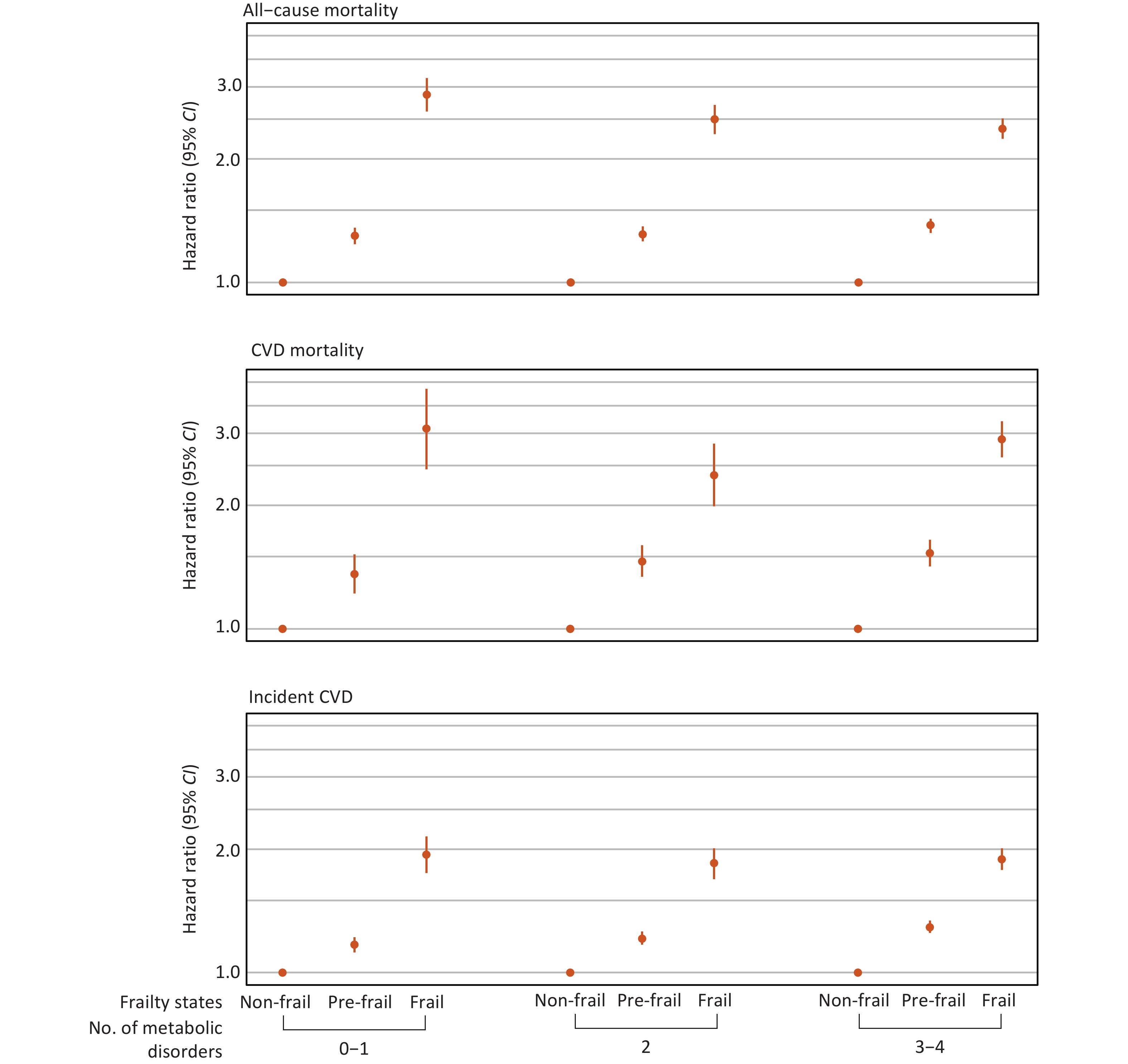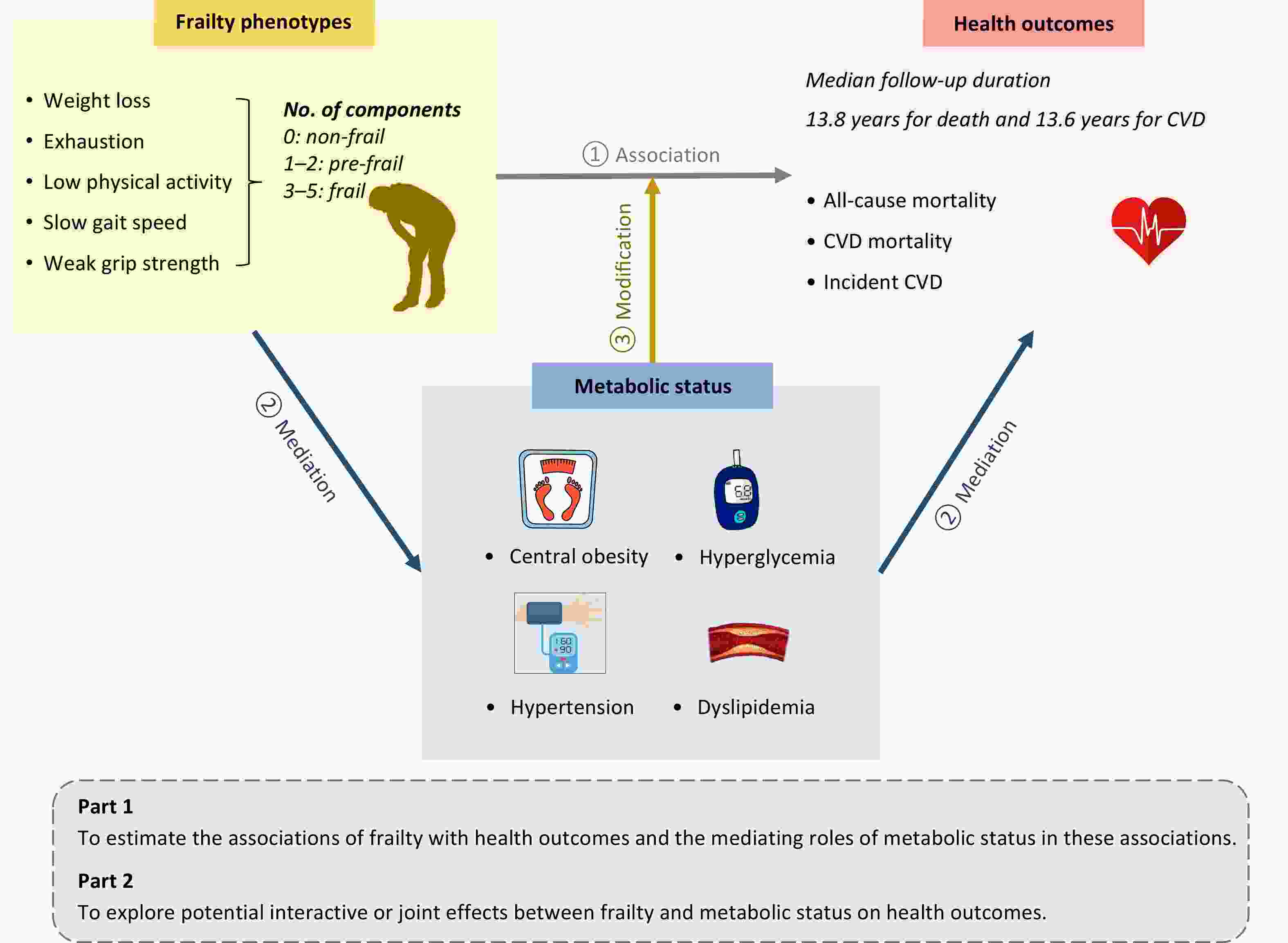Objective To identify whether metabolic status mediates the associations between frailty and mortality and incident cardiovascular disease (CVD), and to assess of interactive or joint relationships between frailty and metabolic status on these outcomes. Methods In this prospective cohort study of 456,445 UK Biobank participants, frailty was assessed using five phenotype criteria. Metabolic status was scored (0–4) based on central obesity, hypertension, hyperglycemia, and dyslipidemia. Multivariable-adjusted Cox regression models were used to assess the associations between frailty and mortality and incident CVD. Results During a median follow-up of 13.8 years for mortality and 13.6 years for CVD, 30,907 deaths (7,467 CVD-related) and 37,115 incident CVD cases occurred. Frailty was associated with higher risks of all-cause mortality (hazard ratio [HR], 2.41; 95% confidence interval [CI], 2.31–2.51), CVD mortality (HR, 2.64; 95% CI, 2.43–2.87), and incident CVD (HR, 1.83; 95% CI, 1.75–1.91), compared with non-frail individuals. Metabolic status mediated 8.7%, 16.1%, and 16.4% of these associations, respectively. Frailty and metabolic status interacted multiplicatively for all-cause mortality (P-value for interaction < 0.001) and additively for CVD mortality [relative excess risk due to interaction (RERI), 1.78; 95% CI, 0.88–2.68] and incident CVD (RERI, 0.60; 95% CI, 0.33–0.86). Joint exposure to frailty and three to four metabolic disorders conferred 3.34-, 6.32-, and 3.30-fold risks of all-cause mortality, CVD mortality, and incident CVD, respectively, compared with metabolically healthy non-frail individuals. Conclusion This study highlights the need for integrated management strategies targeting both frailty and metabolic conditions to mitigate cardiovascular and mortality risks.