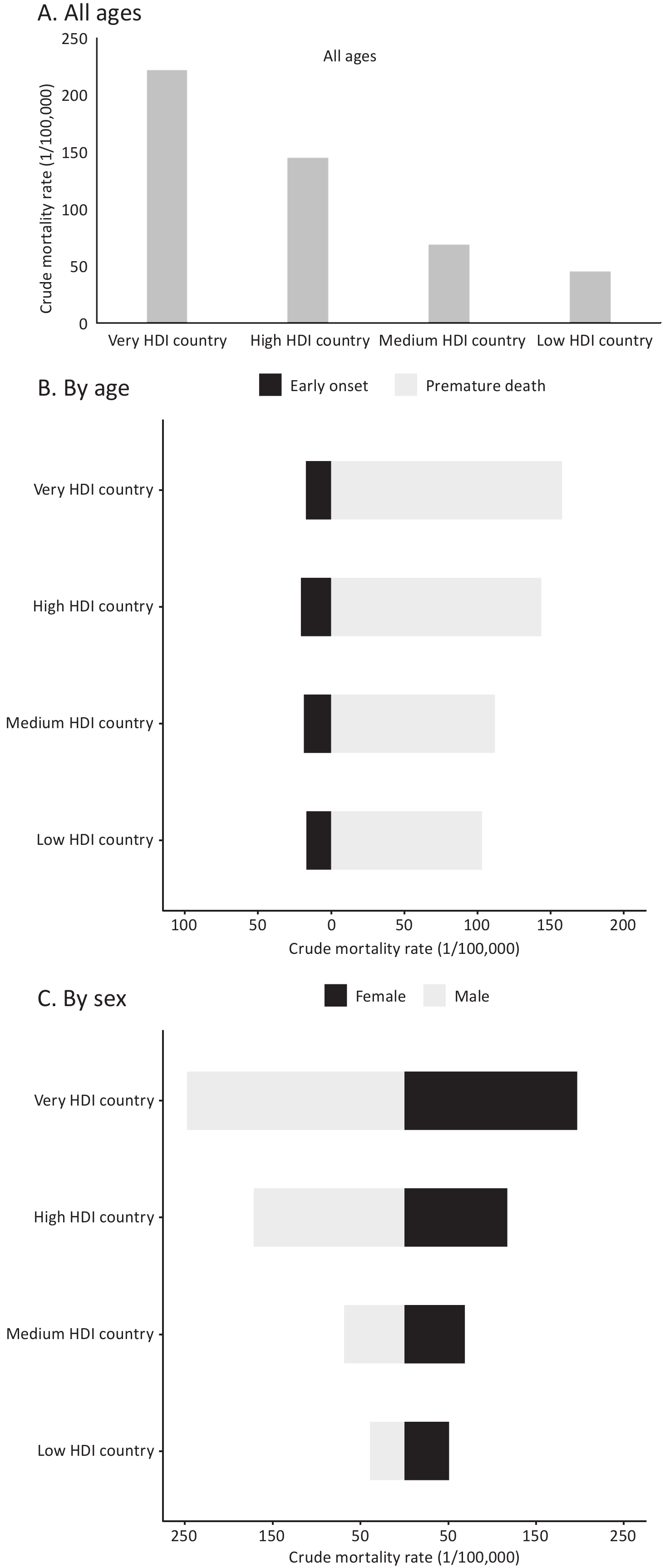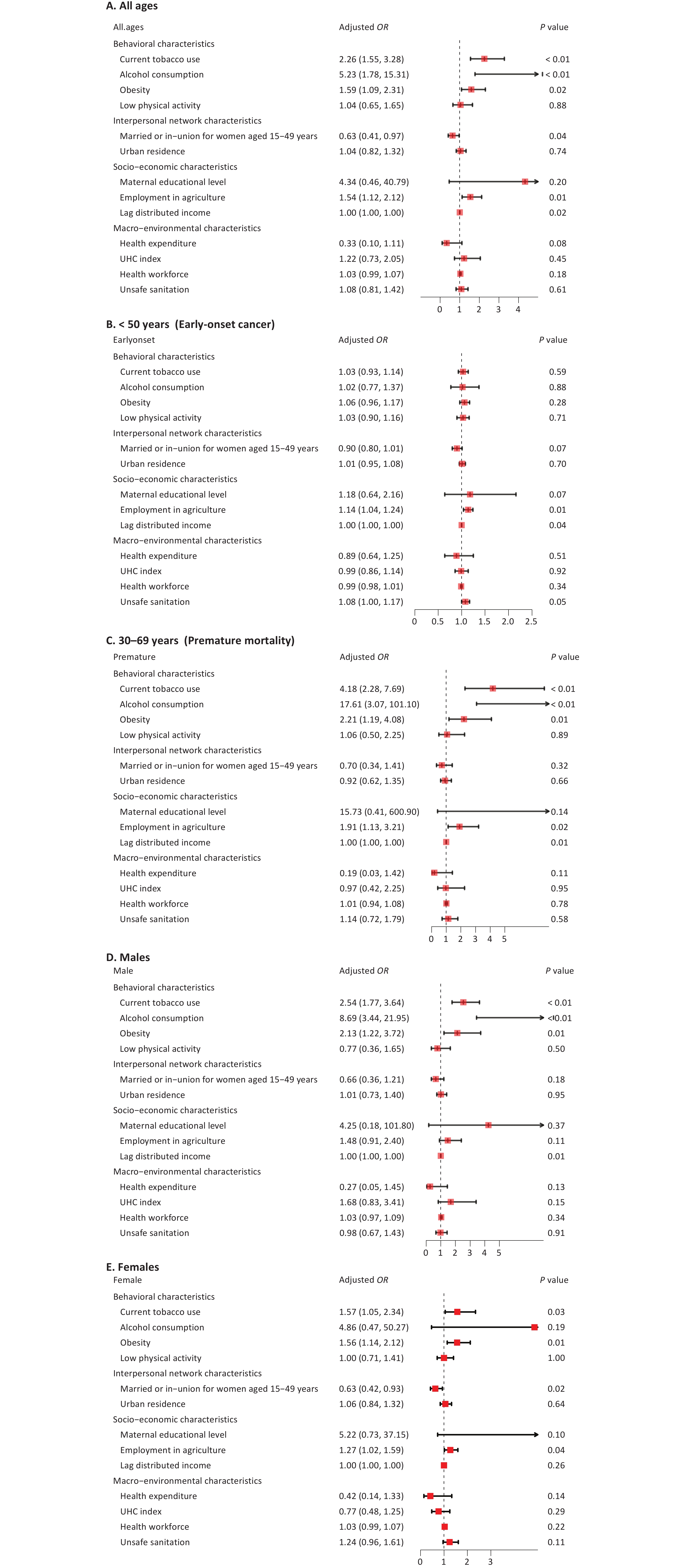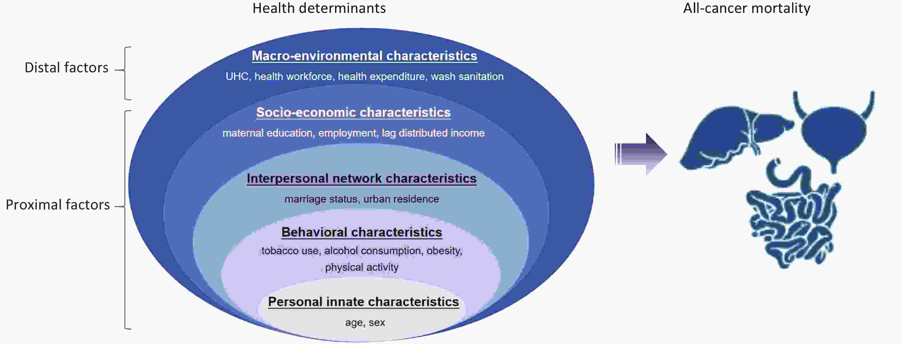 Objective To explore the health determinants of all-cancer mortality from a health-ecological perspective. Methods Using the health-ecological model, we identified 15 health determinants across five domains: personal innate, behavioral, interpersonal network, socioeconomic, and macroenvironmental characteristics. Data on cancer outcomes and health determinants from 185 countries, classified using the Human Development Index (HDI), were extracted from GLOBOCAN 2022, the World Health Organization Global Health Observatory, the Global Burden of Disease Study 2021, the United Nations, and the World Bank. A multivariate linear regression model was used to estimate the association between health determinants and cancer outcomes. Results A total of 153 countries with complete information on cancer outcomes and health determinants were enrolled in the study. A higher all-cancer age-standardized mortality rate (ASMR) was associated with current tobacco use, alcohol consumption, obesity, agricultural employment, and lag-distributed income. In women aged 15–49 years, being married or in a union was associated with a lower ASMR. Early-onset ASMR was positively associated with agricultural employment, lag-distributed income, and unsafe sanitation. Notable sex differences were observed, although tobacco use and obesity were identified as risk factors in both sexes. Conclusion We underscore the crucial need to incorporate cross-sectoral interventions within a resilient healthcare system to effectively mitigate the cancer mortality burden.