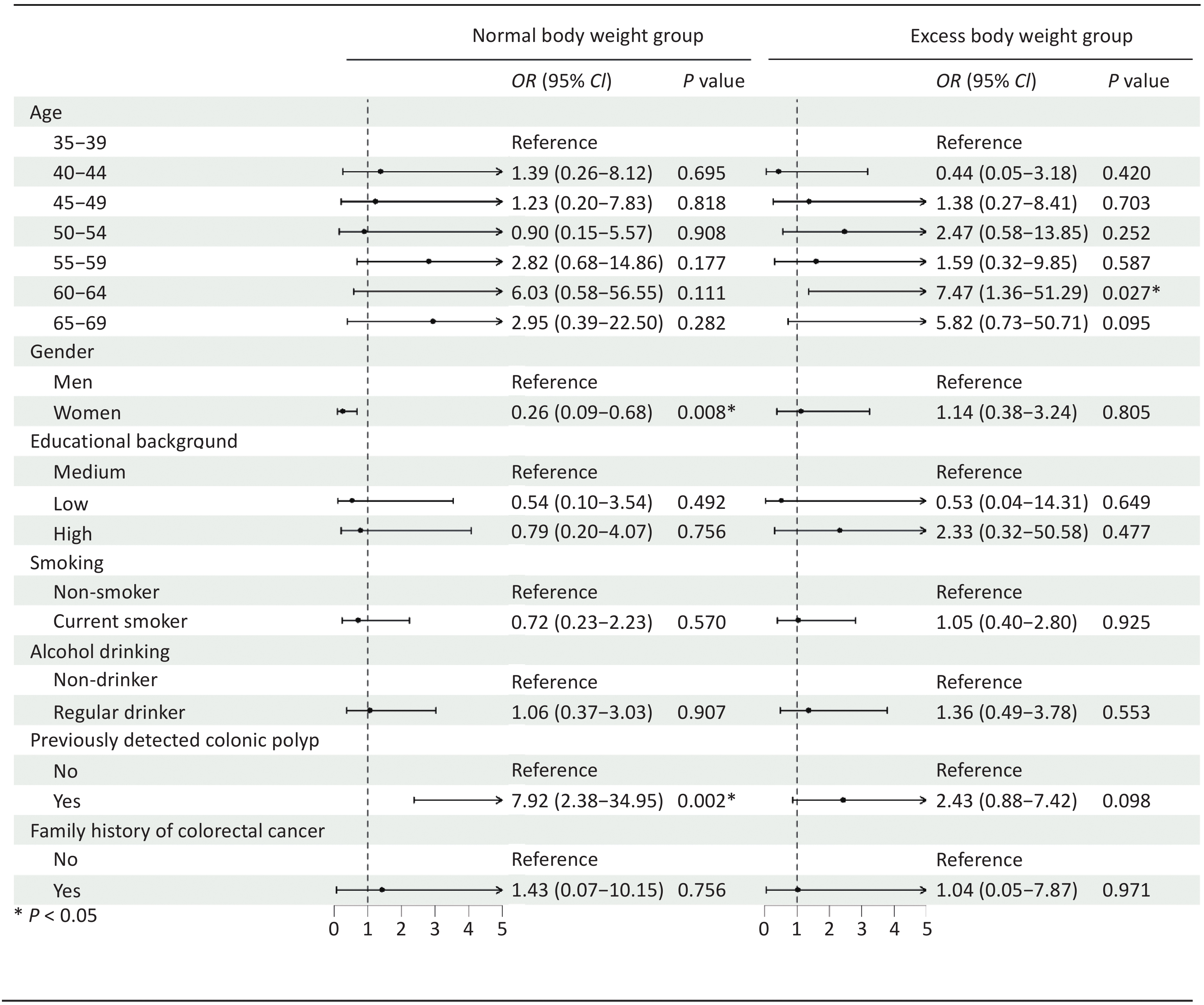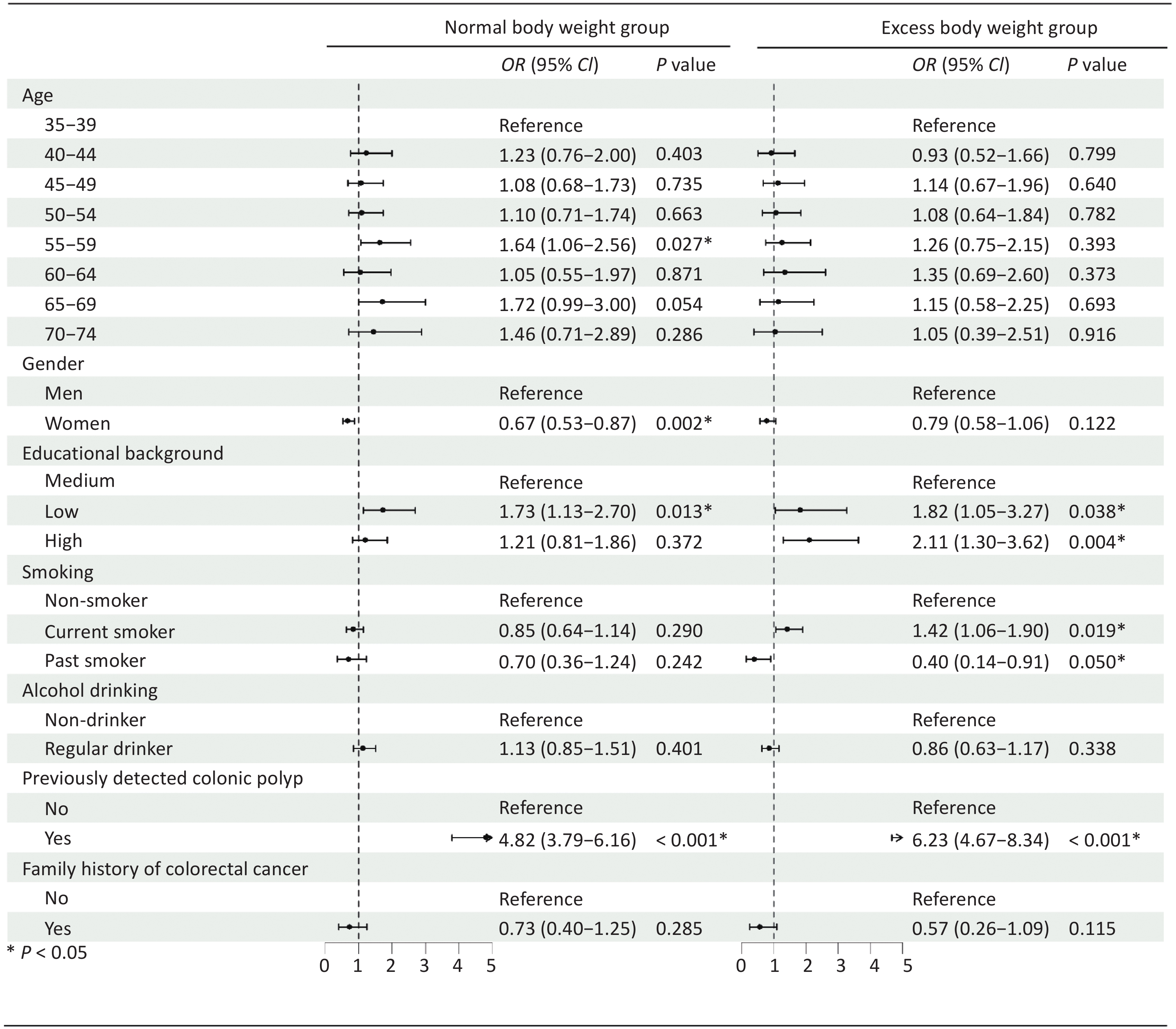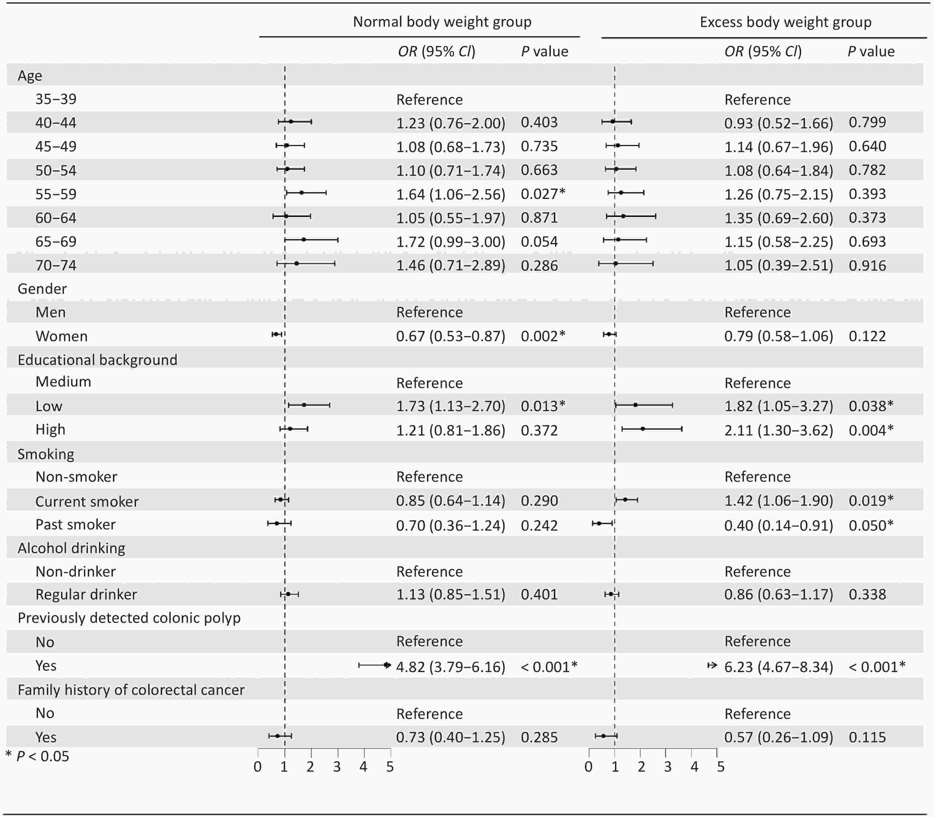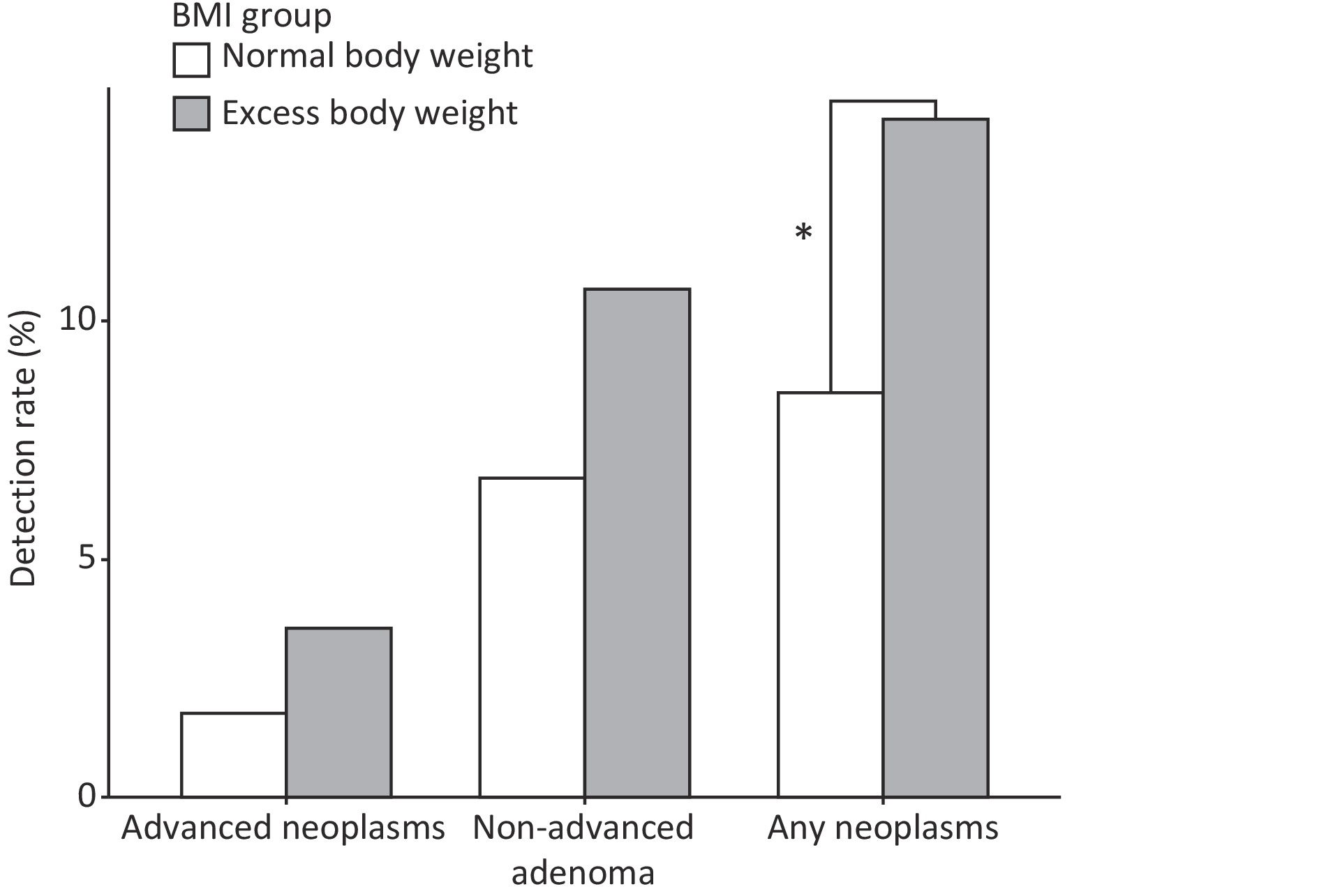 Objective To examine the effect of excess body weight on adherence and lesion detection in colorectal cancer (CRC) screening. Methods A cross-sectional analysis was conducted within an opportunistic CRC screening program in Chongqing, which enrolled 43,797 adults aged 35–74 years between 2021 and 2022. A total of 42,279 participants were included in the final analysis, of whom 19,462 (46.0%) had excess body weight (BMI > 24.0 kg/m2). Colonoscopy adherence and detection were compared between normal and excess body weight group, and associated factors were examined. Results Of the 7,002 participants recommended for colonoscopy, 3,808 (54.4%) had excess body weight. Adherence was significantly lower in the excess weight group (6.6%) than in the normal weight group (10.7%, P < 0.001), and this trend was consistent across sex and age groups. The detection rates of advanced neoplasms (3.6% vs. 1.8%) and non-advanced adenomas (10.7% vs. 6.7%) were higher in the excess weight cohort, with a significant difference for any neoplasm (14.2% vs. 8.9%, P < 0.05). Differences in adherence- and detection-related factors were also observed between the groups. Conclusion Excess body weight was associated with lower colonoscopy adherence but higher neoplasm detection. These findings support the integration of weight management with targeted screening promotion to improve CRC prevention in this high-risk population.
