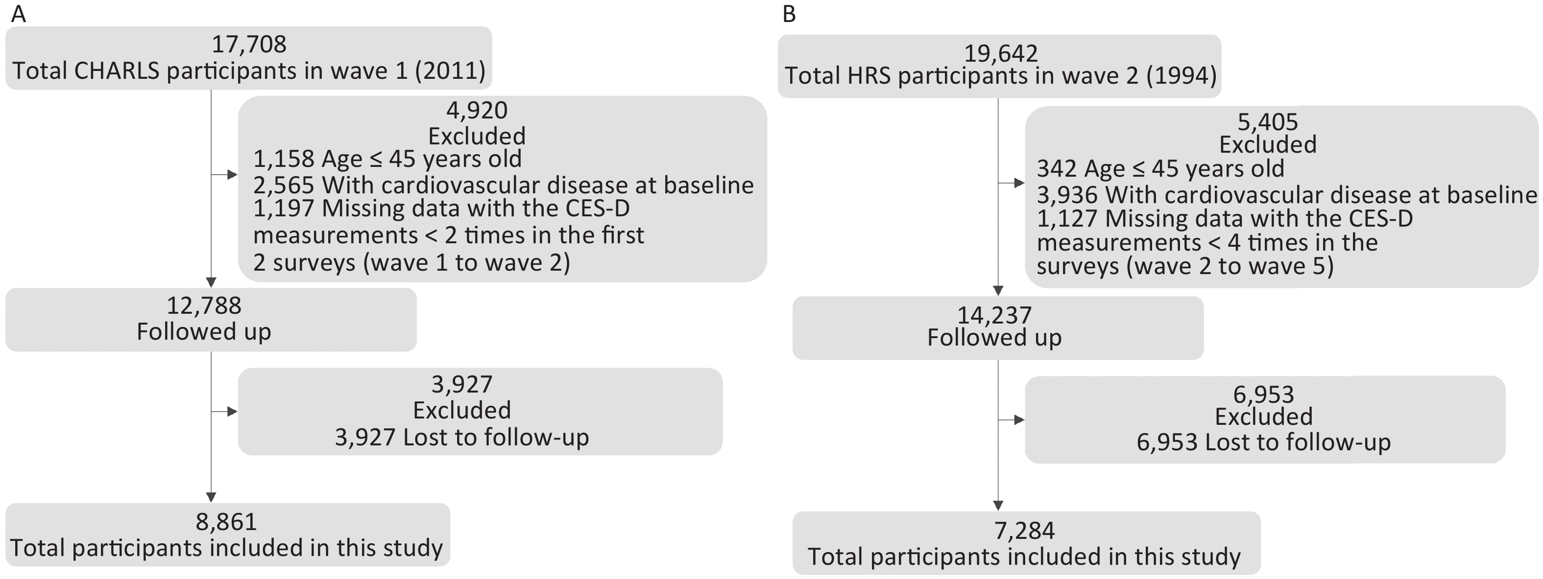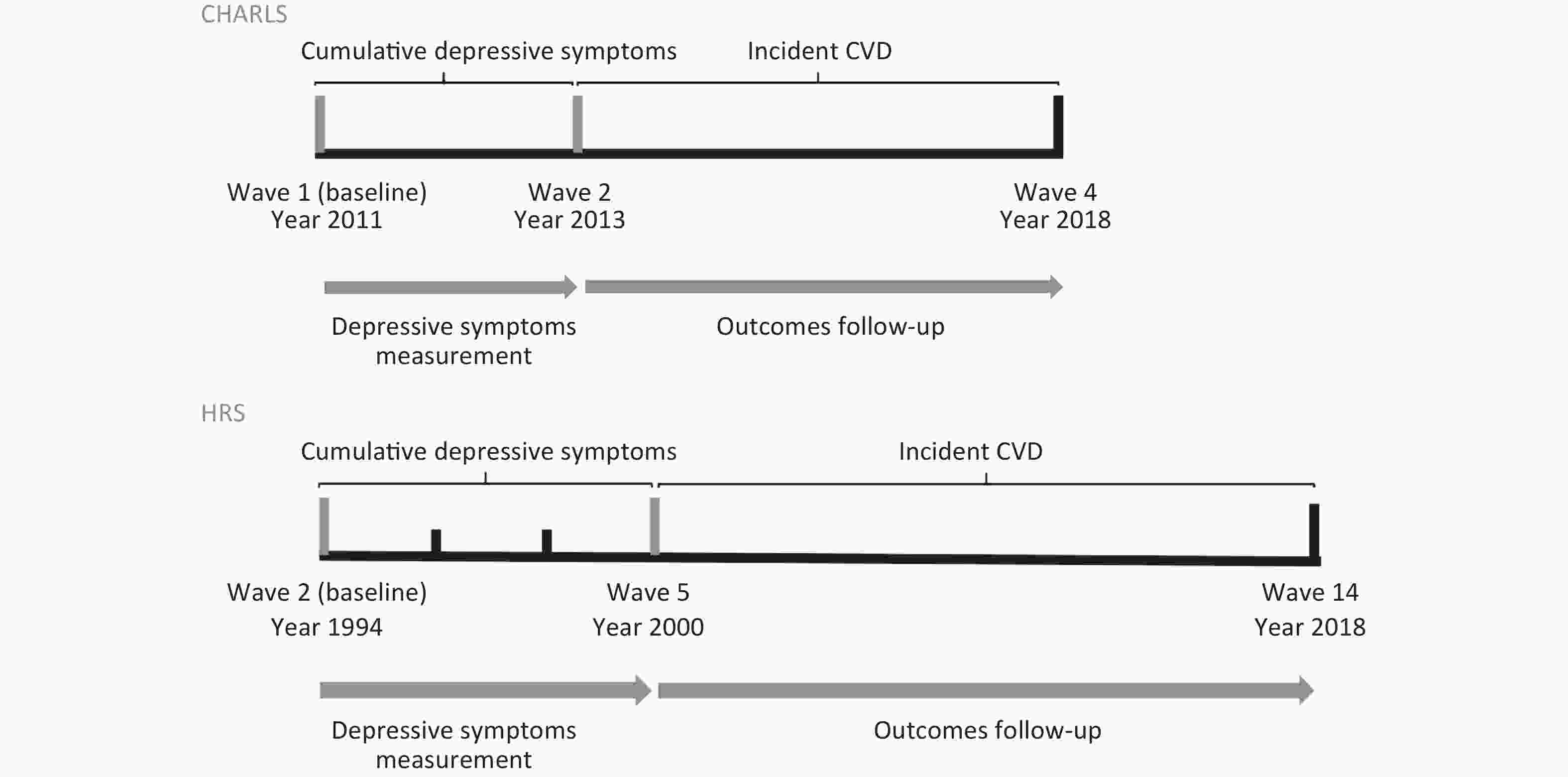 Objective Elevated depressive symptoms are well-documented among geriatric adults with cardiovascular disease (CVD); however, few studies have accounted for long-term cumulative depressive symptom exposure. This study determined the relationship between cumulative depressive symptoms and CVD. Methods Individual participant data were obtained from the China Health and Retirement Longitudinal Study (CHARLS) and Health and Retirement Study (HRS). Eligible participants had access to assessment information on depressive symptoms and had no history of CVD at baseline. Long-term cumulative depressive symptoms were estimated by calculating the area under the curve based on the Center for Epidemiological Studies Depression Scale. Results Herein, 8,861 participants from CHARLS (mean age: 58.58 years; male: 48.6%) and 7,284 from HRS (60.94 years; 35.0%) were enrolled. The median follow-up period was 5 years for the CHARLS and 10 years for the HRS. Compared with the first quartile of cumulative depressive symptoms, the HRs (95% CI) in the fourth quartile were 1.73 (1.48, 2.02) for predicting CVD (P < 0.001), 1.83 (1.52, 2.19) for heart disease (P < 0.001), 1.53 (95% CI: 1.17, 1.99) for stroke (P = 0.002) in CHARLS. For HRS, the HRs (95% CI) were 1.41 (95% CI: 1.27, 1.57; P < 0.001), 1.42 (95% CI: 1.26, 1.59; P < 0.001), and 1.30 (95% CI: 1.06, 1.58; P = 0.010) respectively. Strong dose-response relationships were observed, with similar results for the two cohorts. Conclusion Long-term cumulative depressive symptoms were significantly associated with incident CVD in middle-aged and older adults, providing insights into controlling long-term depressive symptoms to improve this cohort’s health.