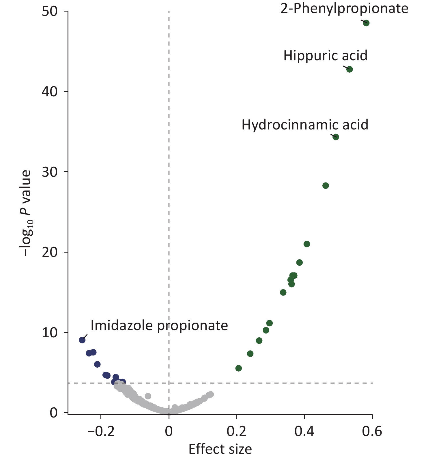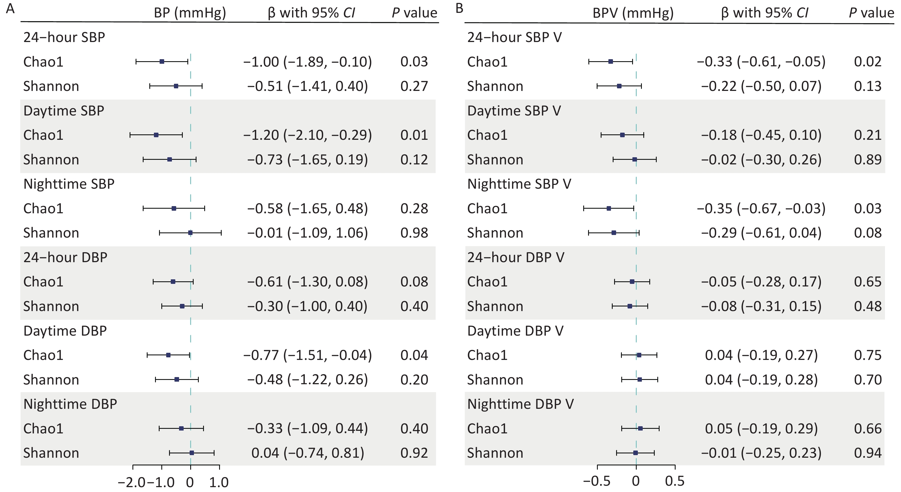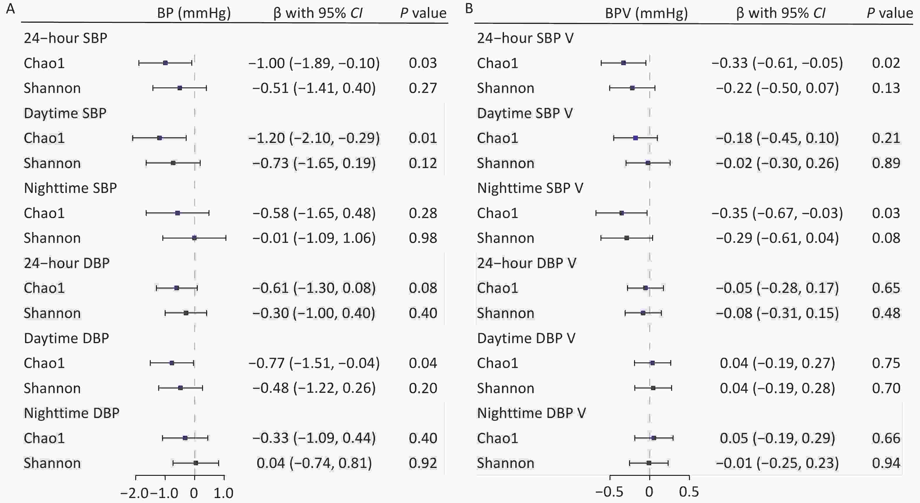 Objective Evidence suggests that depleted gut microbial α-diversity is associated with hypertension; however, whether metabolic markers affect this relationship remains unknown. We aimed to determine the potential metabolites mediating the associations of α-diversity with blood pressure (BP) and BP variability (BPV). Methods Metagenomics and plasma targeted metabolomics were conducted on 523 Chinese participants from the MetaSalt study. The 24-hour, daytime, and nighttime BP and BPV were calculated based on ambulatory BP measurements. Linear mixed models were used to characterize the relationships between α-diversity (Shannon and Chao1 index) and BP indices. Mediation analyses were performed to assess the contribution of metabolites to the observed associations. The influence of key metabolites on hypertension was further evaluated in a prospective cohort of 2,169 participants. Results Gut microbial richness (Chao1) was negatively associated with 24-hour systolic BP, daytime systolic BP, daytime diastolic BP, 24-hour systolic BPV, and nighttime systolic BPV (P < 0.05). Moreover, 26 metabolites were strongly associated with richness (Bonferroni P < 0.05). Among them, four key metabolites (imidazole propionate, 2-hydroxy-3-methylbutyric acid, homovanillic acid, and hydrocinnamic acid) mediated the associations between richness and BP indices (proportions of mediating effects: 14.1%–67.4%). These key metabolites were also associated with hypertension in the prospective cohort. For example, each 1-standard deviation unit increase in hydrocinnamic acid significantly reduced the risk of prevalent (OR [95% CI] = 0.90 [0.82, 0.99]; P = 0.03) and incident hypertension (HR [95% CI] = 0.83 [0.71, 0.96]; P = 0.01). Conclusion Our results suggest that gut microbial richness correlates with lower BP and BPV, and that certain metabolites mediate these associations. These findings provide novel insights into the pathogenesis and prevention of hypertension.