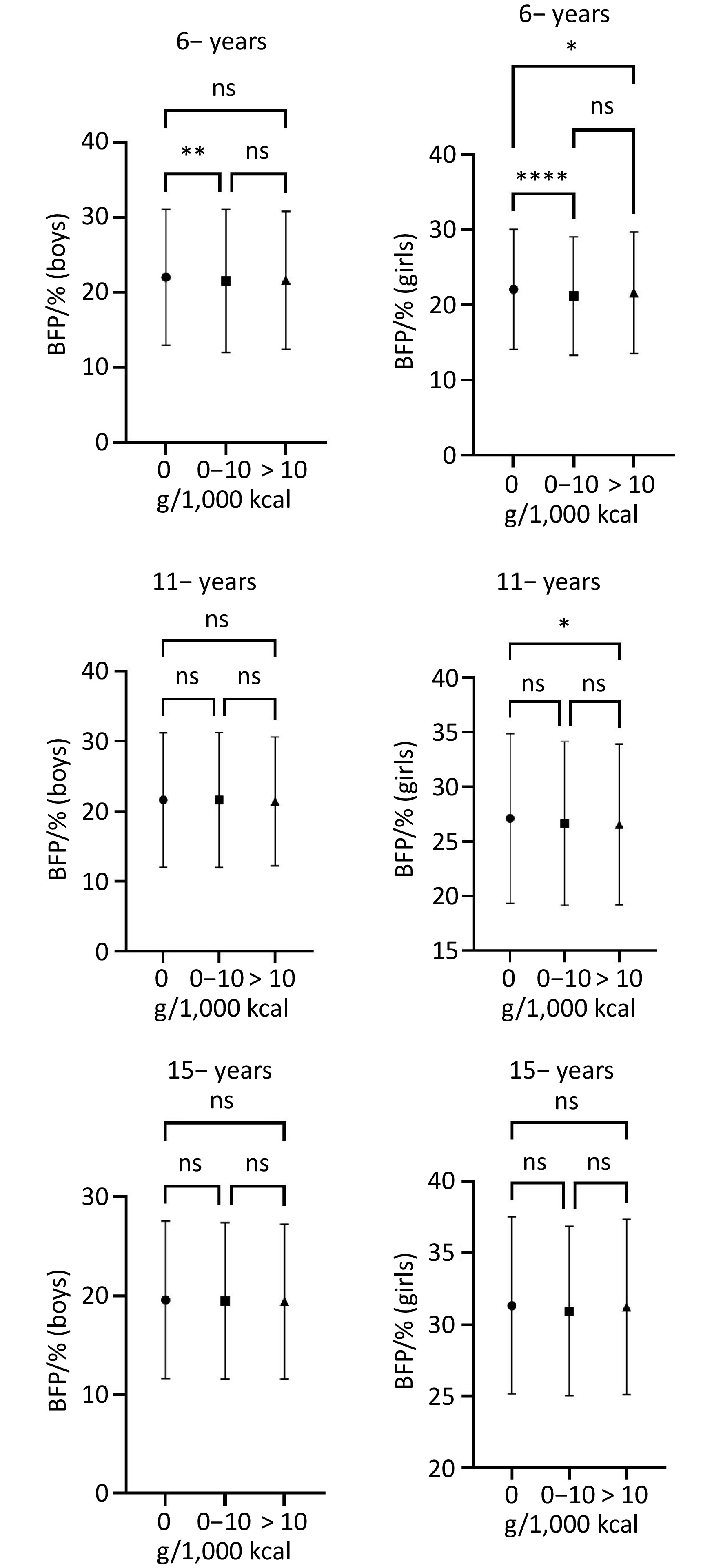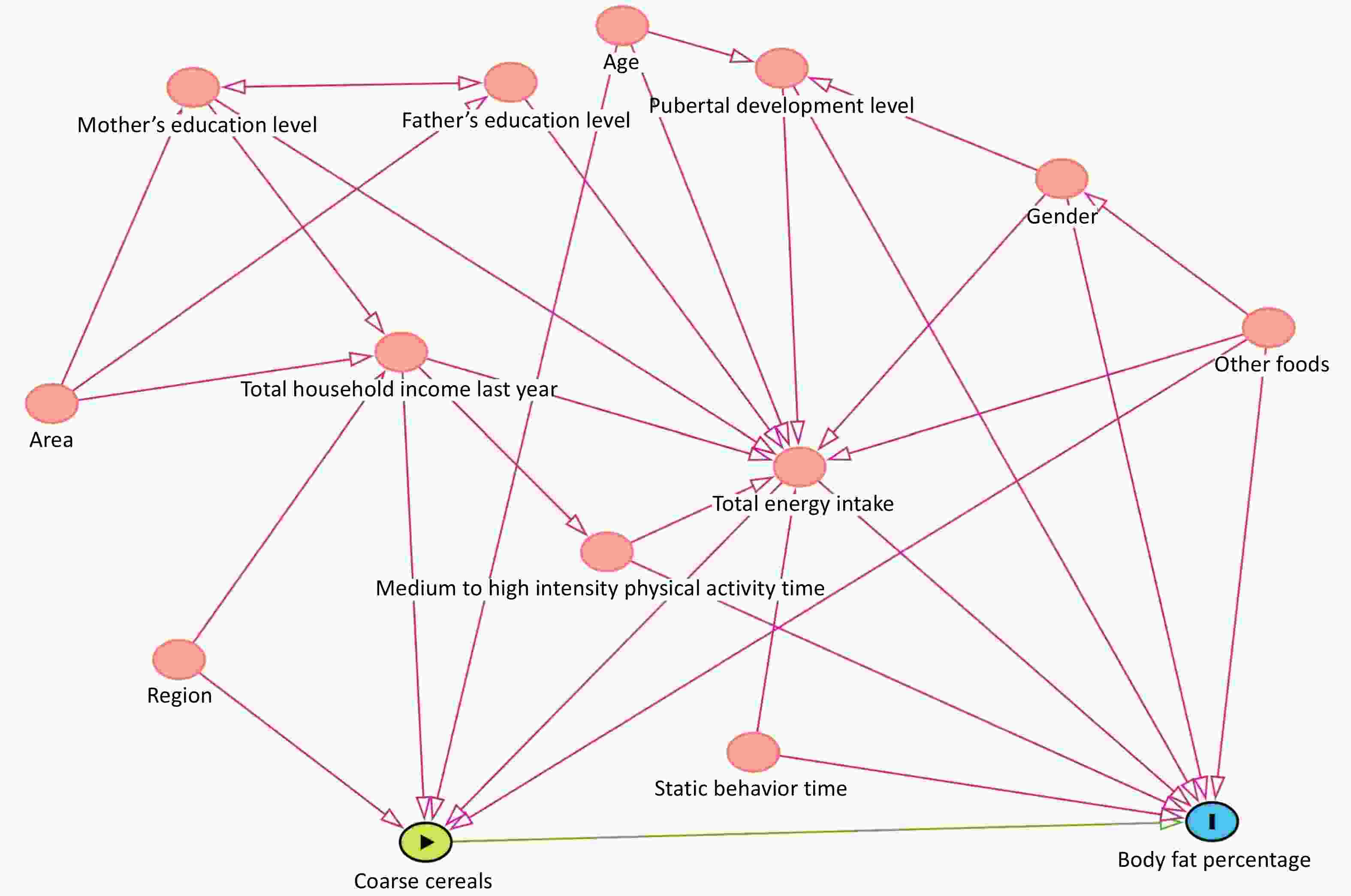 Objective The rising prevalence of childhood obesity is closely associated with suboptimal dietary patterns. To address this public health concern, we conducted a comprehensive study to examine the association between coarse cereals consumption and body fat percentage (BFP) in Chinese children and adolescents. Methods The study included 48,305 children aged 6–17 years from 28 districts/counties in 14 provinces across seven regions of China (24,152 girls and 24,153 boys). BFP was examined using bioelectrical impedance analysis in the early morning. Coarse cereals consumption was assessed using a Food Frequency Questionnaire and categorized into three groups: 0 g/1,000 kcal per day, 0–10 g/1,000 kcal per day, and > 10 g/1,000 kcal per day (daily consumption of coarse cereals × 1,000/total energy consumption). Quantile regression model was used to analyze the association between coarse cereals and BFP, adjusting for potential confounders such as age, pubertal development stage, urban/rural and regional factors, total daily dietary energy consumption, sedentary time, moderate-to-high physical activity, household income, parental education, and consumption of other foods. Results Boys aged 6–10, 11–14, and 15–17 years had median daily coarse cereals consumptions of 6.6 g, 7.1 g, and 5.7 g, with BFP of 19.6%, 19.5%, and 17.5% (all P < 0.05). Girls in the same age groups showed consumption of 7.1 g, 8.4 g, and 6.7 g, with BFP of 20.3%, 26.4%, and 31.0% (all P < 0.05). The quantile regression results for boys showed that daily consumption of coarse cereals was significantly correlated with their BFP in the 0.15, 0.25, and 0.50 quartiles, with regression coefficients of −0.257, −0.221, and −0.330, respectively, after adjusting for potential confounders (P < 0.05). For girls, there was a significant correlation with PBF at the 0.05, 0.15, 0.25, 0.50, 0.75, and 0.85 quartiles, with regression coefficients of −0.258, −0.366, −0.372, −0.431, −0.472, and −0.503 (P < 0.05 for all). Conclusions Coarse cereals consumption among Chinese children and adolescents remains relatively low. Higher consumption was inversely associated with BFP in children aged 6–17 years. Future interventional studies should assess how increased coarse cereals consumption prevents childhood obesity.