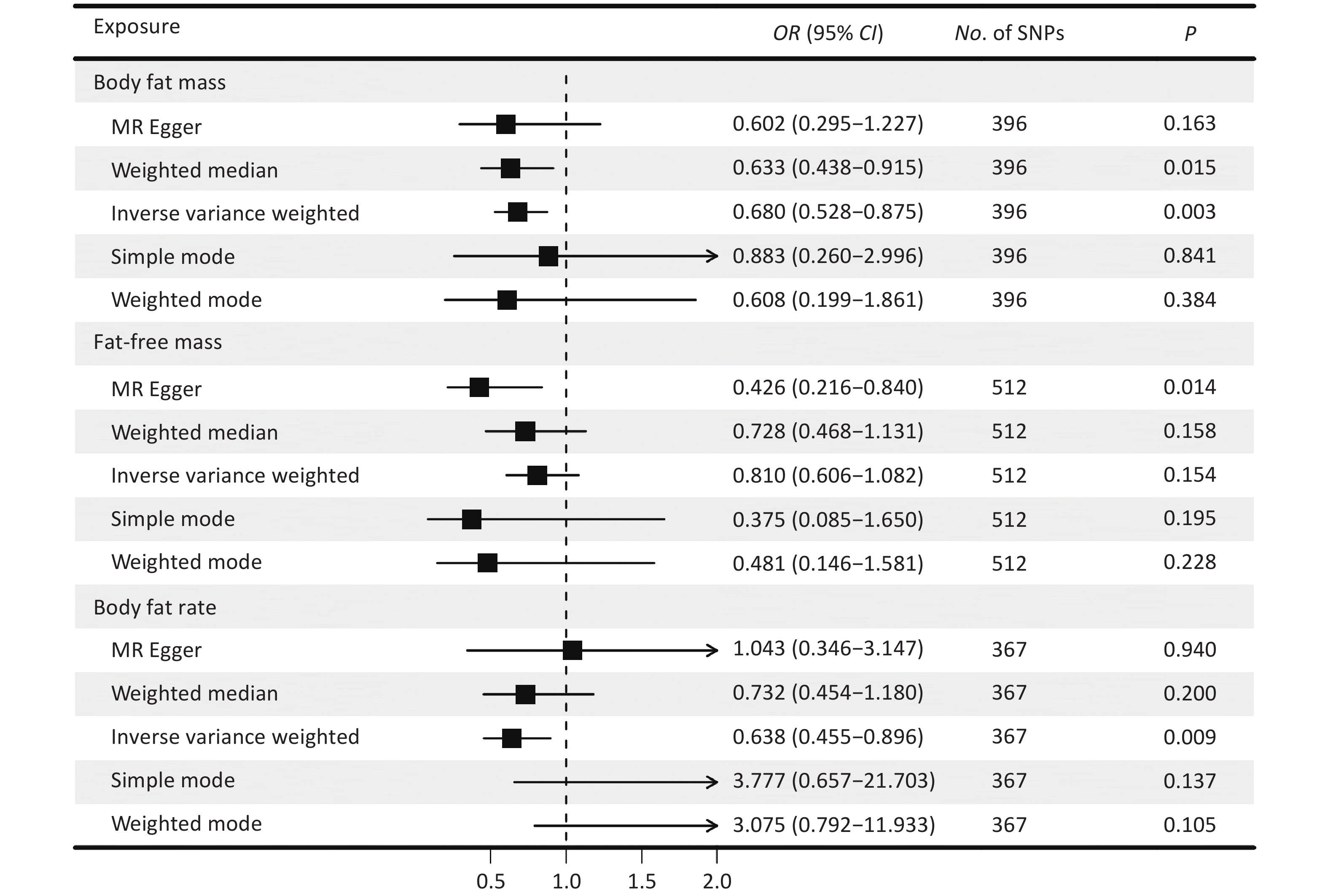 Objective Previous studies link lower body mass index (BMI) with increased obsessive-compulsive disorder (OCD) risk, yet other body mass indicators may be more etioloically relevant. We dissected the causal association between body fat mass (FM) and OCD. Methods Summary statistics from genome-wide association studies of European ancestry were utilized to conduct two-sample Mendelian randomization analysis. Heterogeneity, horizontal pleiotropy, and sensitivity analyses were performed to assess the robustness. Results The inverse variance weighting method demonstrated that a genetically predicted decrease in FM was causally associated with an increased OCD risk [odds ratio (OR) = 0.680, 95% confidence interval (CI): 0.528–0.875, P = 0.003]. Similar estimates were obtained using the weighted median approach (OR = 0.633, 95% CI: 0.438–0.915, P = 0.015). Each standard deviation increases in genetically predicted body fat percentage corresponded to a reduced OCD risk (OR = 0.638, 95% CI: 0.455–0.896, P = 0.009). The sensitivity analysis confirmed the robustness of these findings with no outlier instrument variables identified. Conclusion The negative causal association between FM and the risk of OCD suggests that the prevention or treatment of mental disorders should include not only the control of BMI but also fat distribution and body composition.