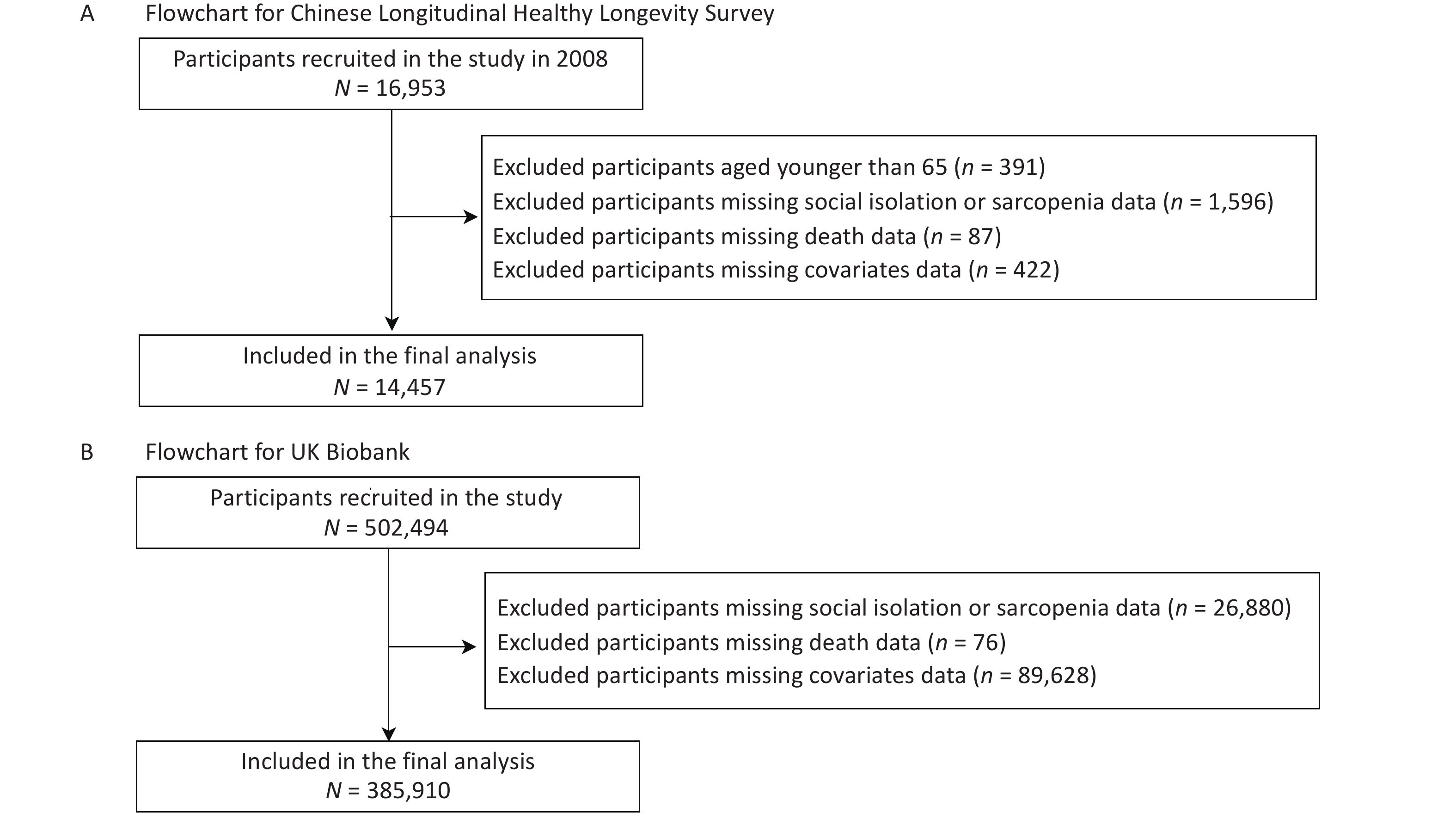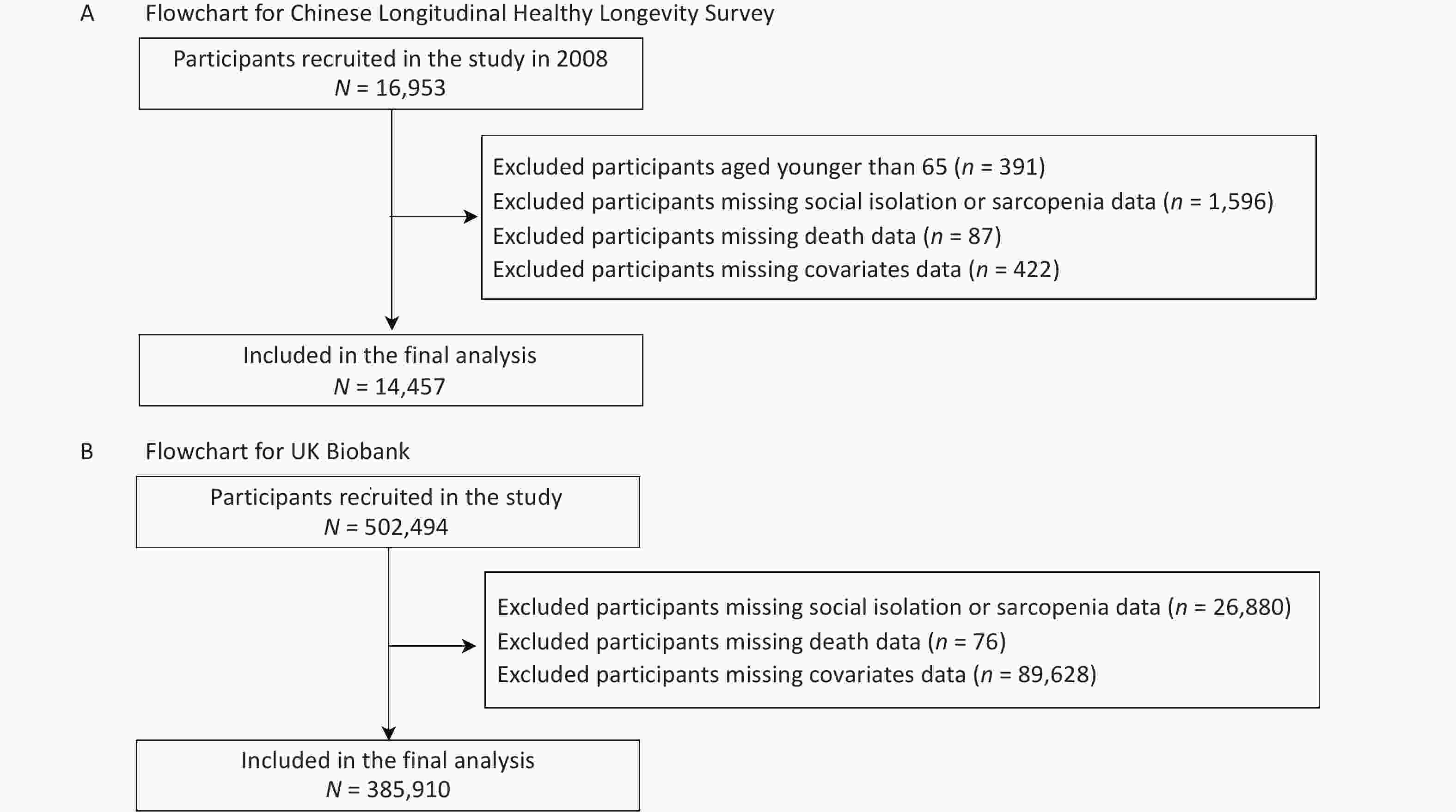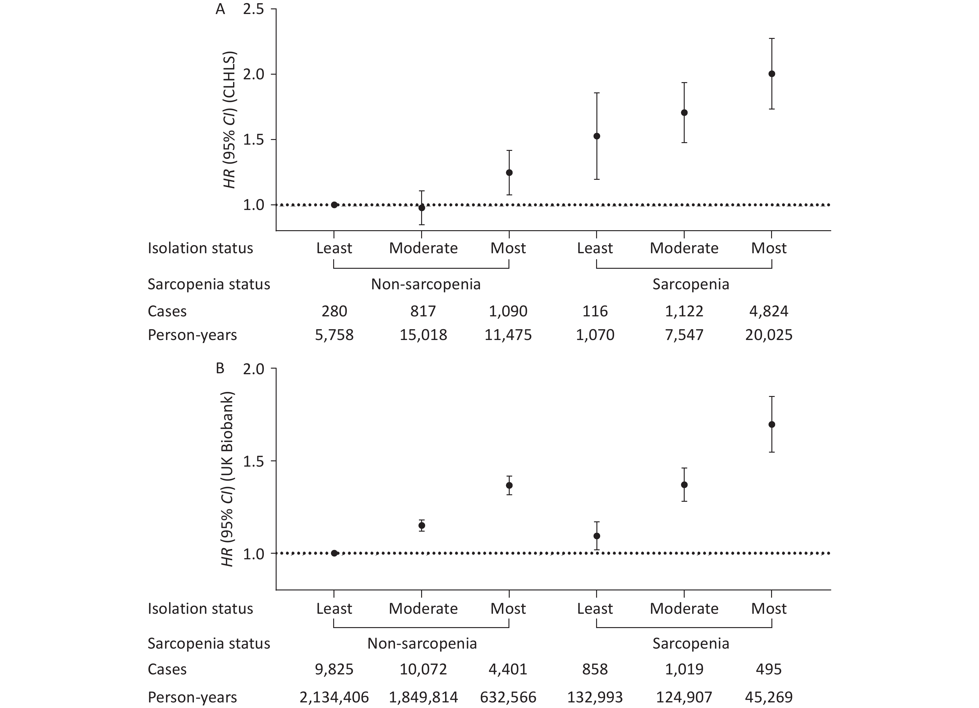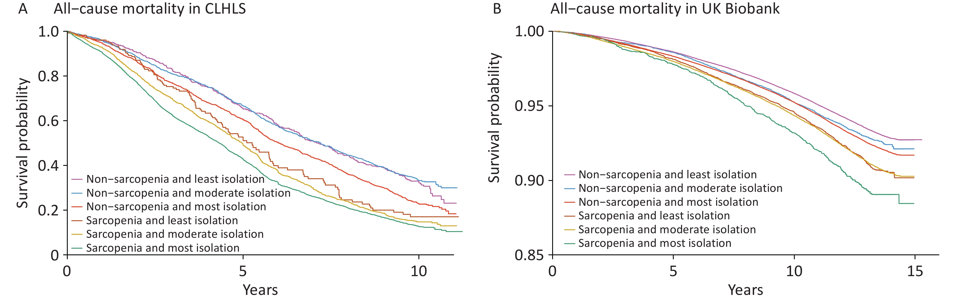 Objective This study aims to investigate the joint associations of sarcopenia and social isolation with mortality risk. Methods Using data from the Chinese Longitudinal Healthy Longevity Survey (CLHLS) and the UK Biobank, sarcopenia was diagnosed according to European and Asian Working Groups for Sarcopenia criteria. Social isolation was assessed using standardized questionnaires, including questions on solitude, frequency of social activities, contact with others, and marital status (for the CLHLS only). Results During the follow-up period, 8,249 deaths occurred in the CLHLS and 26,670 deaths in the UK Biobank groups. While no significant interaction was observed between sarcopenia and social isolation in predicting all-cause mortality in the CLHLS cohort, the association between social isolation and mortality was stronger among individuals with sarcopenia in the UK Biobank (P-interaction = 0.03, relative risk due to interaction: 0.23, 95% confidence interval [CI]: 0.06–0.41). Further joint analyses showed that participants with sarcopenia and high levels of social isolation had the highest mortality risk (hazard ration [HR]: 1.99; 95% CI: [1.74–2.28] in the CLHLS and 1.69 [1.55–1.85] in the UK Biobank) compared to those without either condition. Conclusion The combination of social isolation and sarcopenia synergistically increases the risk of mortality in middle-aged and older adults across diverse populations.