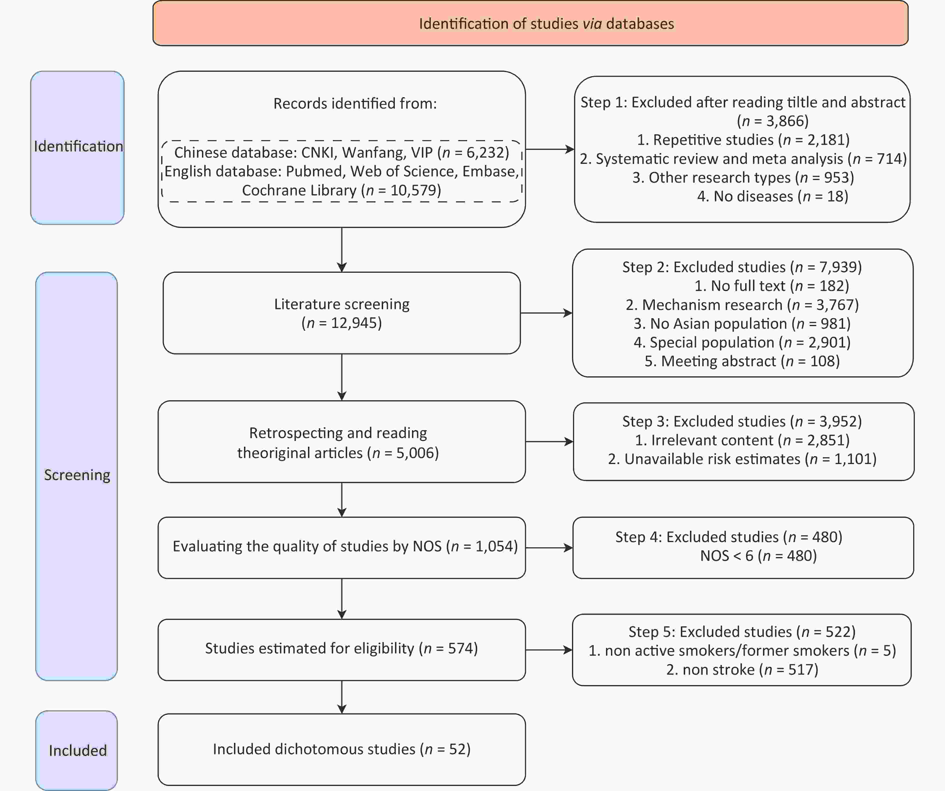 Objective Stroke is the third leading cause of death worldwide, with the highest incidence in Asia, particularly in China, where smoking remains a major risk factor. The smoking prevalence in China is similar to that in Asia. Whether the risk estimates for smoking-related stroke in China and all Asian countries are still unknown which is worth evaluating. Thus, this study aims to compare the Relative Risk (RR) of smoking-attributed stroke among the Chinese and Asian populations. Methods A literature search was conducted from the inception to September 10, 2022. Studies meeting the criteria were included. The articles were screened, and related information was extracted. Pooled RRs stratified by smoking status and sex were analyzed, including subgroup analyses for China, other Asian countries, and Asia overall. Finally, publication bias and sensitivity analyses were conducted. Results Thirty-seven articles on the Chinese population and 15 on other Asian populations were included, with a mean Newcastle-Ottawa scale (NOS) score of 7.25. About ever smokers, there had no statistical difference existed in both sexes and females between China and other Asian countries, while the RR of males in other Asian countries [2.31 (1.38, 3.86)] was higher than that in China [1.21 (1.15, 1.26)]; further subgroup analysis indicated that other Asian countries had higher RR [3.76 (3.02, 4.67)] in the morbidity subgroup. The RRs of both sexes, males and females, between China and the whole of Asia were not statistically different. As for current and former smokers, no meaningful statistical difference was observed in the pooled RRs of both sexes, males and females, in China, other Asian countries, and all of Asia. Conclusion The RR of males ever smokers in China was smaller than that in other Asian countries due to the few articles of morbidity subgroup, but had no statistical difference with the whole of Asia; other groups of ever smokers, current smokers, and former smokers were not statistically significant with other Asian countries or the whole of Asia.
