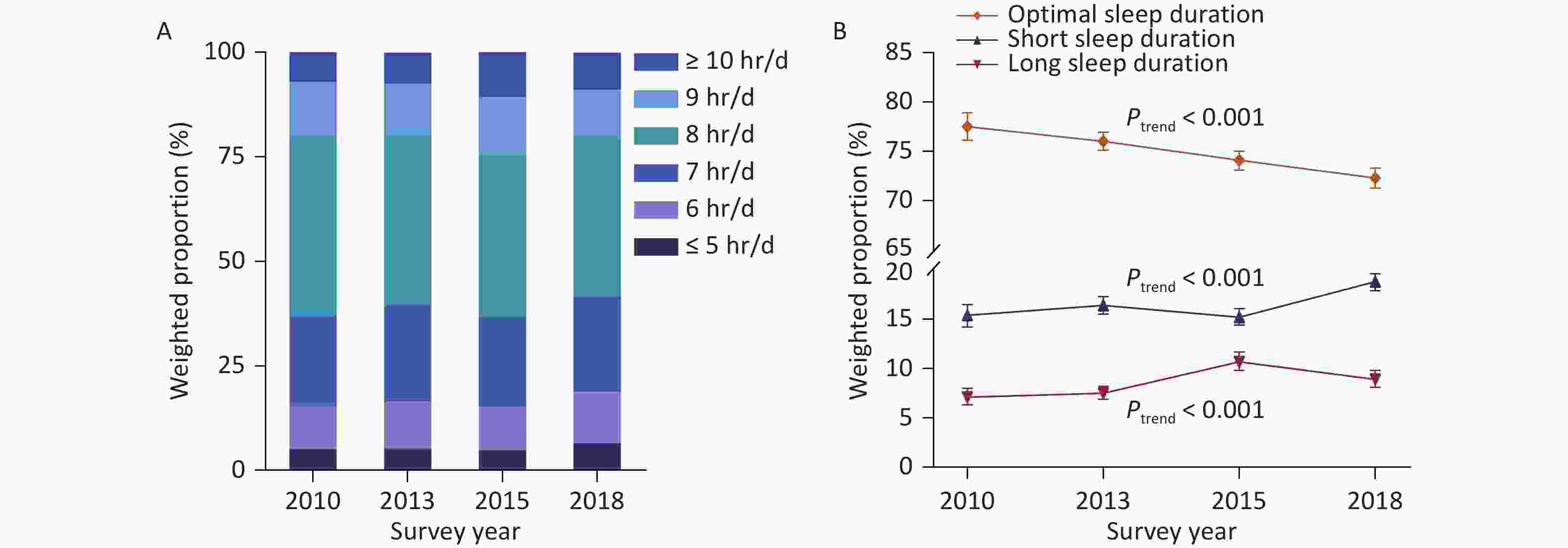 Objective This study aimed to determine the temporal trends in sleep duration among Chinese adults. Methods In this series of repeated nationally representative cross-sectional surveys (China Chronic Disease and Risk Factors Surveillance) conducted between 2010 and 2018, a total of 645,420 adult participants (97,741 in 2010; 175,749 in 2013; 187,777 in 2015; and 184,153 in 2018) were included in the trend analysis. Linear and logistic regression models were utilized to assess trends in sleep duration. Results In 2018, the estimated overall mean sleep duration among the Chinese adult population was 7.58 (SD, 1.45) hours per day, with no significant trend from 2010. A significant increase in short sleep duration (≤ 6 hours) was observed in the total population, from 15.3% (95% CI: 14.1%–16.5%) in 2010 to 18.5% (95% CI: 17.7%–19.3%) in 2018 (P < 0.001). Similarly, the trend in long sleep duration (> 9 hours) was also significant, increasing in weighted prevalence from 7.2% (95% CI: 6.3%–8.1%) in 2010 to 9.0% (95% CI: 8.2%–9.9%) in 2018 (P < 0.001). Conclusion The prevalence of both short and long sleep durations significantly increased among Chinese adults from 2010 to 2018, highlighting the urgency of health initiatives to promote optimal sleep duration in China.