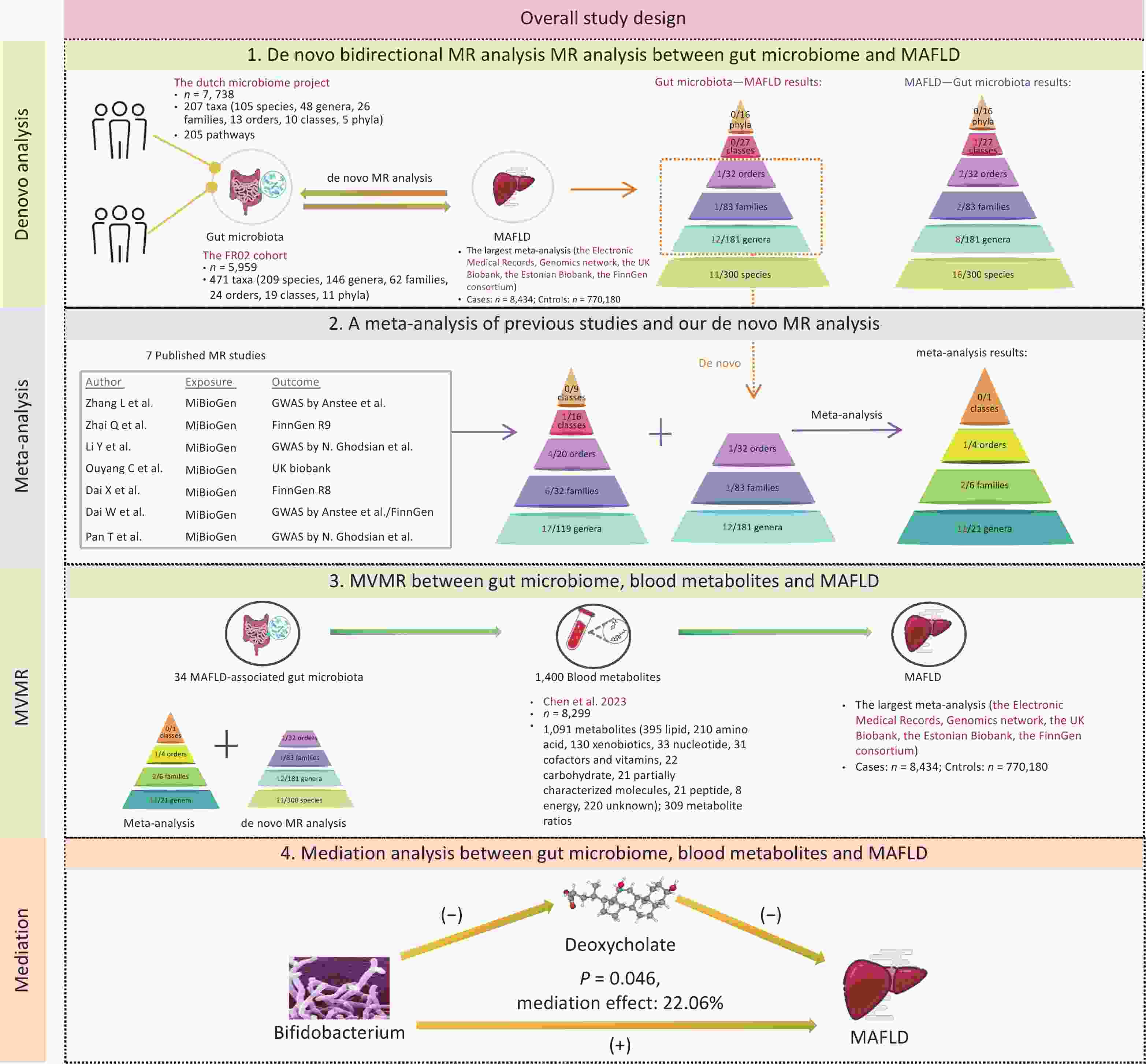 Objective Previous Mendelian randomization (MR) studies have suggested an association between the gut microbiome and metabolic-associated fatty liver disease (MAFLD). However, the reliance on 16S rRNA sequencing data has led to inconsistent findings and limited species-level insights. To address this, we conducted a de novo MR analysis using species-level shotgun metagenomic data, combined it with a meta-analysis to consolidate the existing evidence, and explored metabolite-mediated pathways. Methods Bidirectional MR analyses were performed between 883 gut microbiota taxa (derived from shotgun metagenomic genome-wide association study) and MAFLD. Published MR studies (up to December 1, 2024) were identified using PubMed, Embase, Web of Science, and the Cochrane Library for meta-analysis. Multivariable MR (MVMR) and mediation analyses were applied to assess the mediating effects of 1,400 blood metabolites. Results The de novo MR identified 25 MAFLD-associated microbial taxa. Integration with 7 published studies revealed 34 causal taxa, including 10 at the species level. Among the 1,400 metabolites, 53 showed causal links with MAFLD. MVMR and mediation analyses identified deoxycholate as a mediator of the effect of Bifidobacterium on MAFLD risk (22.06% mediation proportion). Conclusion This study elucidated the connections between species-level gut microbiota and MAFLD, highlighting the interplay between microbiota, metabolites, and disease pathogenesis. These findings provide novel insights into the potential therapeutic targets for MAFLD.