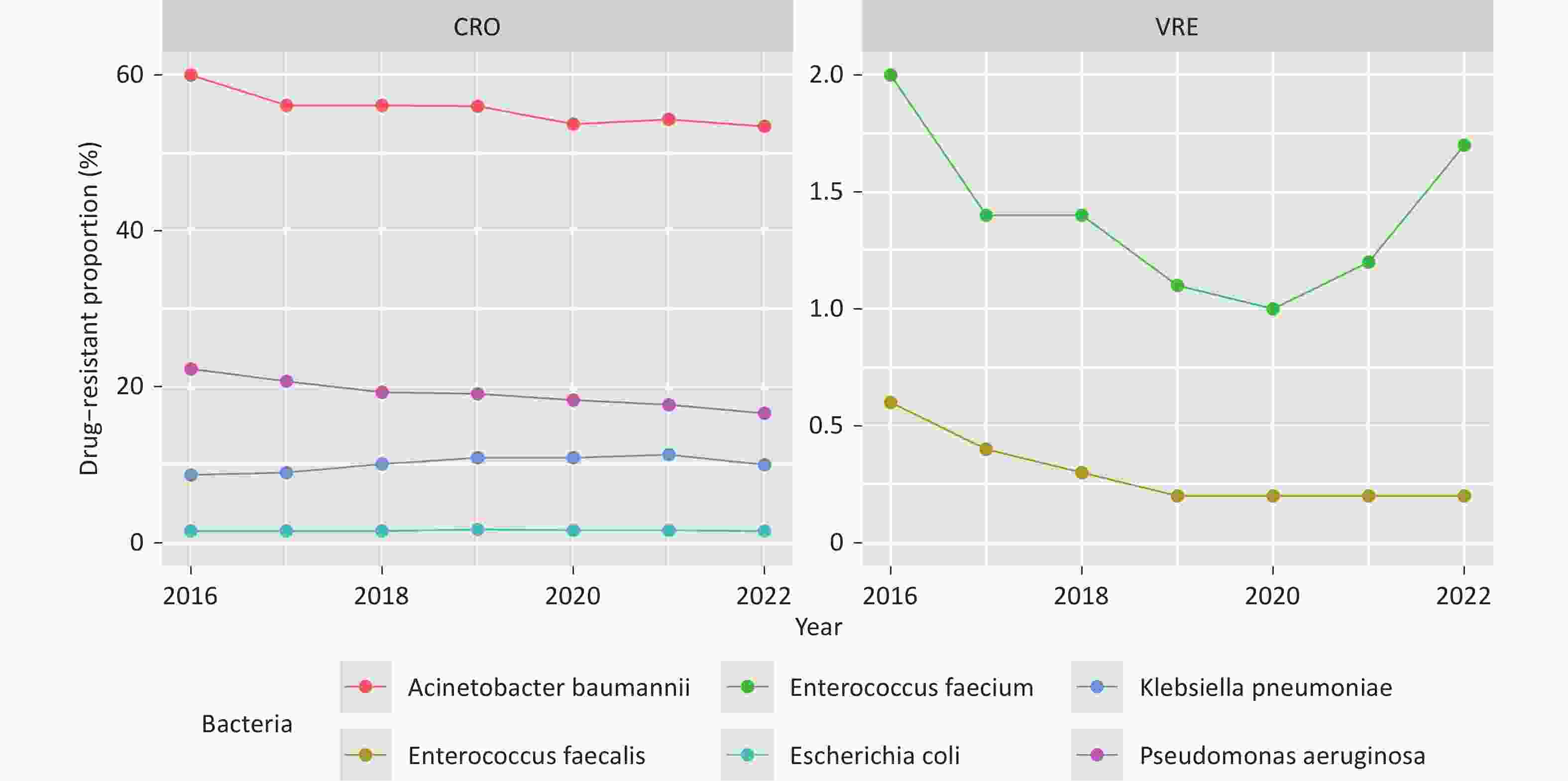 Objective To examine national trends in antibiotic consumption and antimicrobial resistance (AMR) among six WHO-priority bacterial pathogens in China from 2016 to 2022. Methods This ecological study analyzed national and provincial data from the China Antibacterial Resistance Surveillance System (CARSS) and the National Hospital Information Network. Beta regression models assessed temporal trends, and hierarchical models evaluated associations between antibiotic use and resistance. Results From 2016 to 2022, carbapenem resistance in Acinetobacter baumannii and Pseudomonas aeruginosa, and vancomycin resistance in Enterococcus faecium and E. faecalis significantly declined (β < 0, P < 0.010), while carbapenem-resistant Klebsiella pneumoniae increased (β = 0.081, P < 0.001). Nationwide antibiotic consumption rose across 10 major classes. Positive associations were found between carbapenem use and resistance in A. baumannii (z = 2.719, P = 0.007) and P. aeruginosa (z = 3.241, P = 0.001), and between vancomycin use and resistance in E. faecium (z = 4.510, P = 0.001) and E. faecalis (z = 3.210, P = 0.001). Conclusion Carbapenem-resistant K. pneumoniae increased significantly in China, while other resistant pathogens declined. Resistance patterns were linked to the use of multiple antibiotic classes, underscoring the need for strengthened antibiotic stewardship and surveillance.
