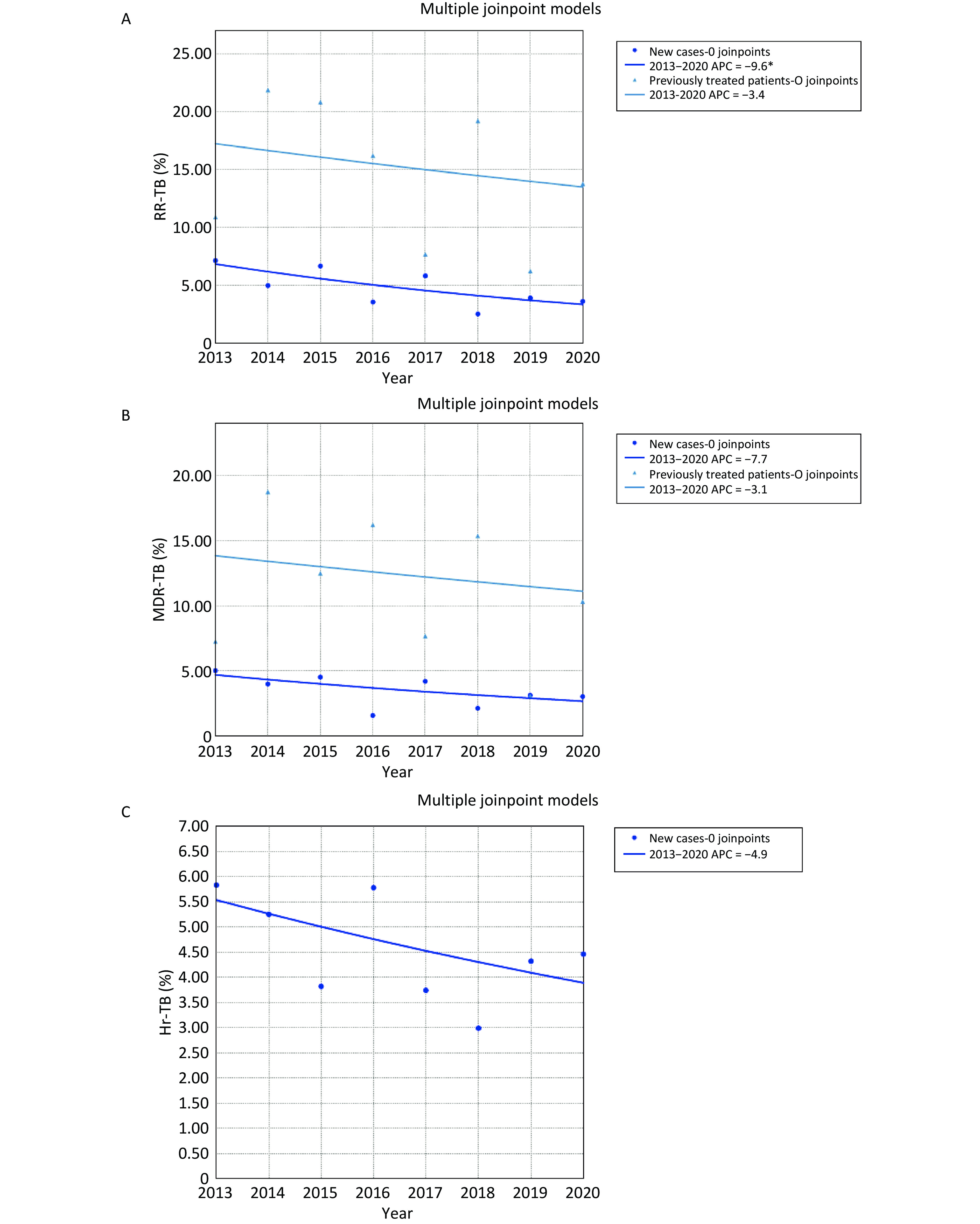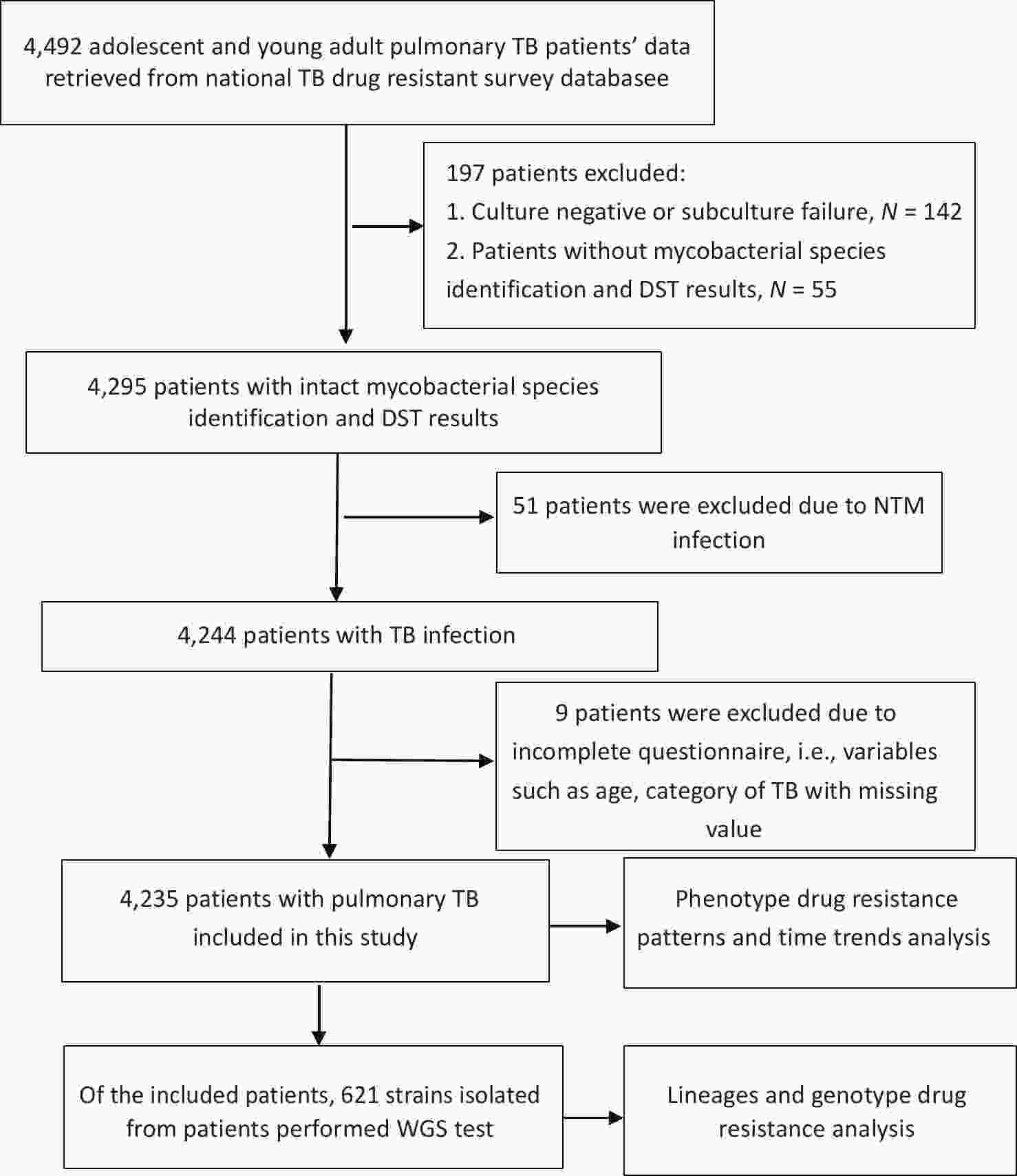 Objective To determine the proportions of drug-resistant tuberculosis (TB), its trends, and the drug resistance-conferring mutations among patients with pulmonary TB aged 10–24 years in China. Methods The data of patients with pulmonary TB were retrieved from a national drug-resistant TB survey for analysis. Joinpoint regression software was used to analyze time trends. We also used whole genome sequencing to analyze the lineages and drug resistance-conferring mutations of 621 isolates. Results Among 4,235 patients with pulmonary TB, the proportion of new cases of multidrug-resistant tuberculosis (MDR-TB) was 3.18% (95% confidence interval [CI]: 2.37–4.15) for adolescents and 3.76% (95% CI: 3.03–4.60) for young adults; for previously treated patients, MDR-TB accounted for 11.25% (95% CI: 5.28–20.28) of adolescents and 11.05% (95% CI: 6.88–16.55) of young adults. The proportion of patients with MDR-TB remained stable among both new and previously treated patients aged 10–24 years during the study period. Through whole genome sequencing, we found that the most common mutations in the MDR-TB strains were Ser315Thr in the katG gene (71.74%) and Ser450Leu in the rpoB gene (50.00%). Conclusion This study revealed a high proportion of MDR-TB among adolescents and young adults, indicating that urgent and comprehensive measures are needed to reduce the emergence and transmission of drug-resistant TB among this population in China.