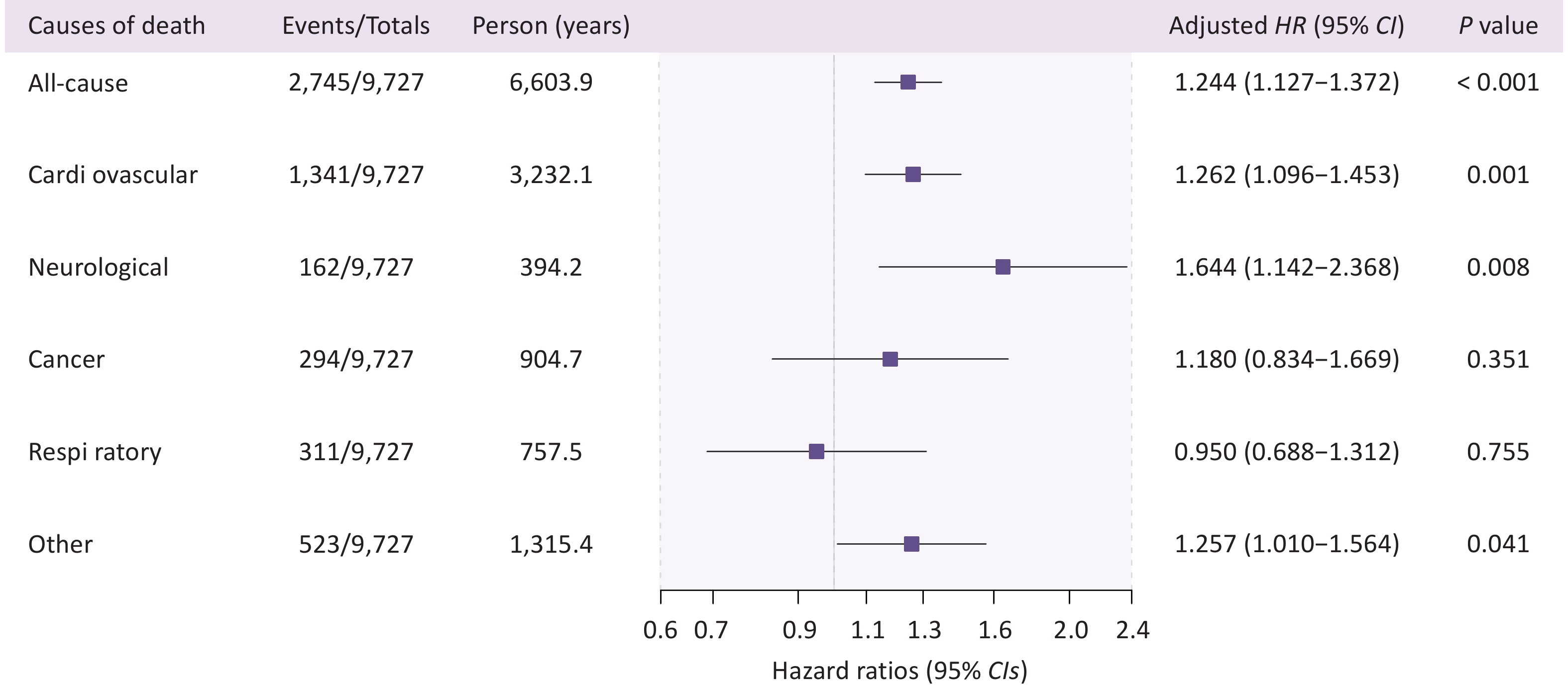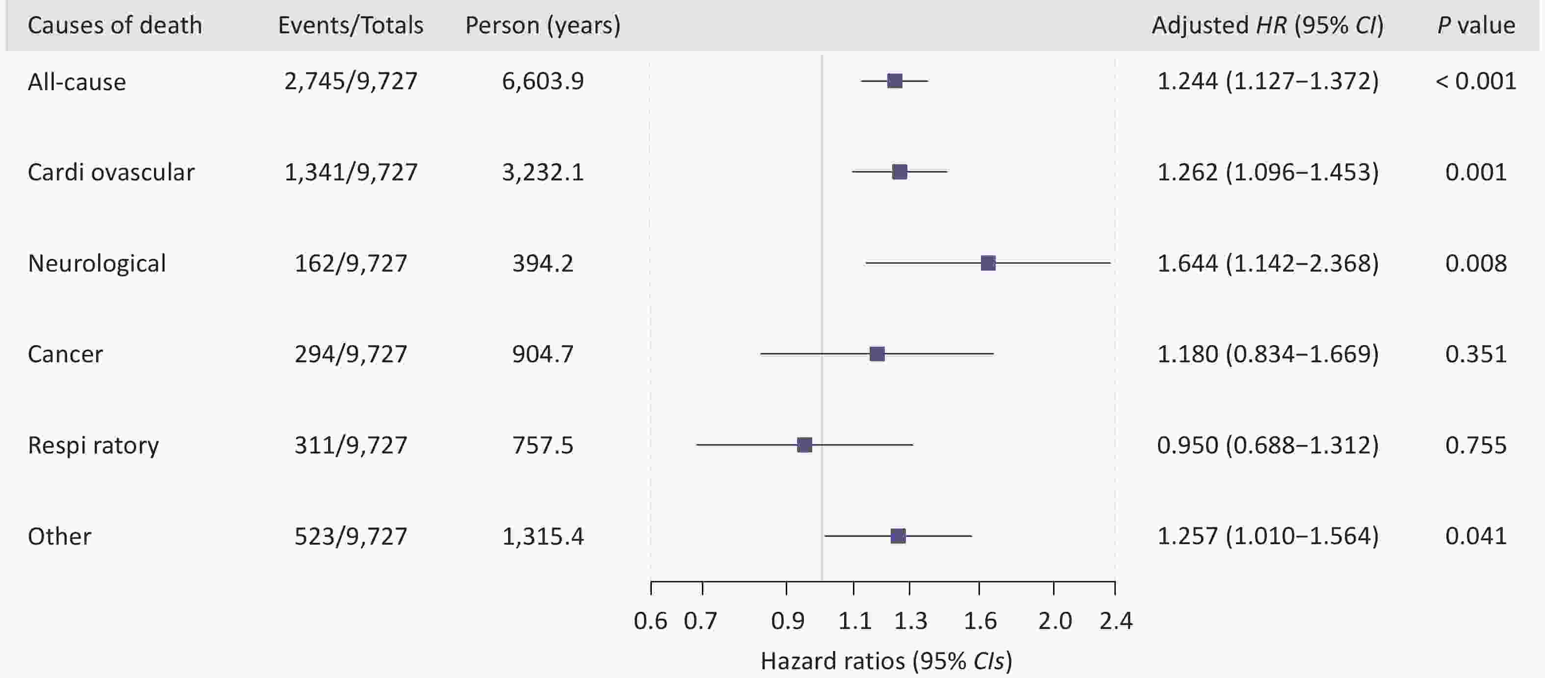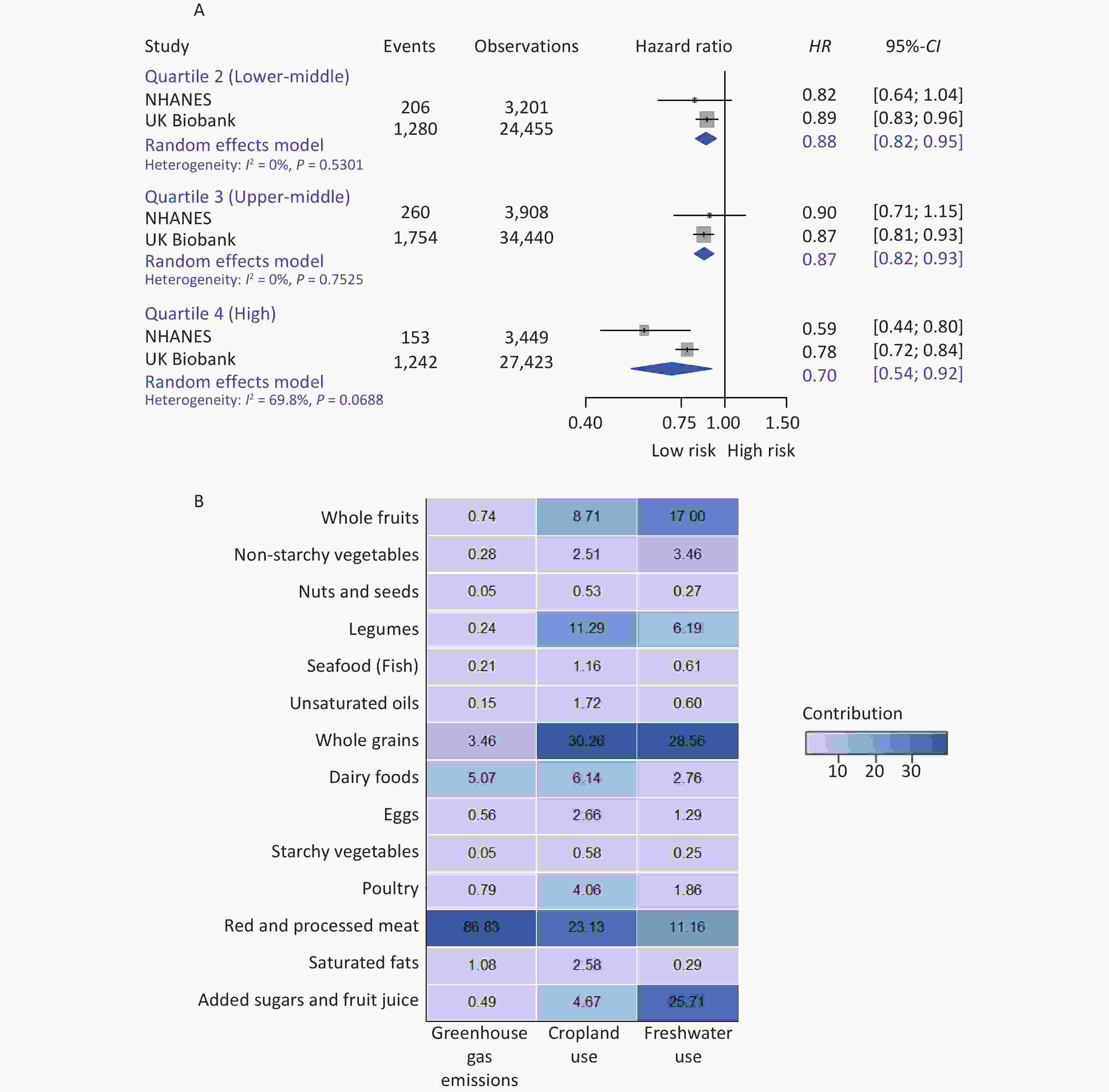 Whether adherence to the Planetary Health Diet (PHD) benefits human and environmental health is less known. We included 131,130 adults from the National Health and Nutrition Examination Survey and UK Biobank. Adherence to the PHD was measured using the Planetary Health Diet Index (PHDI) and mortality was ascertained by linking to national registries. Cox proportional hazards and linear/ordinal logistic regression models were used to analyze the association between PHD and the risk of mortality and environmental impacts, respectively. During a median follow-up of 10.6 years, participants in higher adherence groups (Quartile 2: hazard ratio = 0.88, 95% confidence interval = 0.82–0.95; Quartile 3: 0.87, 0.82–0.93; Quartile 4: 0.70, 0.54–0.92) had a lower risk of mortality, compared to Quartile 1. The relationship between the PHDI and mortality showed linearity in the two cohorts (P = 0.1877 and 0.5456, respectively), and body mass index mediated 11.88% of the relationship. A higher PHDI was associated with lower greenhouse gas emissions but higher freshwater use. Our findings suggest that greater compliance with the PHD reduces mortality risk; however, its benefits for environmental sustainability are less certain.
