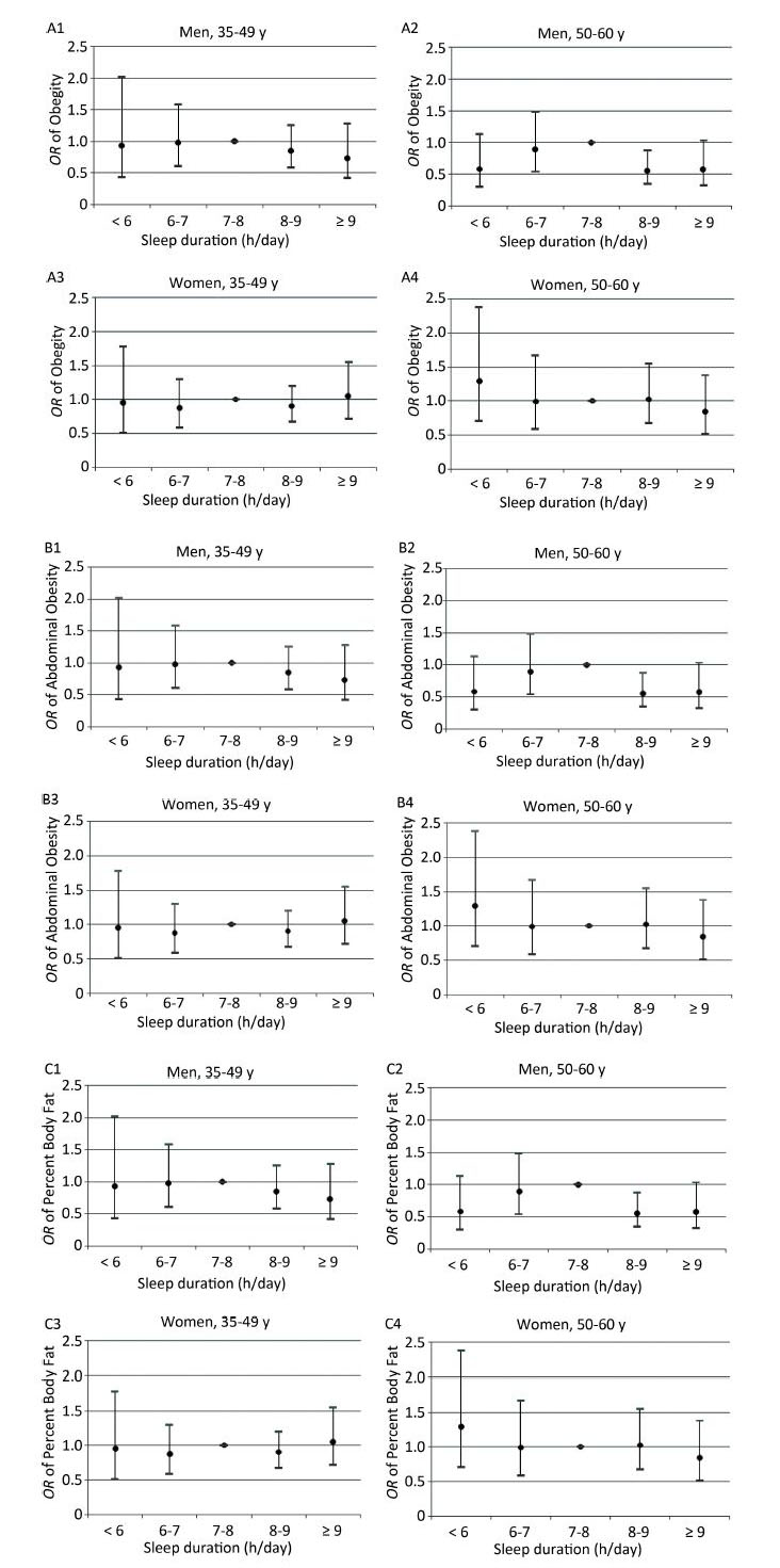 Objective To examine the association between habitual sleep duration and obesity among Chinese adults.Methods The association of sleep duration and obesity was investigated among 7,094 community-dwelling Chinese adults. Sleep duration was self-reported. In this study, obesity was defined as follows: body mass index (BMI) ≥ 28 kg/m2, waist circumference (WC) ≥ 85 cm in men and ≥ 80 cm in women, and percent body fat (% BF) ≥ 25 in men and ≥ 35 in women. Logistic and quantile regressions were employed to examine relationships of interest.Results Overall, 6.42% of the participants reported short sleep durations (<6 h/d) while 14.71% reported long (≥ 9 h/d) sleep durations. Long sleepers (≥ 9 h/d) represented a greater frequency of women with obesity [odds ratio (OR): 1.30; 95% confidence interval (CI), 1.02-1.67] and high body fat (1.43, 1.04-1.96) than those who slept 7-8 h/d. An association between long sleep times and higher BMI estimations was found across the 10th-75th percentile of the BMI distribution. Among men, long sleepers (≥ 9 h/d) presented lower risks of developing abdominal obesity compared with individuals who slept 7-8 h/d (OR=0.79, 95% CI: 0.44-0.99).Conclusion Our study suggests that long sleep durations are associated with general obesity in Chinese women but reduced waist circumferences in men. Confirmatory studies are needed to determine the heterogeneous association of sleep time and obesity by gender.