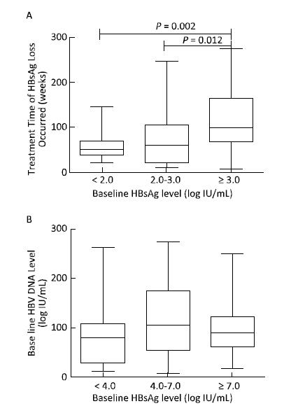 Objective To explore the predictive value of baseline HBsAg level and early response for HBsAg loss in patients with HBeAg-positive chronic hepatitis B during pegylated interferon alpha-2a treatment.Methods A total of 121 patients with HBeAg-positive chronic hepatitis B who achieved HBsAg loss were enrolled; all patients were treated with PEG-IFNα-2a 180 μg/week. Serum HBV DNA and serological indicators (HBsAg, anti-HBs, HBeAg, and anti-HBe) were determined before and every 3 months during treatment.Results The median treatment time for HBsAg loss was 84 weeks (7-273 weeks), and 74.38% (90 cases) of the patients needed extended treatment (> 48 weeks). The correlation between baseline HBsAg levels and the treatment time of HBsAg loss was significant (B=14.465, t=2.342, P=0.021). Baseline HBsAg levels together with the decline range of HBsAg at 24 weeks significantly correlated with the treatment time of HBsAg loss (B=29.862, t=4.890, P=0.000 and B=27.993, t=27.993, P=0.005).Conclusion Baseline HBsAg levels and extended therapy are critical steps toward HBsAg loss. Baseline HBsAg levels together with early response determined the treatment time of HBsAg loss in patients with HBeAg-positive chronic hepatitis B during pegylated interferon alpha-2a treatment.
