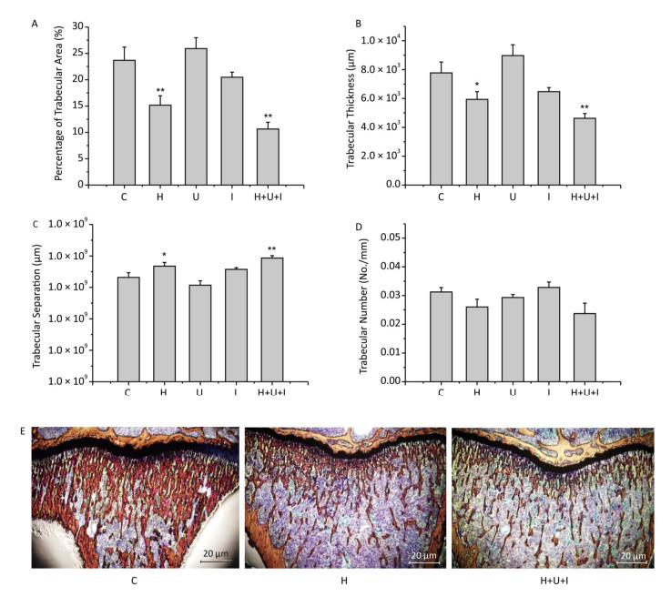 Objective To better understand the pathological causes of bone loss in a space environment, including microgravity, ionizing radiation, and ultradian rhythms.Methods Sprague Dawley (SD) rats were randomly divided into a baseline group, a control group, a hindlimb suspension group, a radiation group, a ultradian rhythms group and a combined-three-factor group. After four weeks of hindlimb suspension followed by X-ray exposure and/or ultradian rhythms, biomechanical properties, bone mineral density, histological analysis, microstructure parameters, and bone turnover markers were detected to evaluate bone loss in hindlimbs of rats.Results Simulated microgravity or combined-three factors treatment led to a significant decrease in the biomechanical properties of bones, reduction in bone mineral density, and deterioration of trabecular parameters. Ionizing radiation exposure also showed adverse impact while ultradian rhythms had no significant effect on these outcomes. Decrease in the concentration of the turnover markers bone alkaline phosphatase (bALP), osteocalcin (OCN), and tartrate-resistant acid phosphatase-5b (TRAP-5b) in serum was in line with the changes in trabecular parameters.Conclusion Simulated microgravity is the main contributor of bone loss. Radiation also results in deleterious effects but ultradian rhythms has no significant effect. Combined-three factors treatment do not exacerbate bone loss when compared to simulated microgravity treatment alone.