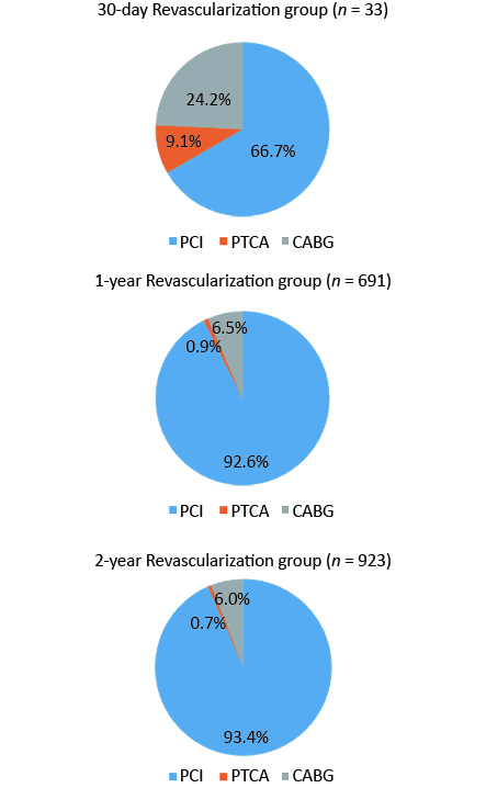 Objective To analyze factors associated with unplanned revascularization (UR) risk in patients with coronary artery disease (CAD) who underwent percutaneous coronary intervention (PCI).Methods A total of 10,640 cases with CAD who underwent PCI were analyzed. Multivariate COX regressions and competing risk regressions were applied.Results The patients who underwent UR following PCI in 30 days, 1, and 2 years accounted for 0.3%, 6.5%, and 8.7%, respectively. After multivariate adjustment, the number of target lesions [hazard ratio (HR) = 2.320; 95% confidence interval (CI): 1.643–3.277; P < 0.001], time of procedure (HR = 1.006; 95% CI: 1.001–1.010; P = 0.014), body mass index (HR = 1.104; 95% CI: 1.006–1.210; P = 0.036), incomplete revascularization (ICR) (HR = 2.476; 95% CI: 1.030–5.952; P = 0.043), and age (HR = 1.037; 95% CI: 1.000–1.075; P = 0.048) were determined as independent risk factors of 30-day UR. Factors, including low-molecular-weight heparin or fondaparinux (HR = 0.618; 95% CI: 0.531–0.719; P < 0.001), second-generation durable polymer drug-eluting stent (HR = 0.713; 95% CI: 0.624–0.814; P < 0.001), left anterior descending artery involvement (HR = 0.654; 95% CI: 0.530–0.807; P < 0.001), and age (HR = 0.992; 95% CI: 0.985–0.998; P = 0.014), were independently associated with decreased two-year UR risk. While, Synergy Between Percutaneous Coronary Intervention with Taxus and Cardiac Surgery score (HR = 1.024; 95% CI: 1.014–1.033; P < 0.001) and ICR (HR = 1.549; 95% CI: 1.290–1.860; P < 0.001) were negatively associated with two-year UR risk.Conclusion Specific factors were positively or negatively associated with short- and medium-long-term UR following PCI.
