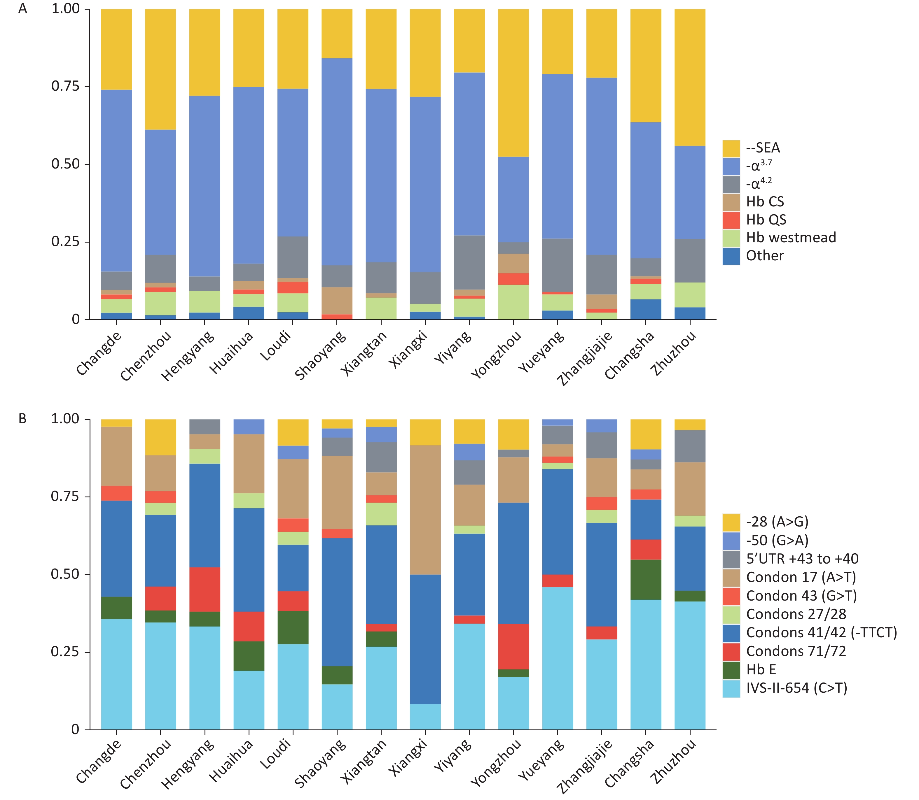 Objective This study was aimed at investigating the carrier rate of, and molecular variation in, α- and β-globin gene mutations in Hunan Province.Methods We recruited 25,946 individuals attending premarital screening from 42 districts and counties in all 14 cities of Hunan Province. Hematological screening was performed, and molecular parameters were assessed.Results The overall carrier rate of thalassemia was 7.1%, including 4.83% for α-thalassemia, 2.15% for β-thalassemia, and 0.12% for both α- and β-thalassemia. The highest carrier rate of thalassemia was in Yongzhou (14.57%). The most abundant genotype of α-thalassemia and β-thalassemia was -α3.7/αα (50.23%) and βIVS-II-654/βN (28.23%), respectively. Four α-globin mutations [CD108 (ACC>AAC), CAP +29 (G>C), Hb Agrinio and Hb Cervantes] and six β-globin mutations [CAP +8 (C>T), IVS-II-848 (C>T), -56 (G>C), beta nt-77 (G>C), codon 20/21 (-TGGA) and Hb Knossos] had not previously been identified in China. Furthermore, this study provides the first report of the carrier rates of abnormal hemoglobin variants and α-globin triplication in Hunan Province, which were 0.49% and 1.99%, respectively.Conclusion Our study demonstrates the high complexity and diversity of thalassemia gene mutations in the Hunan population. The results should facilitate genetic counselling and the prevention of severe thalassemia in this region.
