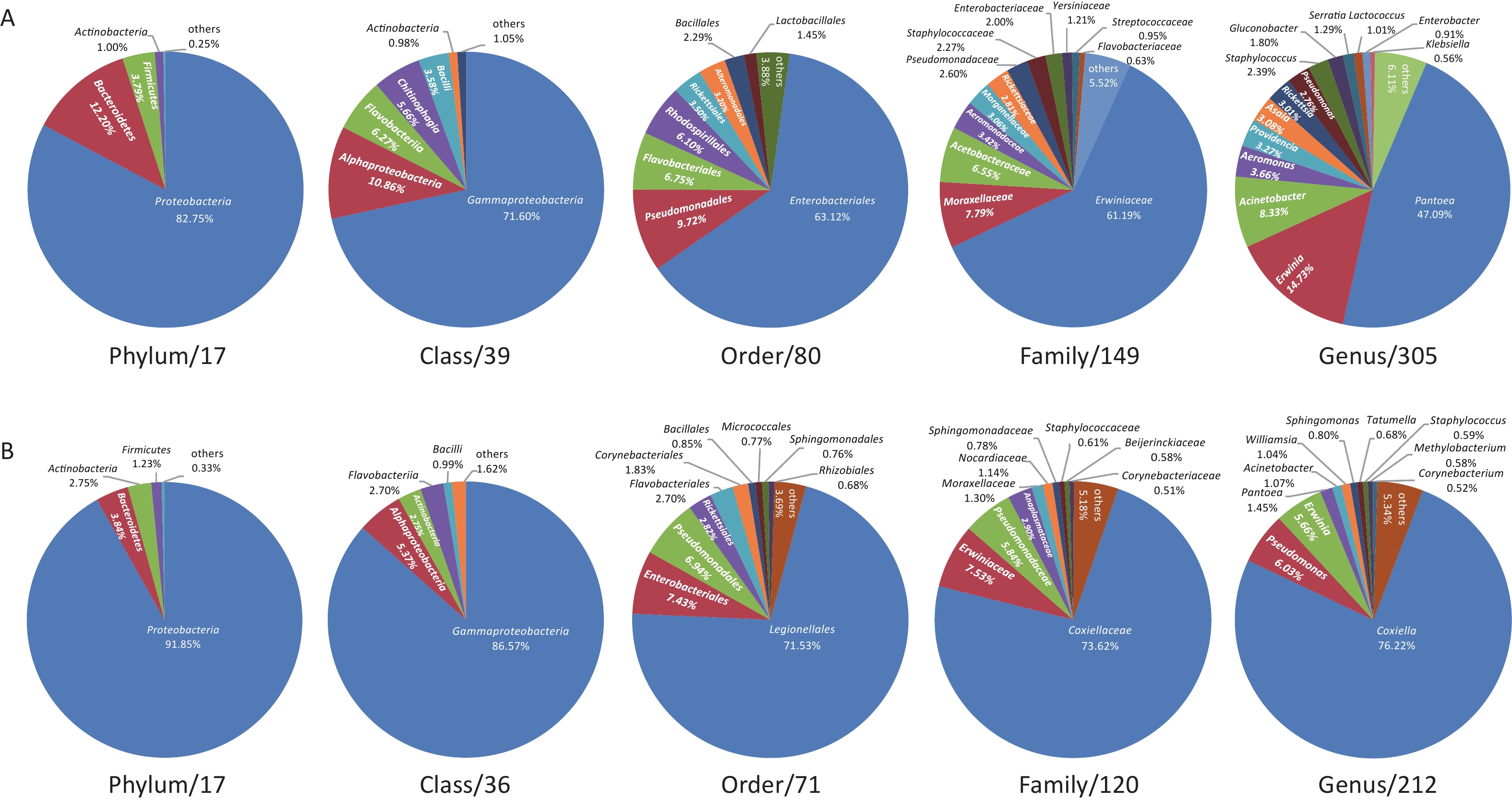 Objective The purpose of this study was to investigate the bacterial communities of biting midges and ticks collected from three sites in the Poyang Lake area, namely, Qunlu Practice Base, Peach Blossom Garden, and Huangtong Animal Husbandry, and whether vectors carry any bacterial pathogens that may cause diseases to humans, to provide scientific basis for prospective pathogen discovery and disease prevention and control.Methods Using a metataxonomics approach in concert with full-length 16S rRNA gene sequencing and operational phylogenetic unit (OPU) analysis, we characterized the species-level microbial community structure of two important vector species, biting midges and ticks, including 33 arthropod samples comprising 3,885 individuals, collected around Poyang Lake.Results A total of 662 OPUs were classified in biting midges, including 195 known species and 373 potentially new species, and 618 OPUs were classified in ticks, including 217 known species and 326 potentially new species. Surprisingly, OPUs with potentially pathogenicity were detected in both arthropod vectors, with 66 known species of biting midges reported to carry potential pathogens, including Asaia lannensis and Rickettsia bellii, compared to 50 in ticks, such as Acinetobacter lwoffii and Staphylococcus sciuri. We found that Proteobacteria was the most dominant group in both midges and ticks. Furthermore, the outcomes demonstrated that the microbiota of midges and ticks tend to be governed by a few highly abundant bacteria. Pantoea sp7 was predominant in biting midges, while Coxiella sp1 was enriched in ticks. Meanwhile, Coxiella spp., which may be essential for the survival of Haemaphysalis longicornis Neumann, were detected in all tick samples. The identification of dominant species and pathogens of biting midges and ticks in this study serves to broaden our knowledge associated to microbes of arthropod vectors.Conclusion Biting midges and ticks carry large numbers of known and potentially novel bacteria, and carry a wide range of potentially pathogenic bacteria, which may pose a risk of infection to humans and animals. The microbial communities of midges and ticks tend to be dominated by a few highly abundant bacteria.
