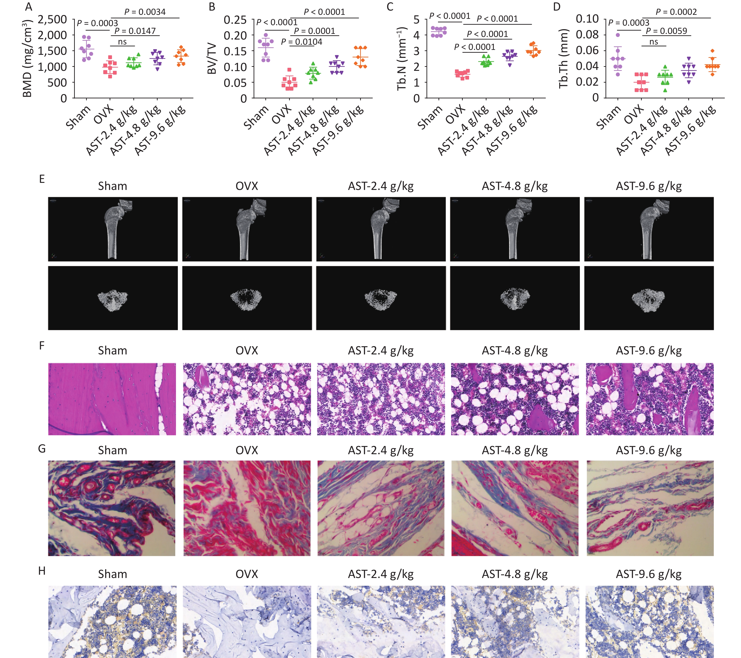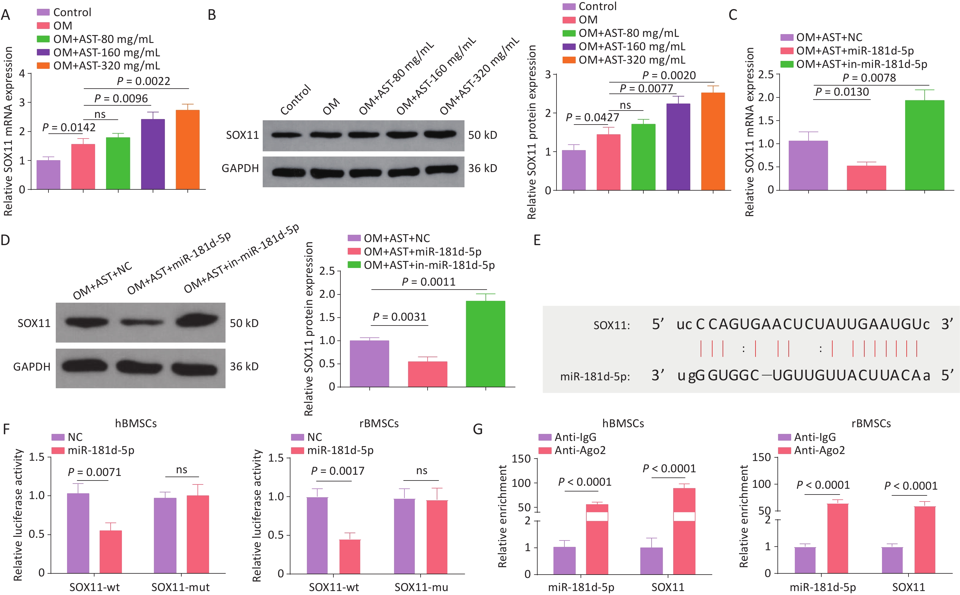 Objective   This study aimed to investigate the effect of Astragalus (AST) on osteoporosis (OP) and the downstream mechanisms.  Methods  Human bone marrow-derived mesenchymal stem cells (hBMSCs) were induced to differentiate into osteogenic cells. After transfection with relevant plasmids, cell proliferation, cell cycle progression, and apoptosis were assessed. Alizarin red staining was used to detect calcium nodules in the cells, alkaline phosphatase (ALP) staining was used to detect ALP activity in the cells, and quantitative reverse transcription-polymerase chain reaction and western blotting were used to determine RUNX2 and Osterix expression levels. An OP rat model was established using ovariectomy and micro-computed tomography scanning. Hematoxylin and eosin staining and Masson’s trichrome staining were used to evaluate the pathological conditions of bone tissues, while immunohistochemistry was conducted to detect RUNX2 in bone tissues.  Results   AST promoted the osteogenic differentiation of BMSCs, reduced miR-181d-5p expression levels, and increased SOX11 expression levels. Restoring miR-181d-5p expression or reducing SOX11 expression levels reversed the effects of AST on the osteogenic differentiation of hBMSCs. miR-181d-5p was found to target SOX11 in hBMSCs. AST improved OP in rats, and miR-181d-5p overexpression or SOX11 inhibition reversed the therapeutic effects of AST on OP in rats.  Conclusion  AST promoted the osteogenic differentiation of hBMSCs and alleviated OP by targeting SOX11 via miR-181d-5p.