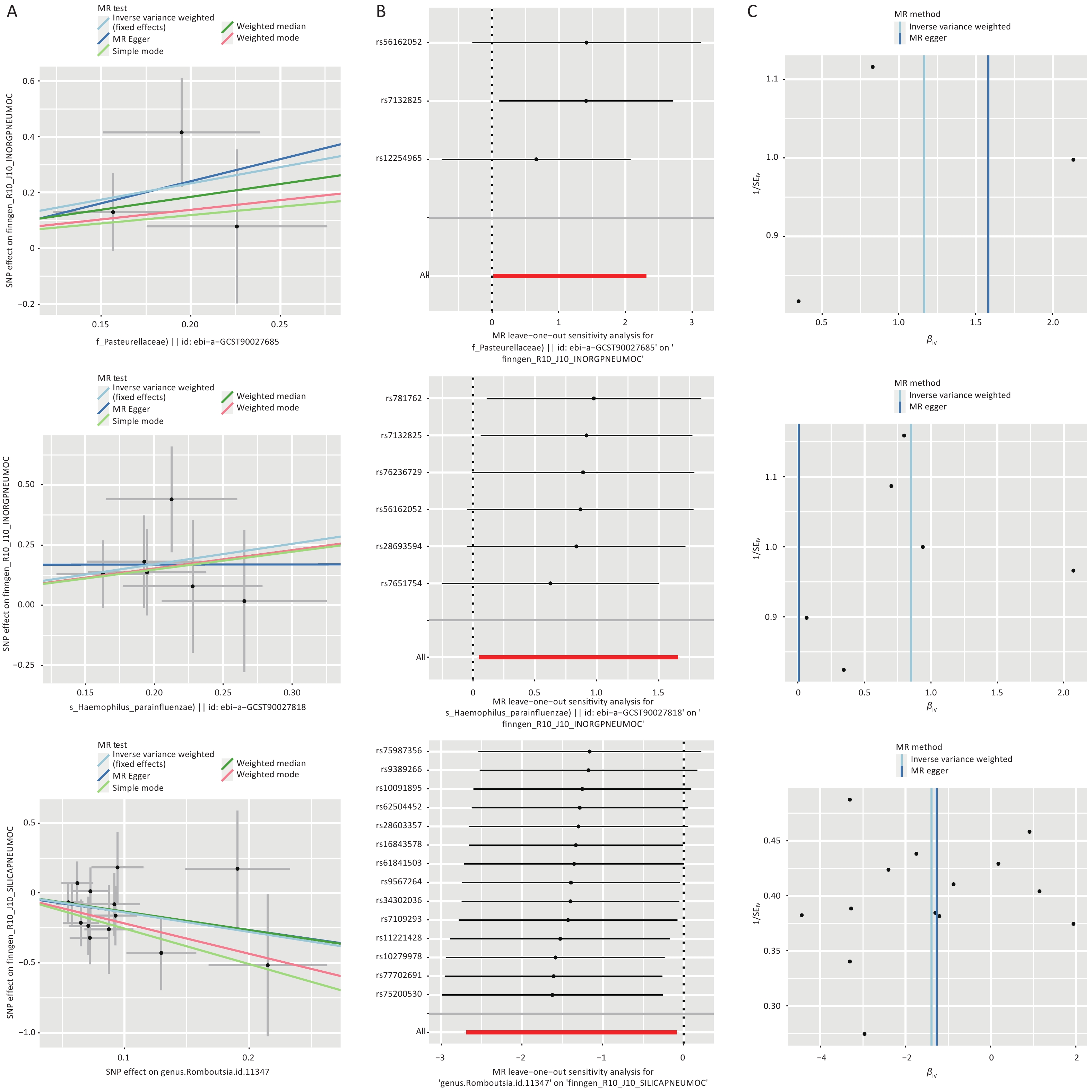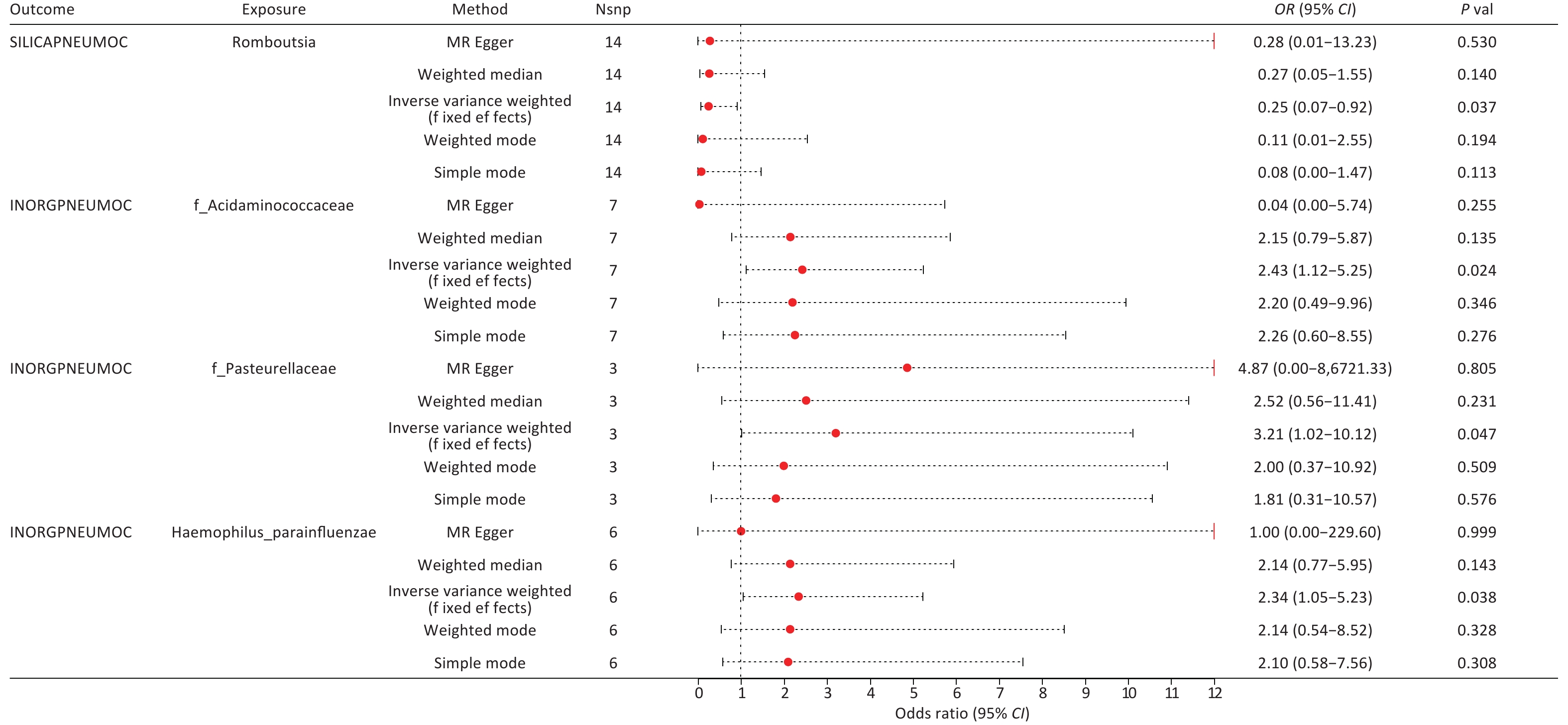 Objective  Pneumoconiosis, a lung disease caused by irreversible fibrosis, represents a significant public health burden. This study investigates the causal relationships between gut microbiota, gene methylation, gene expression, protein levels, and pneumoconiosis using a multi-omics approach and Mendelian randomization (MR).  Methods  We analyzed gut microbiota data from MiBioGen and Esteban et al. to assess their potential causal effects on pneumoconiosis subtypes (asbestosis, silicosis, and inorganic pneumoconiosis) using conventional and summary-data-based MR (SMR). Gene methylation and expression data from Genotype-Tissue Expression and eQTLGen, along with protein level data from deCODE and UK Biobank Pharma Proteomics Project, were examined in relation to pneumoconiosis data from FinnGen. To validate our findings, we assessed self-measured gut flora from a pneumoconiosis cohort and performed fine mapping, drug prediction, molecular docking, and Phenome-Wide Association Studies to explore relevant phenotypes of key genes.  Results  Three core gut microorganisms were identified: Romboutsia (OR = 0.249) as a protective factor against silicosis, Pasteurellaceae (OR = 3.207) and Haemophilus parainfluenzae (OR = 2.343) as risk factors for inorganic pneumoconiosis. Additionally, mapping and quantitative trait loci analyses revealed that the genes VIM, STX8, and MIF were significantly associated with pneumoconiosis risk.  Conclusions  This multi-omics study highlights the associations between gut microbiota and key genes (VIM, STX8, MIF) with pneumoconiosis, offering insights into potential therapeutic targets and personalized treatment strategies.
