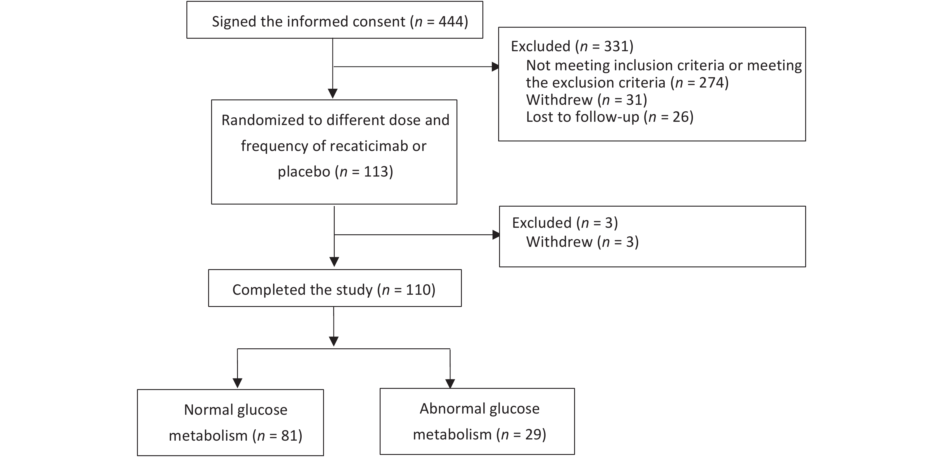 Objective  Recaticimab (SHR-1209) significantly reduces low-density lipoprotein cholesterol levels. However, its effect on glucose metabolism remains unclear. This study aimed to evaluate its effect on glycemic parameters in a Chinese population.  Methods  Recaticimab versus placebo was administered in a 5:1 ratio to 110 hyperlipidemia patients who were followed up for 24 weeks. Glycated hemoglobin (HbA1c) levels were measured at baseline every 12 weeks. Fasting plasma glucose (FPG) levels were measured at baseline at week 1, 3, 5, 8, 12, 16, 20, and 24. Repeated-measures mixed-effects models were used to determine the longitudinal association between reacticimab and FPG and HbA1c levels.  Results  Among the 81 participants with normal glucose metabolism, HbA1c levels significantly decreased (F = 4.568, P = 0.036). In the 29 participants with abnormal glucose metabolism, a significant time effect was observed for FPG levels (F = 2.492, P = 0.016). For participants with normal and abnormal glucose metabolism, no significant group × time interaction effects on FPG or HbA1c levels were identified.  Conclusion  Recaticimab showed no adverse glycemic effects in participants with normal or abnormal glucose metabolism, indicating its safety in patients with or without diabetes.