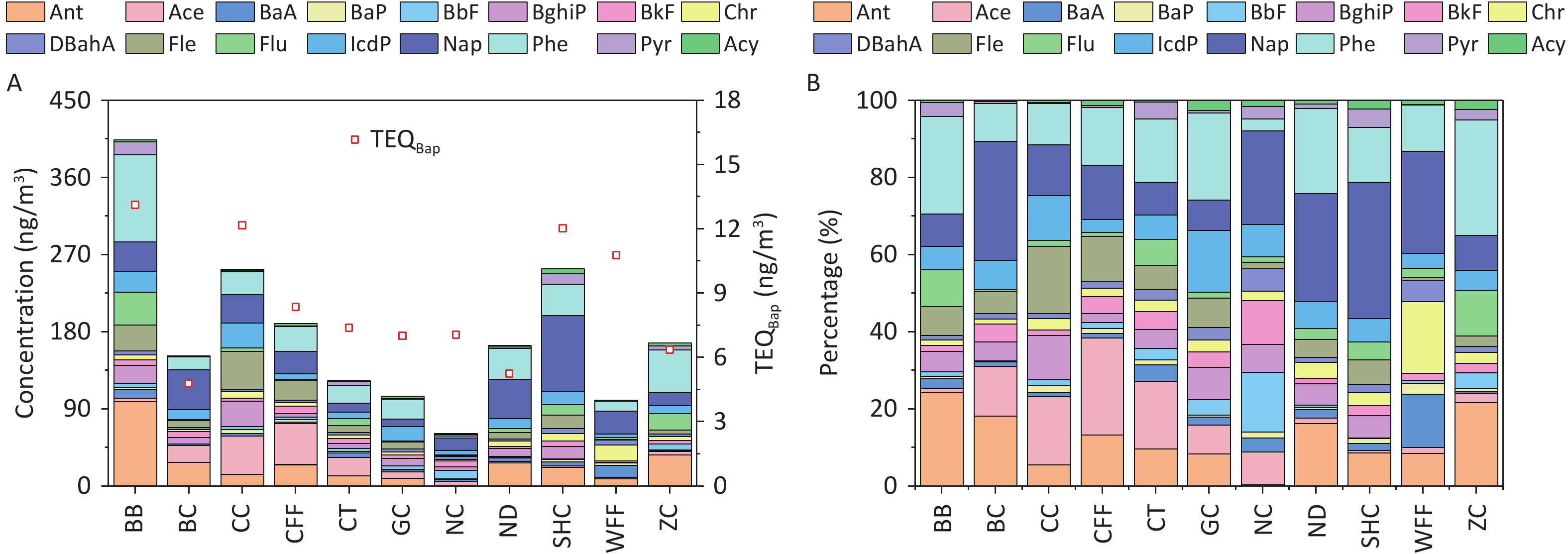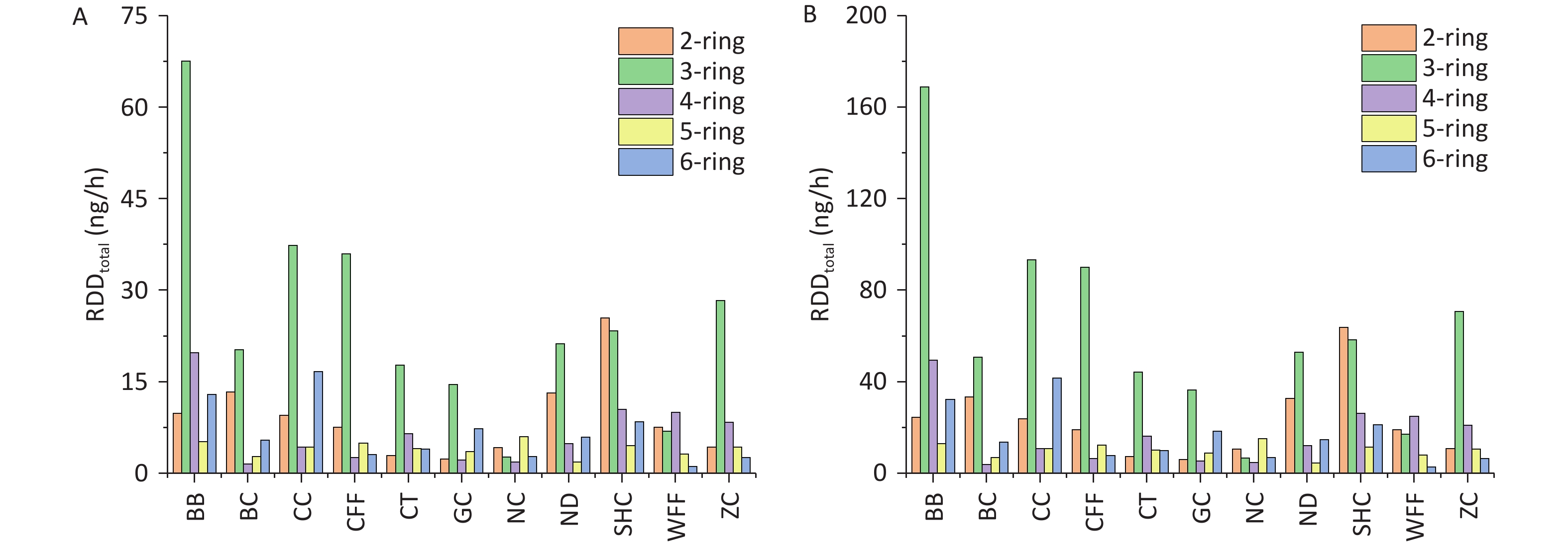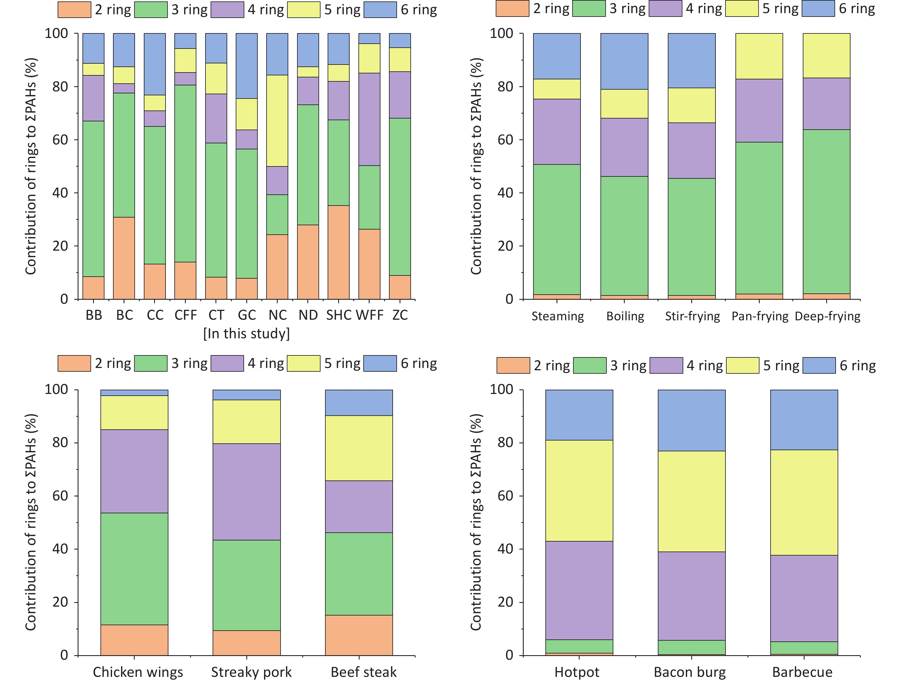 Objectives  To characterize fine particulate matter (PM2.5)-bound polycyclic aromatic hydrocarbons (PAHs) emitted from different cooking fumes and their exposure routes and assess their health-associated impact to provide a reference for health risk prevention from PAH exposure across different age and sex groups.  Methods  Sixteen PM2.5-bound PAHs emitted from 11 cooking styles were analyzed using GC-MS/MS. The health hazards of these PAHs in the Handan City population (stratified by age and sex) were predicted using the incremental lifetime cancer risk (ILCR) model. The respiratory deposition doses (RDDs) of the PAHs in children and adults were calculated using the PM2.5 deposition rates in the upper airway, tracheobronchial, and alveolar regions.  Results  The total concentrations of PM2.5-bound PAHs ranged from 61.10 to 403.80 ng/m3. Regardless of cooking styles, the ILCRtotal values for adults (1.23 × 10−6 to 3.70 × 10−6) and older adults (1.28 × 10−6 to 3.88 × 10−6) exceeded the acceptable limit of 1.00 × 10–6. With increasing age, the ILCRtotal value first declined and then increased, varying substantially among the population groups. Cancer risk exhibited particularly high sensitivity to short exposure to barbecue-derived PAHs under equivalent body weights. Furthermore, barbecue, Sichuan and Hunan cuisine, Chinese cuisine, and Chinese fast food were associated with higher RDDs for both adults and children.  Conclusion  ILCRtotal values exceeded the acceptable limit for both females and males of adults, with all cooking styles showing a potentially high cancer risk. Our findings serve as an important reference for refining regulatory strategies related to catering emissions and mitigating health risks associated with cooking styles.