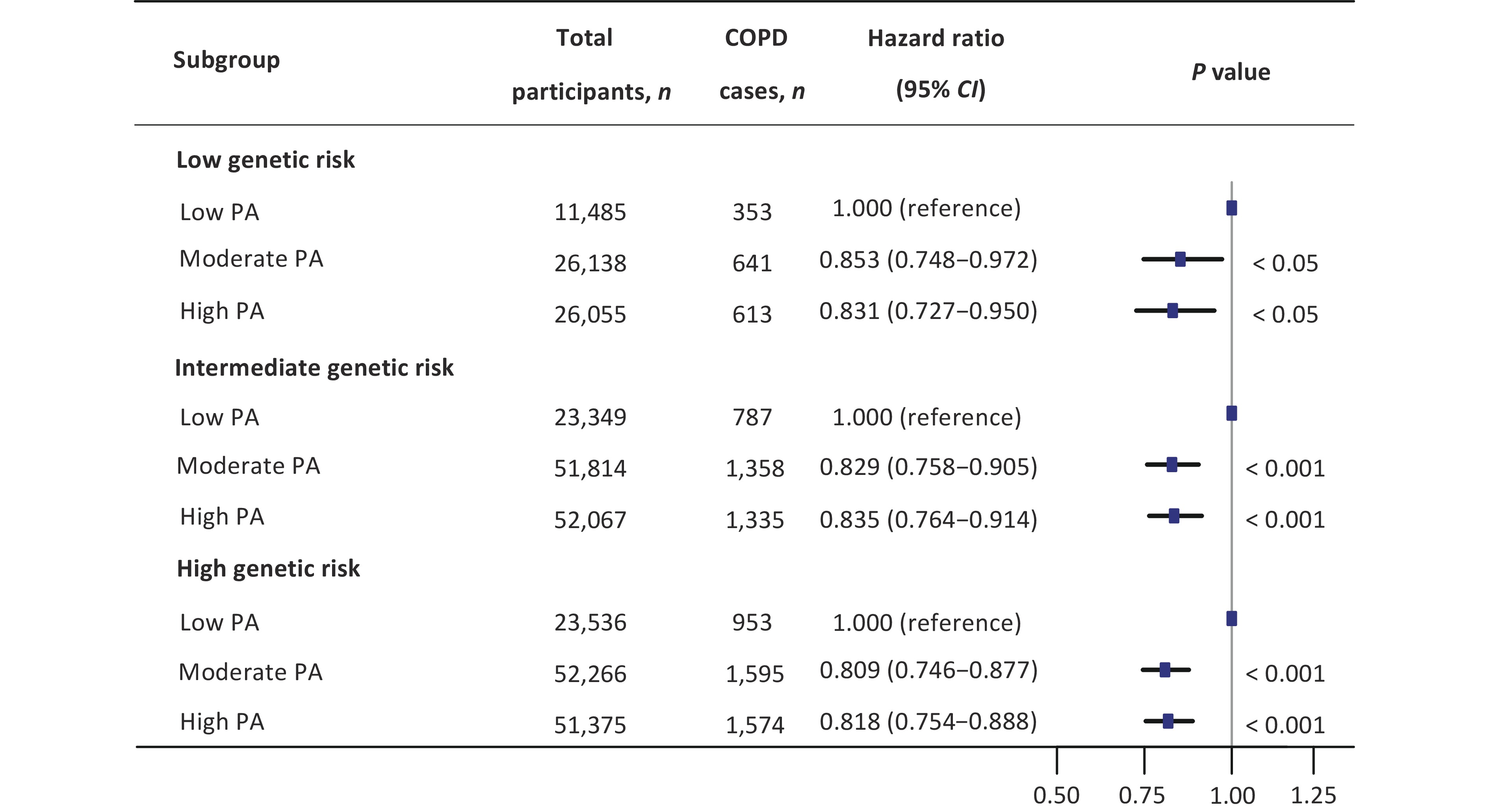 Objective   To investigate the relationship between physical activity and genetic risk and their combined effects on the risk of developing chronic obstructive pulmonary disease.  Methods   This prospective cohort study included 318,085 biobank participants from the UK. Physical activity was assessed using the short form of the International Physical Activity Questionnaire. The participants were stratified into low-, intermediate-, and high-genetic-risk groups based on their polygenic risk scores. Multivariate Cox regression models and multiplicative interaction analyses were used.  Results   During a median follow-up period of 13 years, 9,209 participants were diagnosed with chronic obstructive pulmonary disease. For low genetic risk, compared to low physical activity, the hazard ratios (HRs) for moderate and high physical activity were 0.853 (95% confidence interval [CI]: 0.748–0.972) and 0.831 (95% CI: 0.727–0.950), respectively. For intermediate genetic risk, the HRs were 0.829 (95% CI: 0.758–0.905) and 0.835 (95% CI: 0.764–0.914), respectively. For participants with high genetic risk, the HRs were 0.809 (95% CI: 0.746–0.877) and 0.818 (95% CI: 0.754–0.888), respectively. A significant interaction was observed between genetic risk and physical activity.  Conclusion   Moderate or high levels of physical activity were associated with a lower risk of developing chronic obstructive pulmonary disease across all genetic risk groups, highlighting the need to tailor activity interventions for genetically susceptible individuals.