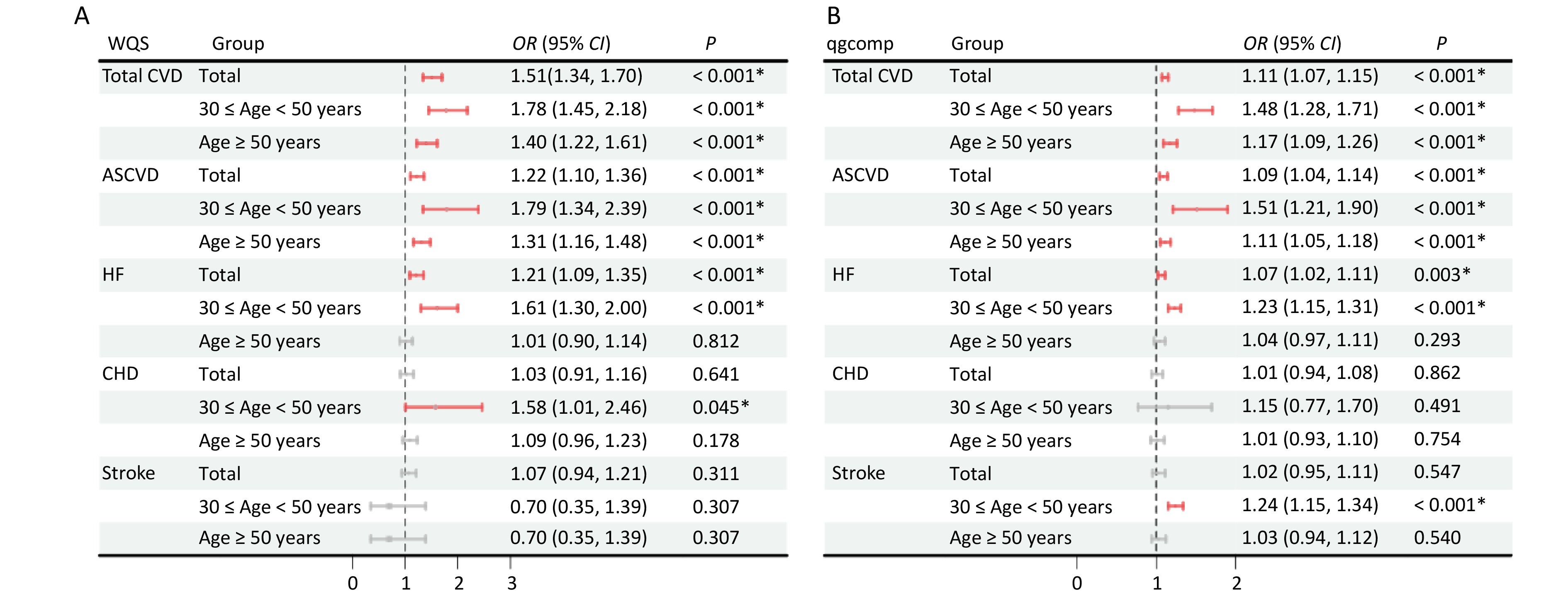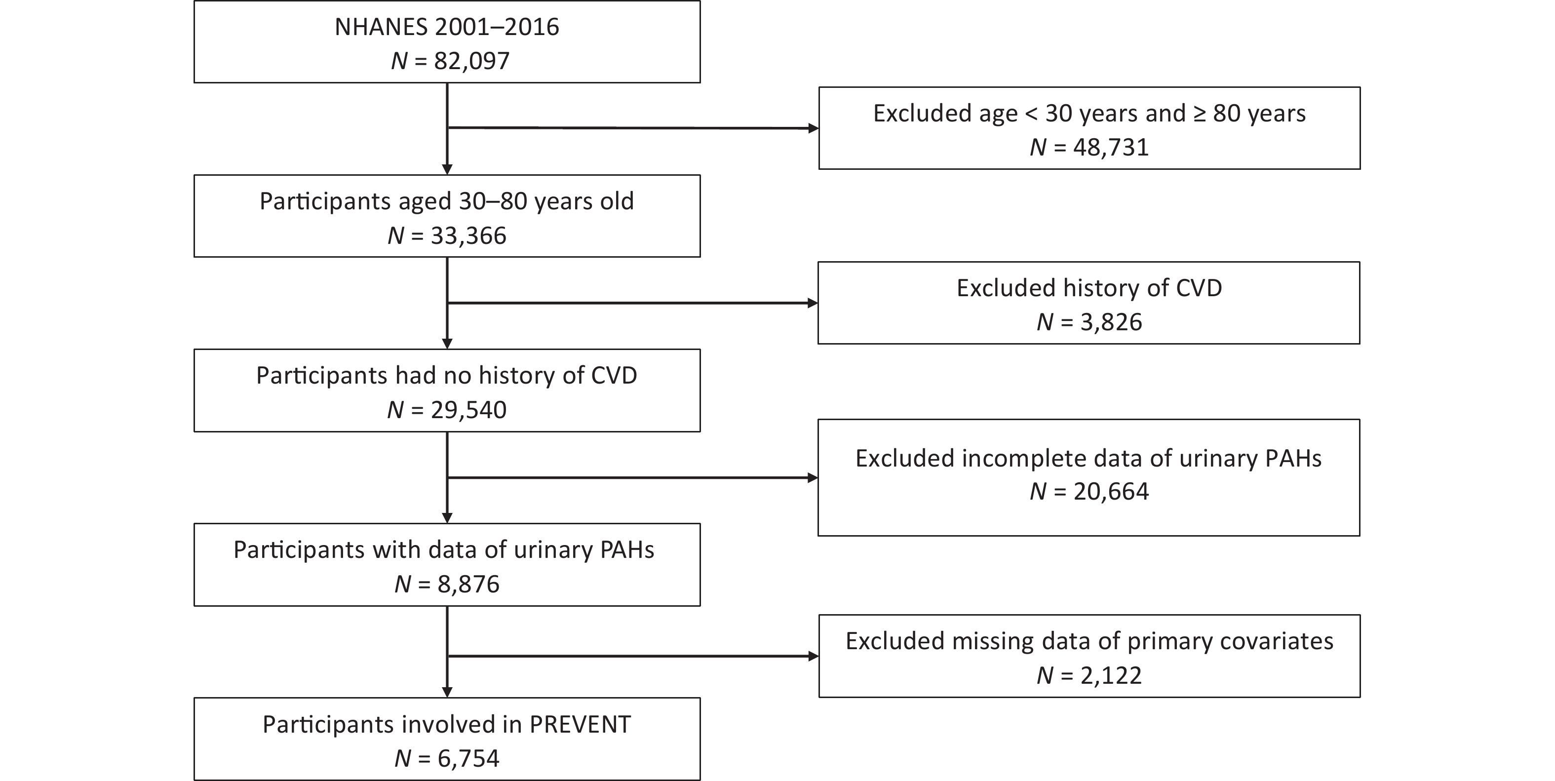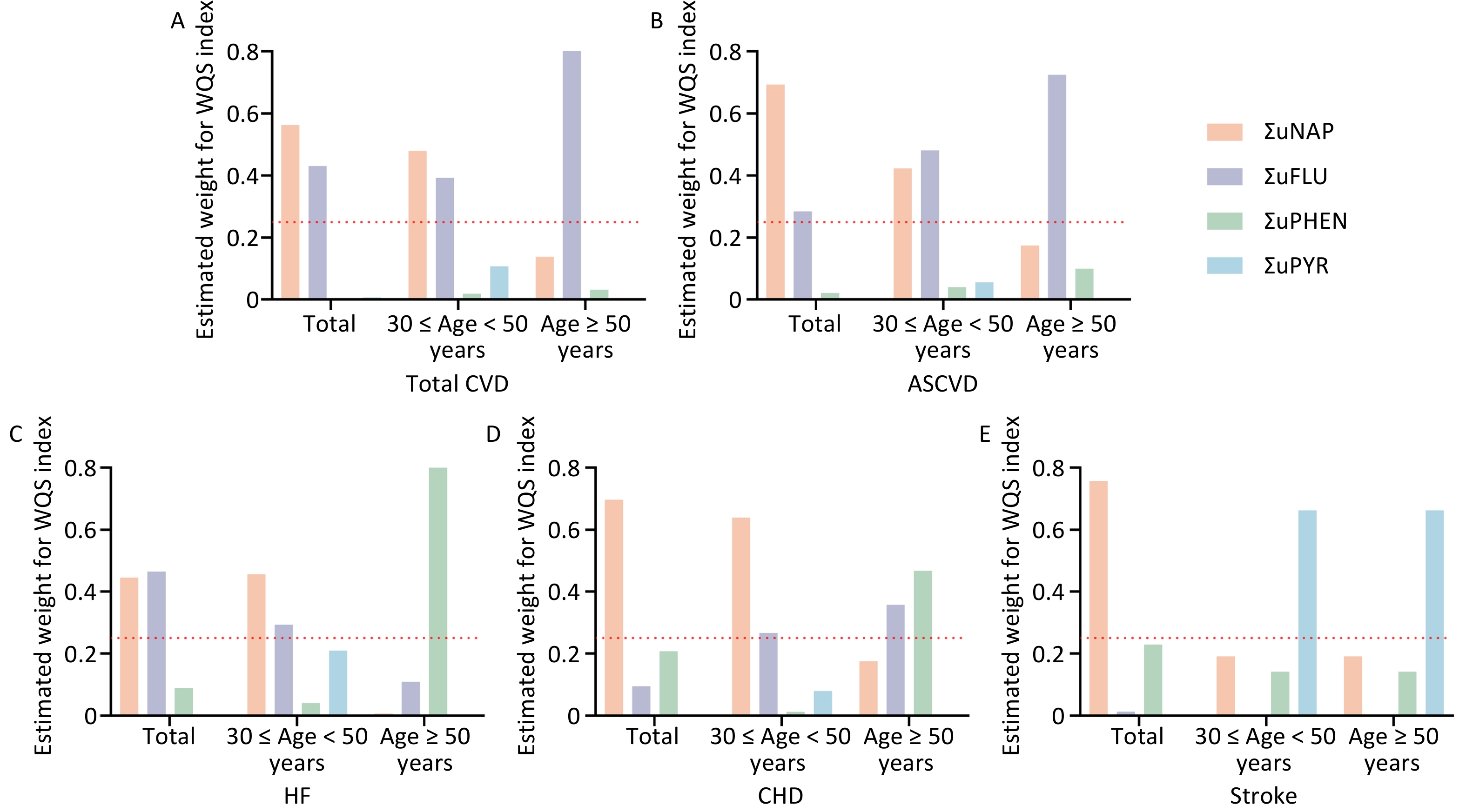 Objective   To investigate the association of various polycyclic aromatic hydrocarbon (PAH) metabolites with diverse subtypes of cardiovascular disease (CVD) risk.  Methods  A novel predicting risk of cardiovascular disease EVENTs PREVENT equation was used to estimate the 10-year diverse subtypes of CVD risk, and their associations with PAH metabolites were analyzed using multiple logistic regression models, the weighted quantile sum (WQS) model, the quantile g-computation (qgcomp) model, and a stratified analysis of subgroups.  Results   For this study, six thousand seven hundred and forty-five participants were selected, and significant positive associations were observed between PAHs, naphthalene (NAP), and fluorene (FLU), and the risks of total CVD, atherosclerotic cardiovascular disease (ASCVD), and heart failure (HF). NAP and FLU were the primary contributors to the effects of PAH mixtures, and their associations with total CVD, ASCVD, and HF risk were significant in younger participants (30 ≤ age < 50 years); however, the associations of phenanthrene (PHEN) with ASCVD, HF, coronary heart disease (CHD), and stroke were dominant in aging participants (age ≥ 50 years). Notably, pyrene (PYR) was negatively associated with the risk of ASCVD, HF, CHD, and stroke. Similarly, negative associations of PYR with the four CVD subtypes were noticeable in aging participants.  Conclusion   Different PAHs metabolites had different impacts on each CVD subtype among different age groups. Notably, the protective effects of PYR on ASCVD, HF, CHD, and stroke were noticeable in aging individuals.