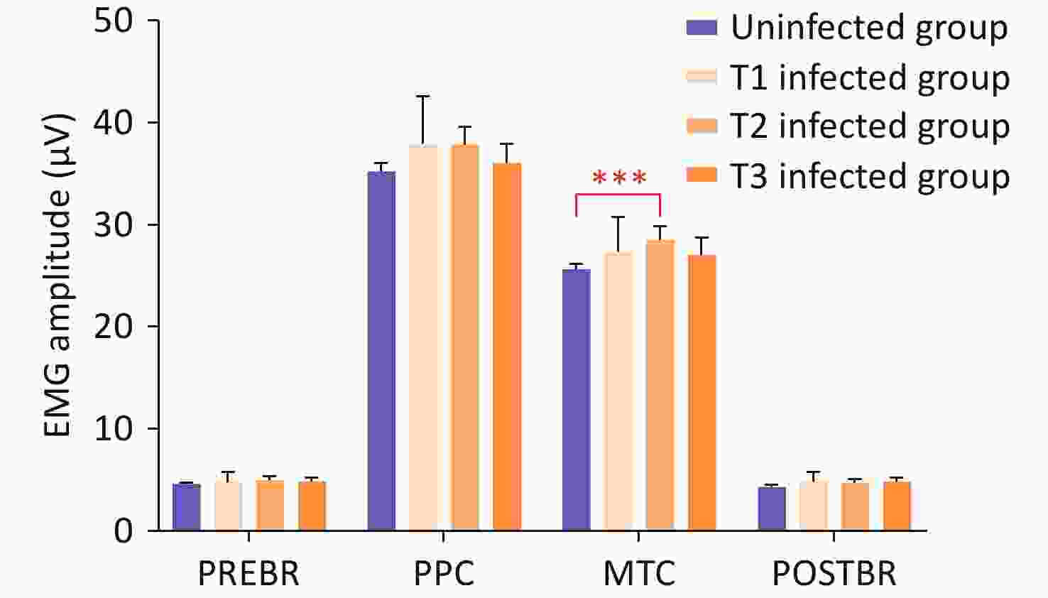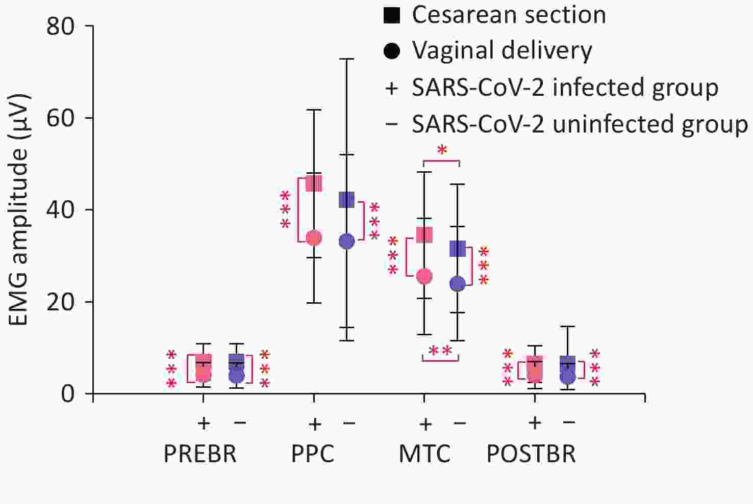 EMG values for PPC (P = 0.045), MTC (P < 0.001), and POSTBR (P = 0.045) were significantly higher in the SARS-CoV-2 infected group than in the uninfected group. Stratified analyses showed that MTC was significantly higher in the SARS-CoV-2 infected group among women who underwent either vaginal delivery (P = 0.008) or cesarean section (P = 0.013) (Figure 2). The general linear model identified SARS-CoV-2 infection as an independent factor influencing MTC (P = 0.001), with no significant main effects on other EMG values (Table 4). Additionally, an interaction between SARS-CoV-2 infection and the mode of delivery was observed for PPC (P = 0.046). Women who underwent cesarean section showed higher EMG values than those who underwent vaginal delivery (Figure 2). The main effects of mode of delivery indicated that PREBR (P < 0.001), PPC (P < 0.001), MTC (P < 0.001), and POSTBR (P < 0.001) were all higher in women who underwent cesarean section (Table 4).