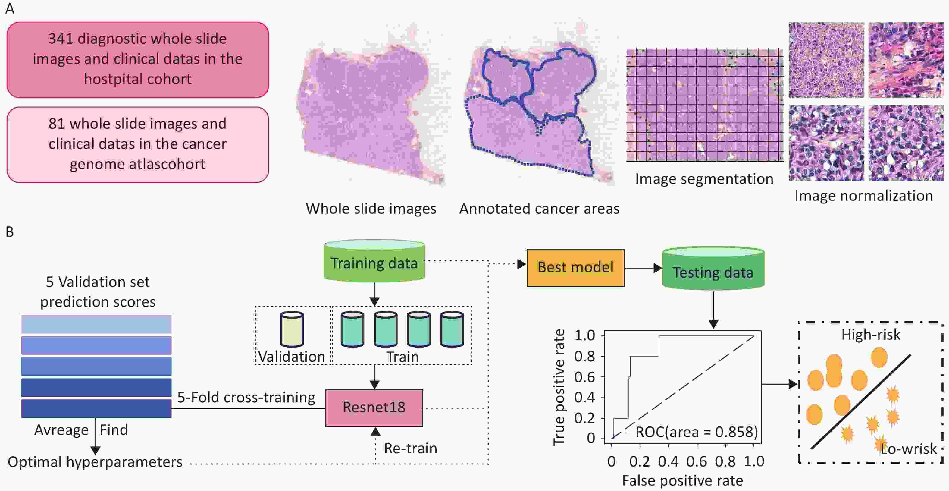 TNBC is a highly aggressive subtype of breast cancer, characterized by the absence of well-defined biomarkers and effective targeted therapies[24]. Compared with other subtypes, TNBC exhibits earlier relapse and a poorer prognosis[3]. Consequently, accurate prognostic prediction is essential for guiding clinical decision-making and optimizing treatment strategies. H&E-stained pathological sections remain a cornerstone in routine clinical diagnostics due to their low cost and accessibility. With the rapid integration of deep learning into digital pathology, several studies have demonstrated its potential for predicting cancer prognosis using histopathological WSIs[7-8]. However, because of the relatively low incidence of TNBC, large-scale image-based prognostic modeling studies in this subtype remain limited.
