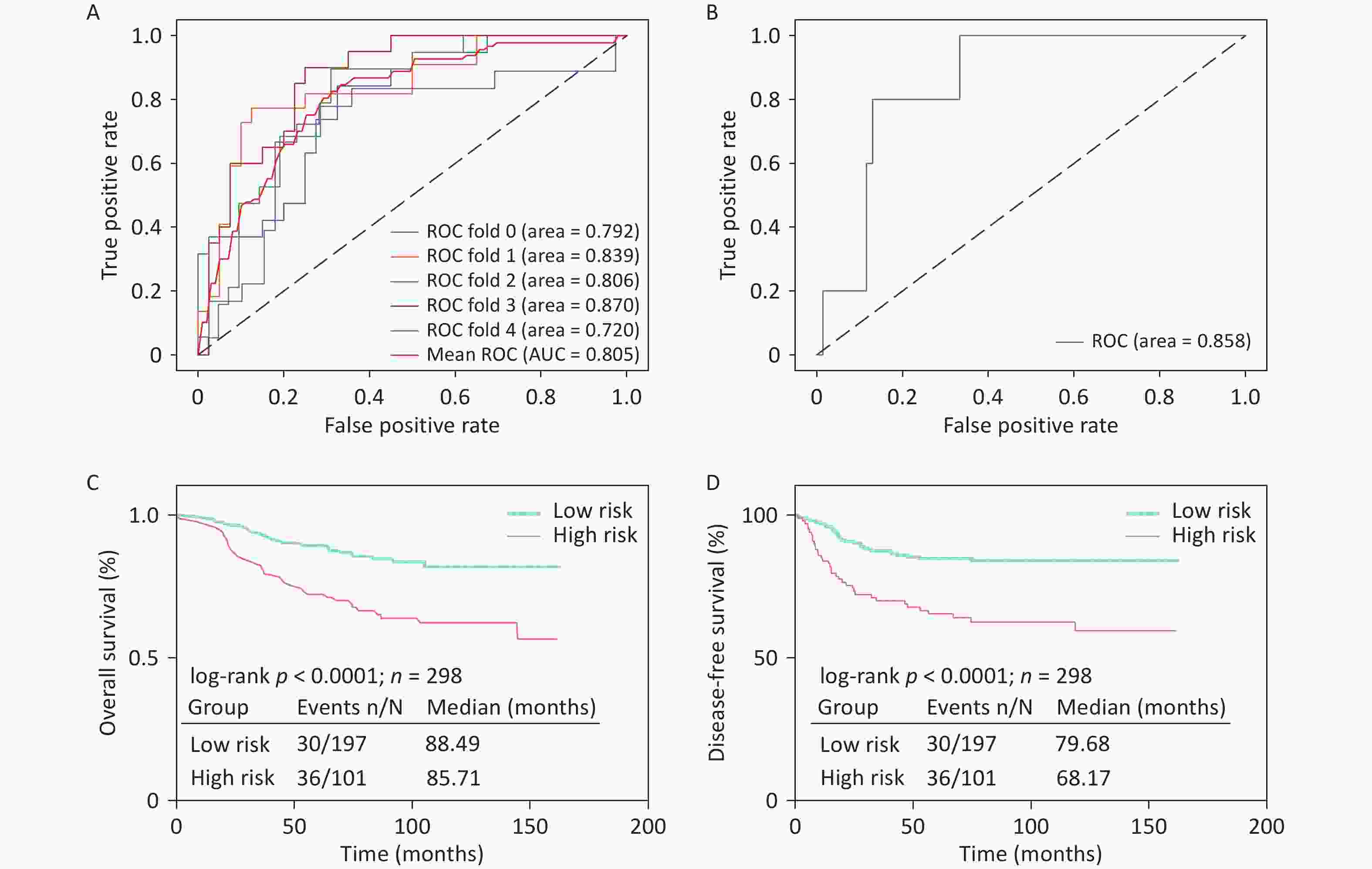 Based on the model predictions, patients classified as having recurrence or metastasis were defined as the high-risk group, while those predicted to be non-recurrent were categorized as the low-risk group. Survival analyses were performed for overall survival (OS) and disease-free survival (DFS) according to the model-predicted risk categories (Figure 3C, D). The results showed statistically significant differences between the groups, with the model-predicted low-risk group demonstrating superior outcomes for both OS and DFS, further validating the predictive accuracy of the model.