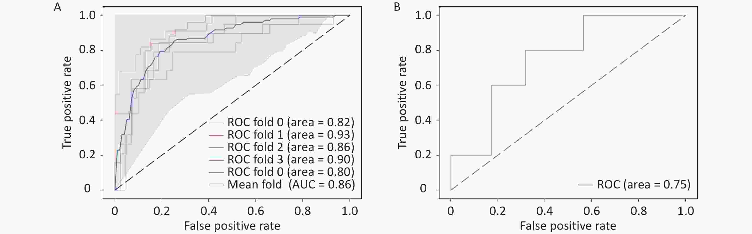 To further improve the performance and interpretability of the prediction model, we incorporated clinical data to enhance decision-making accuracy. We then used MCB to linearly fuse the deep learning features extracted from pathological images with the five selected clinicopathological features. The resulting model, trained with five-fold cross-validation, achieved an AUC of 0.86 (Figure 4A), demonstrating a significant improvement over the image-only model. Additionally, the accuracy, precision, recall, and F1-score were 0.806, 0.702, 0.690, and 0.693, respectively, substantially higher than those obtained without clinical data integration. These findings indicate that including clinicopathological information effectively enhances model performance and supports more accurate predictions. Furthermore, model interpretability was improved by incorporating clinical variables. External validation using the TCGA dataset yielded an AUC of 0.75 (Figure 4B), confirming the generalizability of the multimodal prediction model.