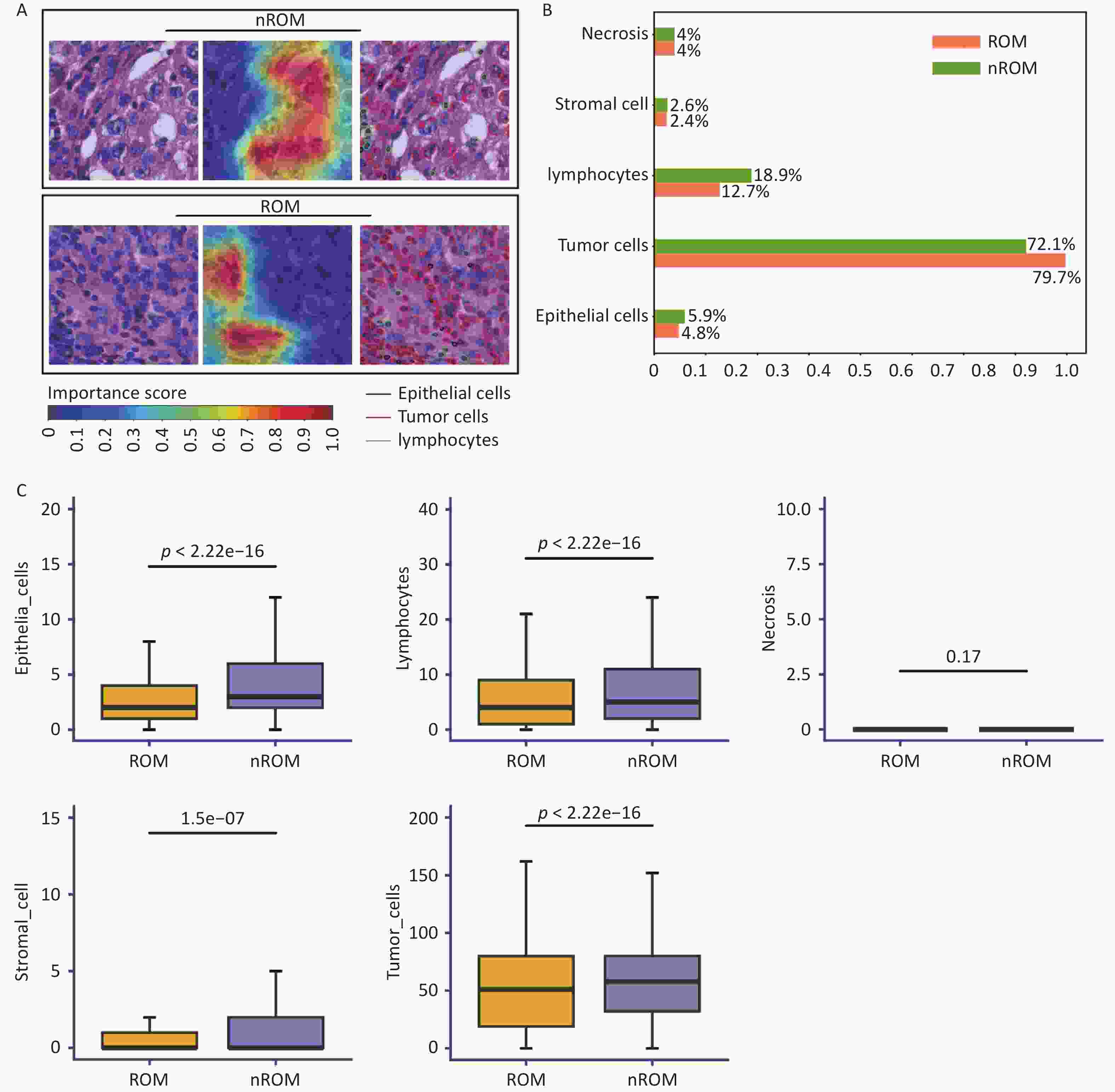 Using HoVer-Net, we further performed cell segmentation and classification (Figure 5a) and identified five major types of cells: tumor, lymphocytes, stromal, epithelial, and necrotic (Figure 5B). To examine the relationship between cellular composition and ROM, we conducted a Wilcoxon rank-sum test comparing patients with ROM and nROM (Figure 5C). The results revealed that ROM patients had significantly lower lymphocyte counts compared to nROM patients (P < 0.05). This difference was also visually evident in the HoVer-Net segmentation outputs (Figure 5a). Furthermore, we compared the relative abundance of lymphocytes with other cell types within prognostically relevant regions. The ratios of lymphocytes to tumor, stromal, epithelial, and necrotic cells were significantly higher in the nROM group than in the ROM group (all P < 0.05) (Supplementary Figure S4). Overall, these findings enhance the interpretability of our prediction model by linking histopathological morphology to biologically meaningful variations in the tumor immune microenvironment associated with recurrence and metastasis in early-stage TNBC.