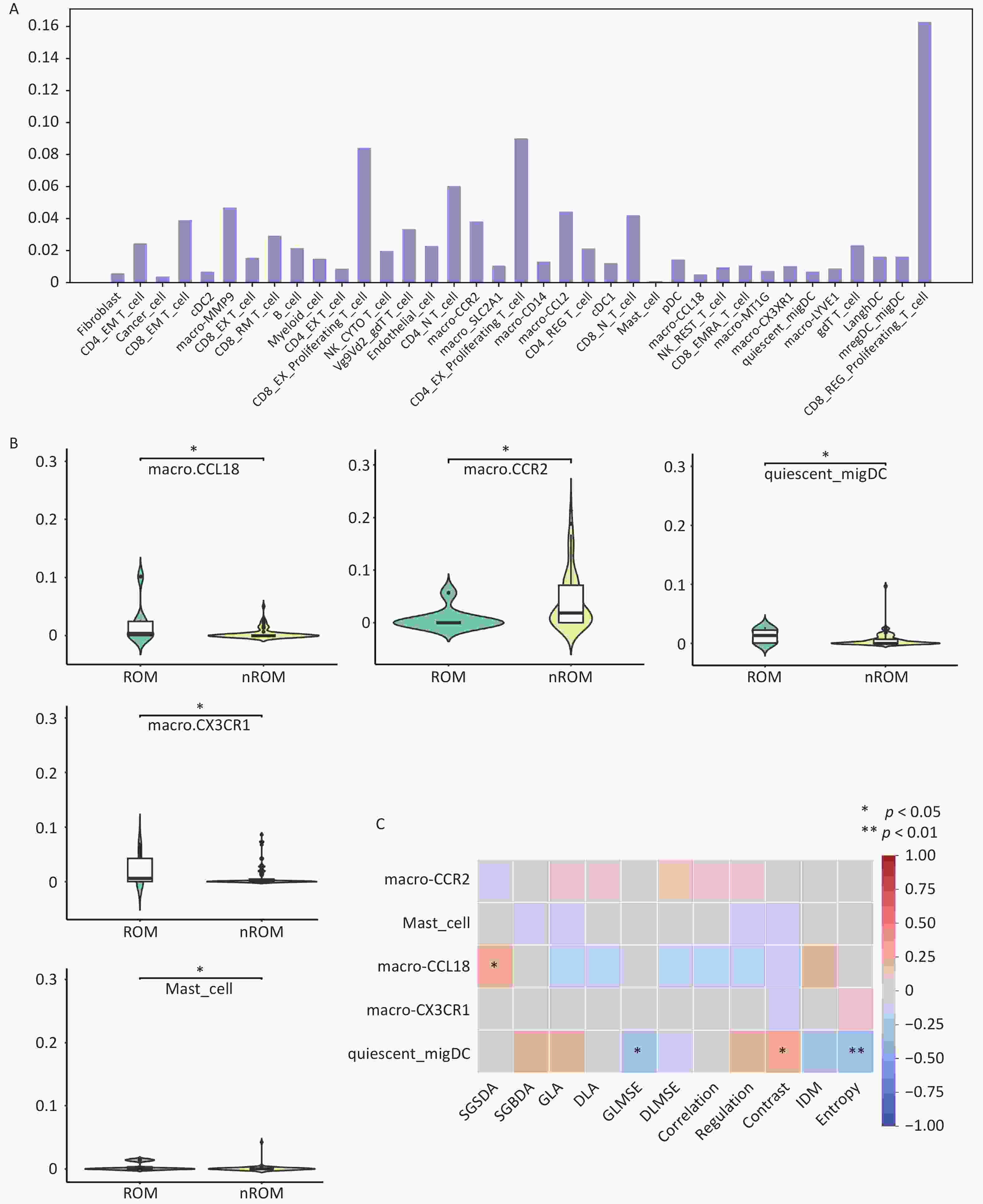 In the TCGA cohort, based on mRNA sequencing data, the CIBERSORT deconvolution algorithm was used to estimate the relative proportions of immune cell populations and subtypes within each sample, including T cells, B cells, macrophages, mast cells, and dendritic cells (DCs) (Figure 6A). Differential analysis identified significant differences (P < 0.05) in the proportions of three macrophage subtypes, one dendritic cell subtype, and mast cells between patients with ROM and those with nROM (Figure 6B). Specifically, the ROM group exhibited elevated levels of macro-CCL18 and quiescent_migDC cells, suggesting a potential role for these immune subsets in promoting poor prognosis. In addition, to ensure robustness, we performed complementary validation using the xCell algorithm. Owing to inherent differences in immune cell type definitions between CIBERSORT and xCell, the xCell-based results further supported our findings, revealing a significant increase in M2 macrophages and a decrease in M1 macrophages within the ROM group (Supplementary Figure S5). Notably, the macro-CCL18 population, identified in this study, corresponded to the M2 macrophage phenotype, thereby providing biological validation from an independent analytical perspective. Using the WMCM method, we extracted 11 texture features from the pathological images in the TCGA external validation cohort and examined their associations with patient prognosis. Significant differences (P < 0.05) were observed in several texture parameters, including SGSDA, SGBDA, GLA, Regulation, Contrast, IDM, and Entropy, between the ROM and nROM groups (Table S2).
