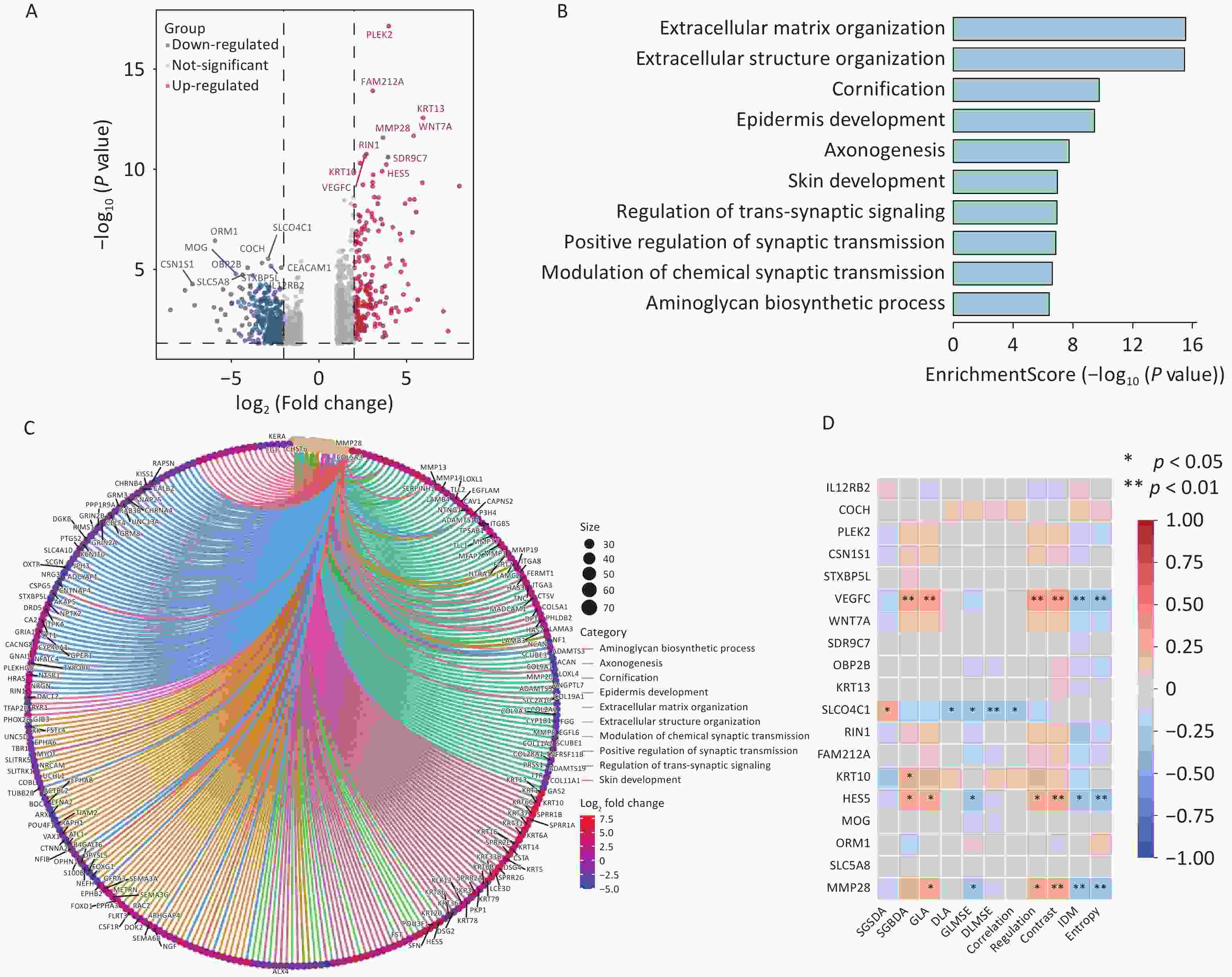 Several genes associated with poor prognosis were significantly upregulated in the ROM group, including MMP28 (involved in aminoglycan biosynthesis) as well as VEGFC, KRT13, KRT10, and HES5 (markers of epidermal differentiation). Given the limited evidence regardingreports of HES5 in the TNBC literature, we performed external validation using two independent TNBC datasets from the GEO database, both of which confirmed a consistent trend of upregulation (Supplementary Figure S6). All identified DEGs were subjected to GO functional enrichment analysis, which revealed that genes upregulated in the ROM group were primarily enriched in pathways related to extracellular matrix organization, extracellular structure formation, epidermal differentiation, synaptic signaling, and aminoglycan biosynthesis (Figure 7B, C). We then examined the correlations between image-derived texture features and the expression of key upregulated genes. Notably, the expression levels of VEGFC, HES5, and MMP28 in ROM patients showed significant associations with specific texture features, including GLA, Regulation, Contrast, IDM, and Entropy (Figure 7D).