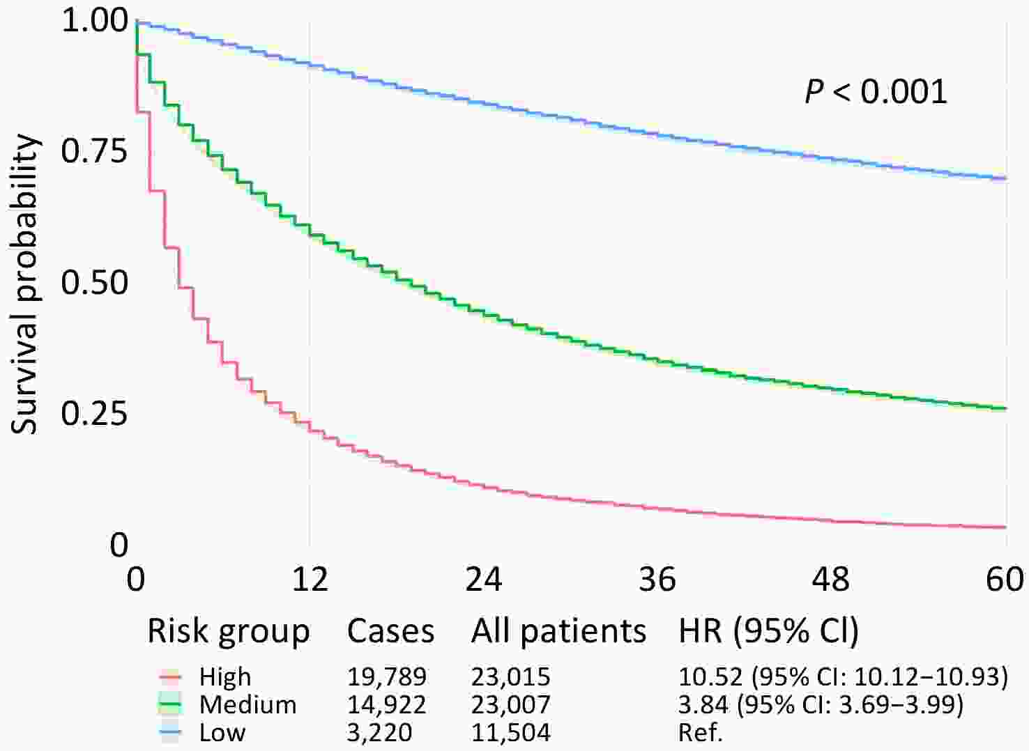 These findings have significant clinical implications. Patients in the high-risk group had a 10.52-fold higher risk of dying from PLC within 60 months than those in the low-risk group. The medium-risk group showed a 3.84-fold increase in the risk. This stratification provides valuable information for clinical practice. For instance, patients identified as low risk might be candidates for more conservative treatment strategies or less intensive surveillance, thereby avoiding the risks and costs of overtreatment. Conversely, patients stratified into the high-risk group should be prioritized for more aggressive therapeutic regimens, closer follow-up, and consideration for enrollment in clinical trials exploring novel treatment options. To illustrate, consider a 60-year-old, married, non-Hispanic White female residing in a metropolitan area with an annual household income of ≤$90,000. She was diagnosed with localized HCC and treated within two months, without surgery, radiotherapy, or chemotherapy. This model calculated her 60-month PLC-specific mortality probability to be 0.5933, placing her in the medium-risk category, which will help guide discussions on the intensity of her future care.