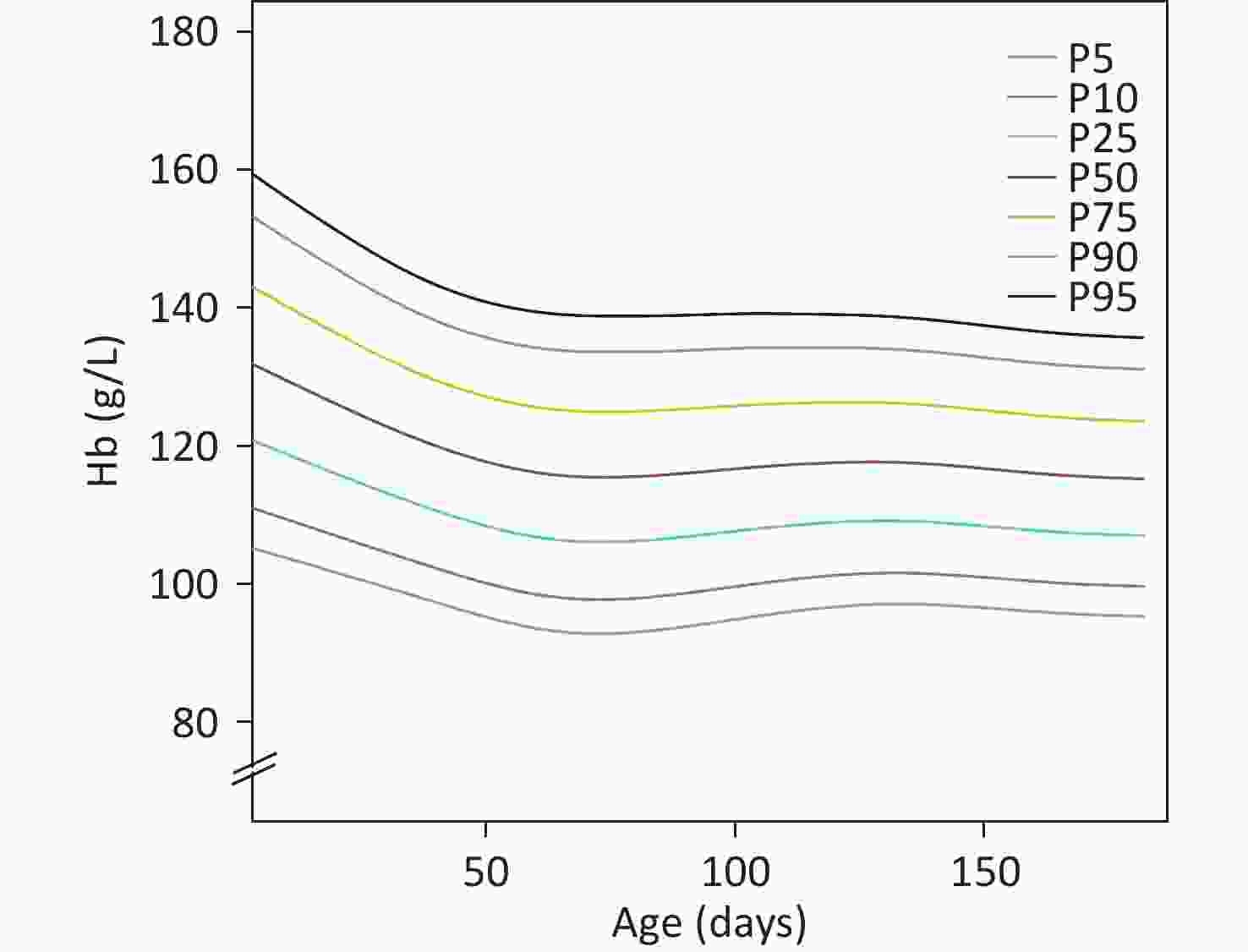 Figure 2. Smoothed hemoglobin percentile curves for infants aged 0–180 days in the analytical sample.