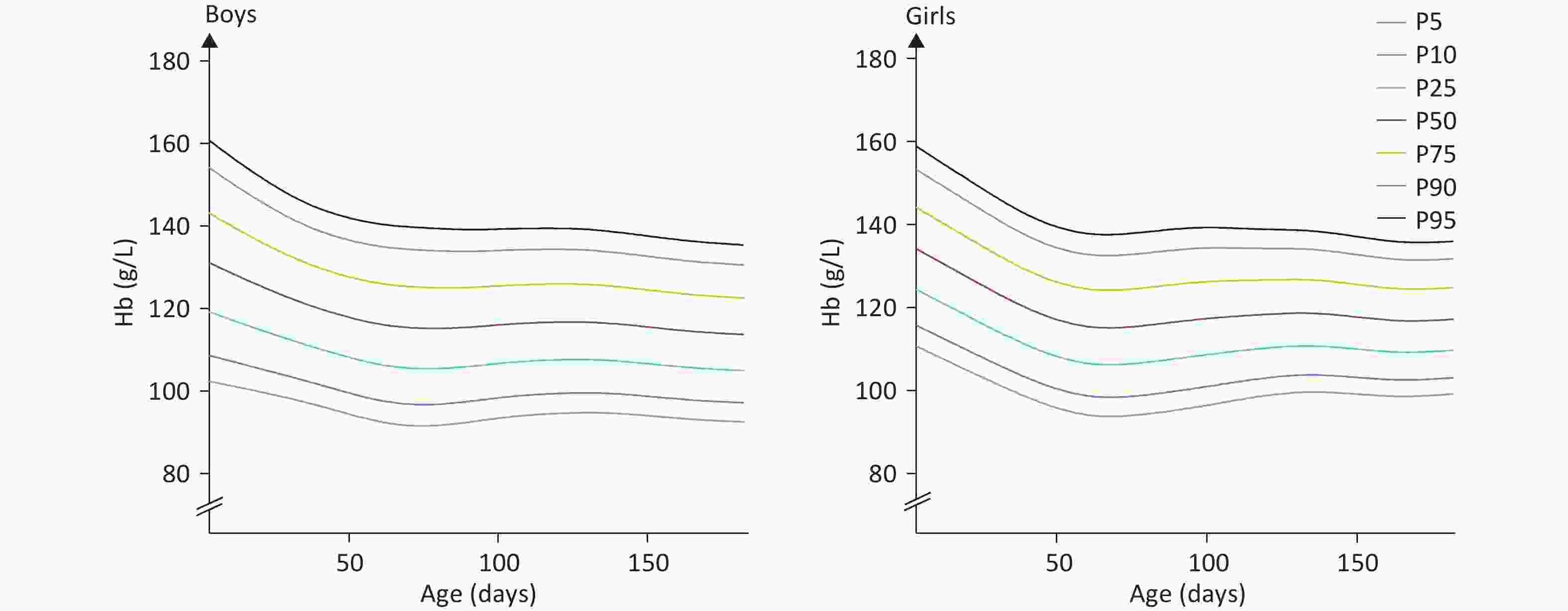 Figure 3. Sex-specific smoothed hemoglobin percentile curves for infants aged 0–180 days in the analytical sample.