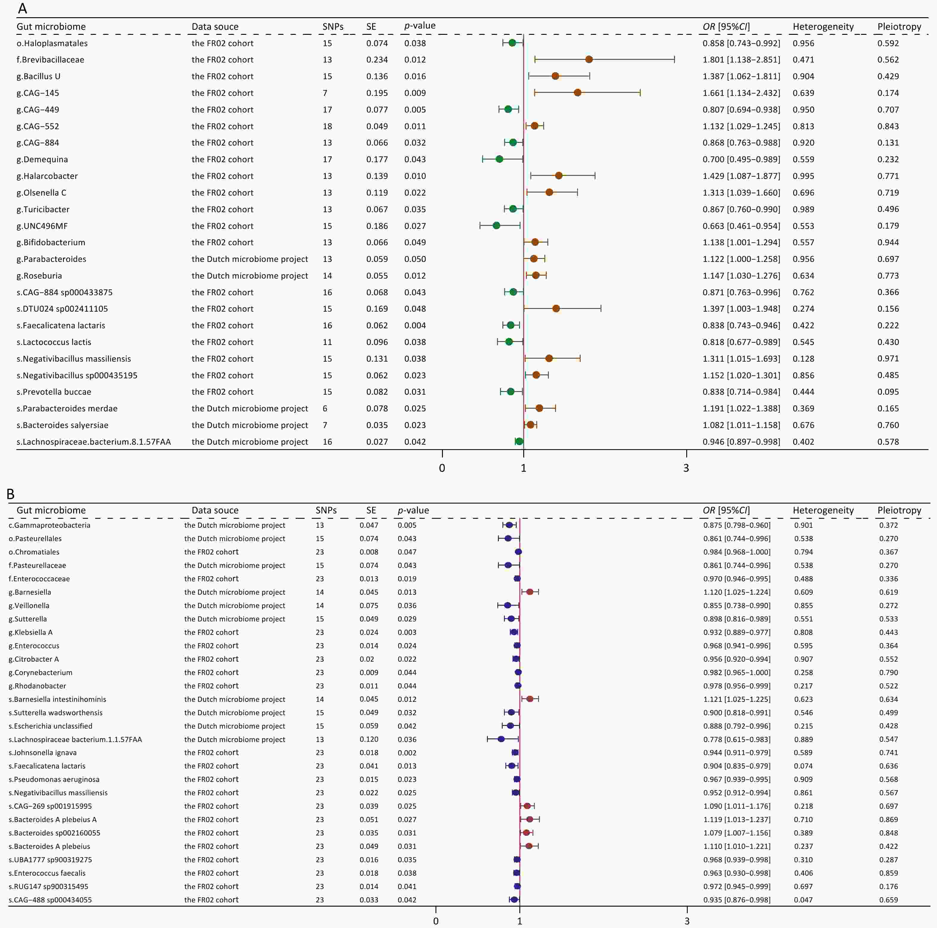Figure 2. Forest plot of bidirectional causal effects between gut microbial taxa and MAFLD (P < 0.05). (A) Causal effects of gut microbial taxa on MAFLD; (B) Causal effects of MAFLD on gut microbial taxa. SNPs, number of SNPs; SE, standard error of coefficient estimate; P-value, the P-value of causal estimation in the IVW method; OR [95% CI], odds ratio and 95% confidence interval; Heterogeneity, the P-value of heterogeneity analysis; Pleiotropy, the P-value of horizontal pleiotropy analysis.