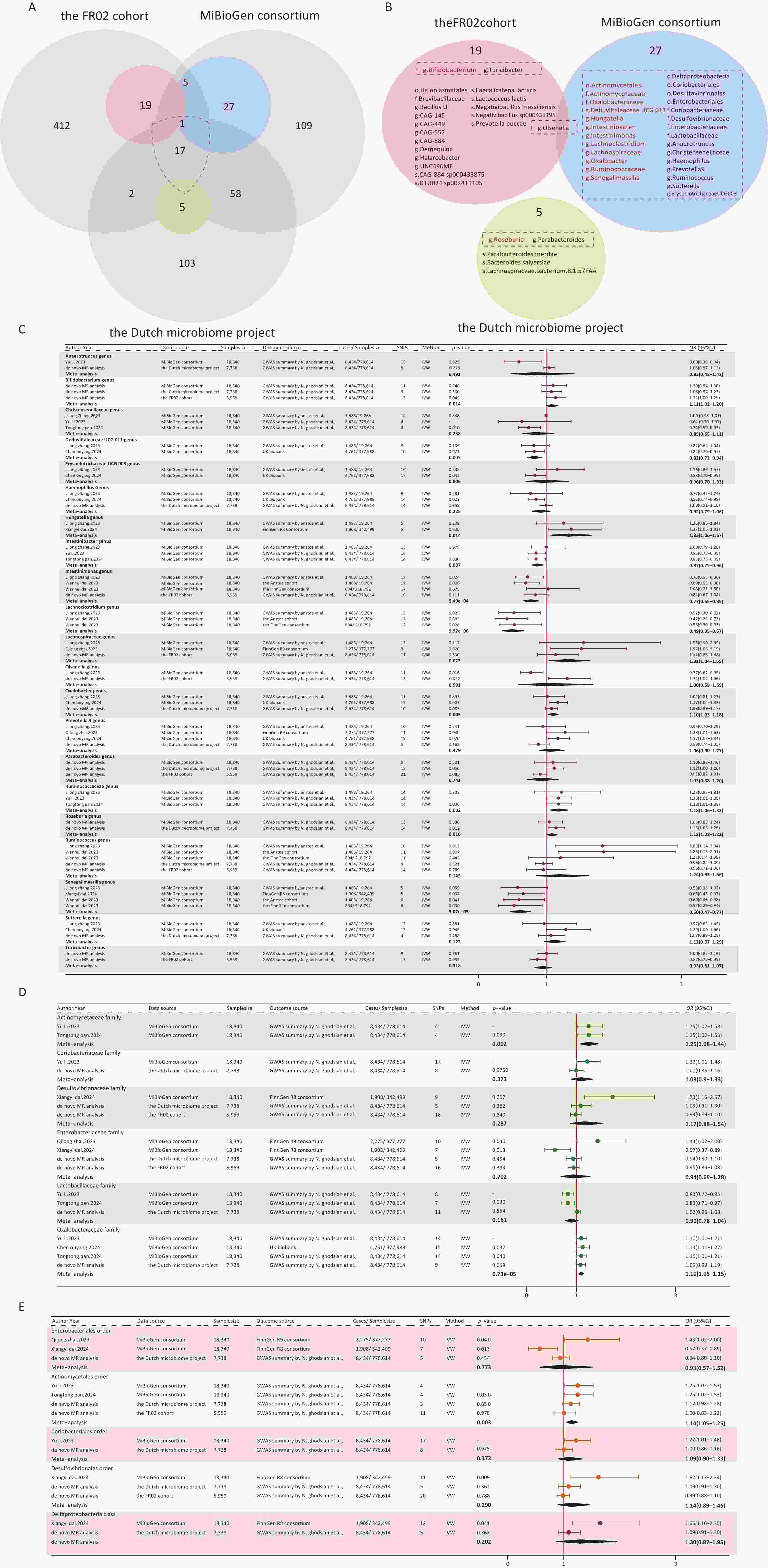 Figure 3. Forest plot of the meta-analysis of gut microbial taxa and MAFLD. (A) Intersection of three gut microbiome datasets. Grey circles: taxa not significantly associated with MAFLD. Blue, pink, green circles: taxa significantly associated with MAFLD. (B) Overall meta-analysis results, the gut microbiota in the dashed boxes were included in the meta-analysis. Red: consistently statistically associated with MAFLD after meta-analysis. Black: not significantly associated after meta-analysis. (C) Meta-analysis forest plot at the genus level. (D) Meta-analysis forest plot at the family level. (E) Meta-analysis forest plot at the order and class level. Source, gut microbial taxa; SNPs, number of SNPs; P-value, the P-value of causal estimation in the IVW method; OR [95% CI], odds ratio and 95% confidence interval.