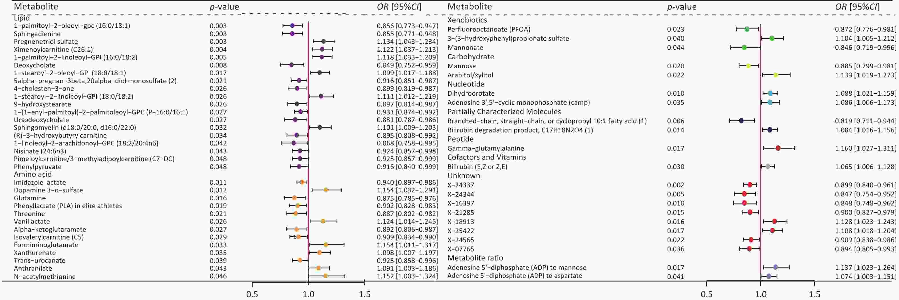 Figure 4. Forest plot of causal effects of blood metabolites on MAFLD. Plasma metabolites encompass a diverse array of substances, including lipids, amino acids, xenobiotics, nucleotides, cofactors, and vitamins, as well as carbohydrates, peptides, partially characterized molecules, and unidentified compounds. Additionally, two metabolite ratios are identified. P-value, the P-value of causal estimation in the IVW method; OR [95% CI], odds ratio and 95% confidence interval.