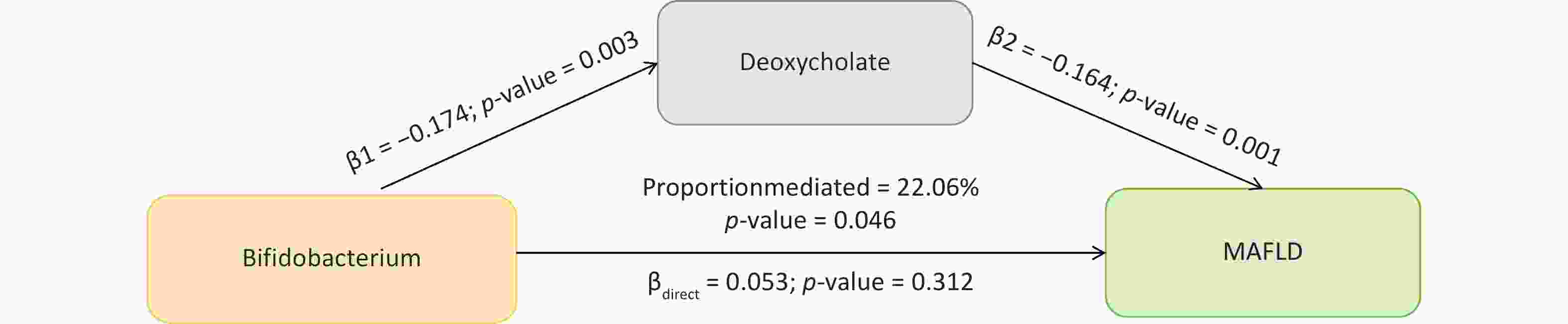 In the mediation analysis, we confirmed the mediating role of deoxycholate between Bifidobacterium and MAFLD (mediation effect = 0.028, 95% CI: 0–0.056, P = 0.046), accounting for 22.06% of the total effect and underscoring the critical role of bile acid metabolism in MAFLD pathogenesis (Figure 5). Additionally, other associations were noted; however, their effects did not reach statistical significance.