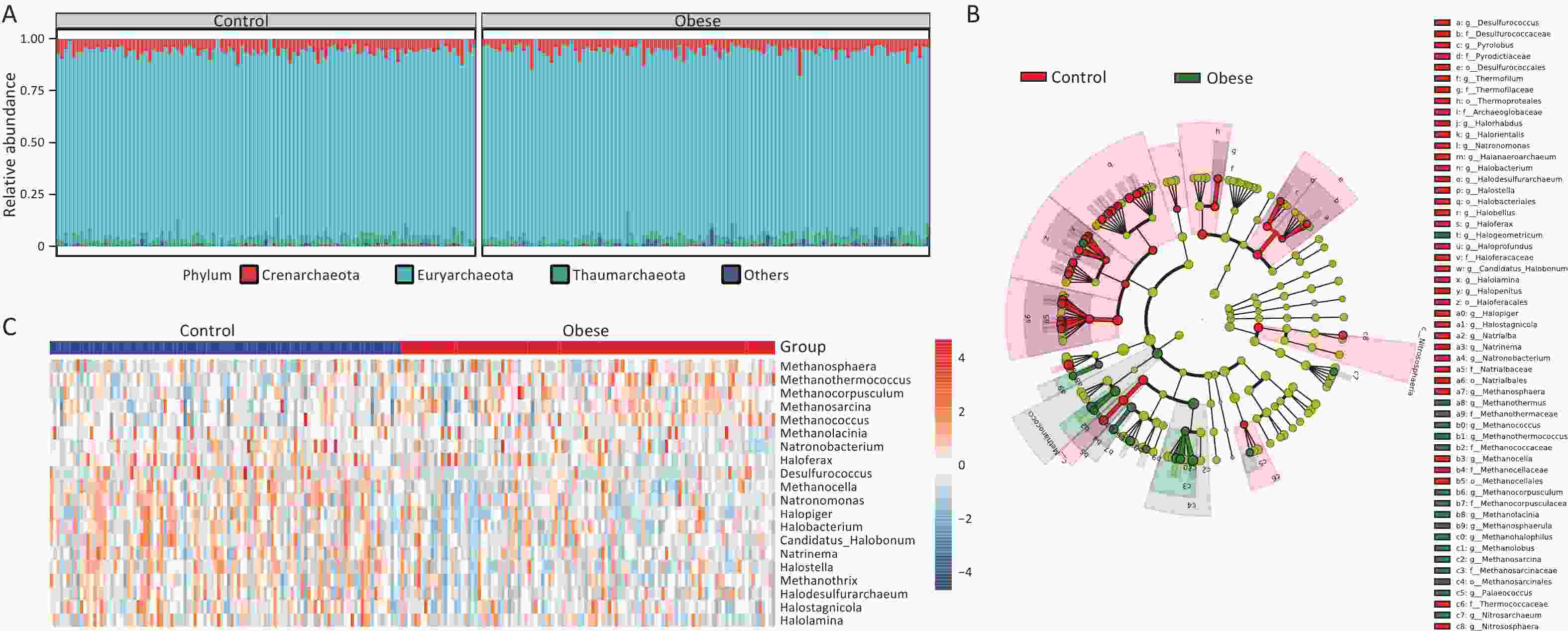 Figure 2. Gut archaeal taxonomic composition of obese subjects remarkably differs from lean controls. (A) Relative abundance of gut archaeal phyla. (B) Cladogram showing different archaeal compositions in the taxonomic lineage. (C) Heatmap showing log transform fold changes of the differential gut archaeal genera for obese subjects compared with lean controls in the discovery cohort. Groups were compared using LEfSe (Linear discriminant analysis Effect Size). The top 20 genera measured by LDA (linear discriminant analysis) effect size were selected for visualization.