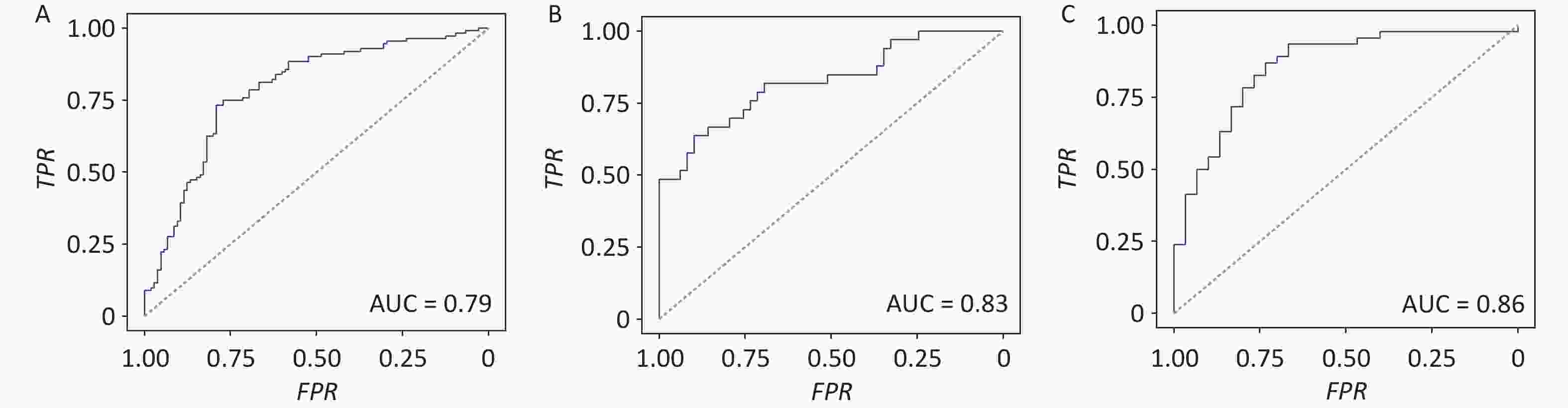 Figure 3. Gut archaeal genera classify obese subjects from lean controls. Predict model for (A) discovery cohort. Predict model for validated cohorts (B) PRJNA597839 and (C) PRJEB1786. Models were trained by the top 20 genera filtered by LDA values from the discovery cohort. Receiver operating characteristic (ROC) curves showing discrimination between obese and lean subjects based on 20 archaeal genera (AUC = 0.79, 0.83, and 0.86 in Cohorts 1–3, respectively).